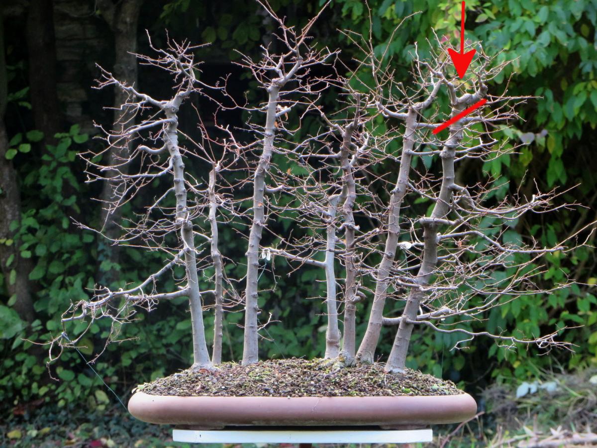 En rabaissant la cime de cet arbre et en laissant filer un peu celle de l'arbre central, je pense réaliser une ligne de crête de cette forêt qui soit moins plate .