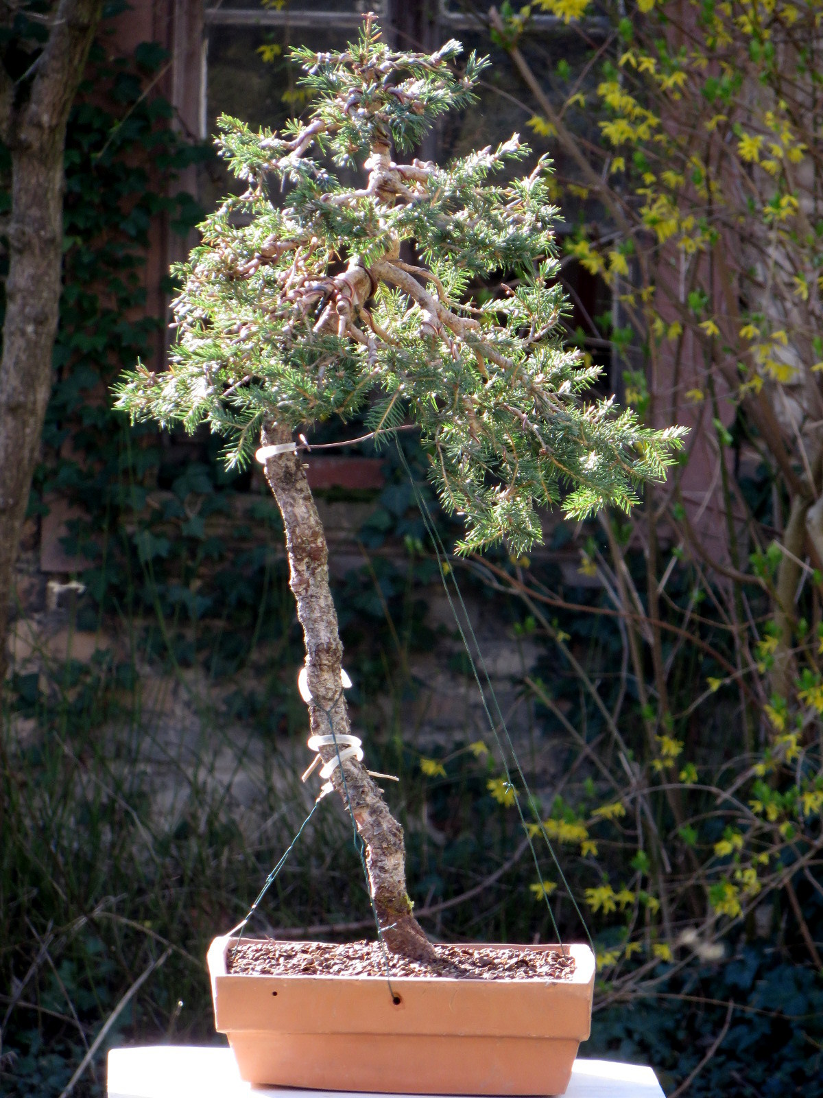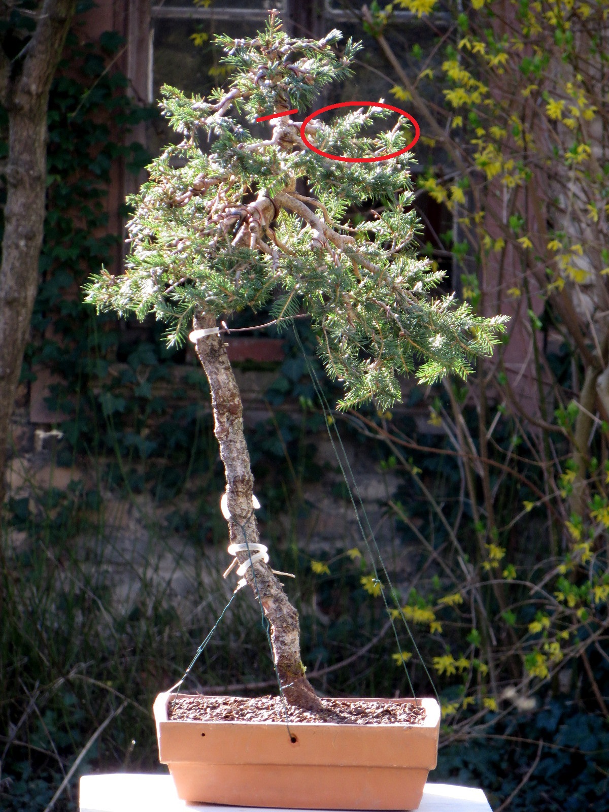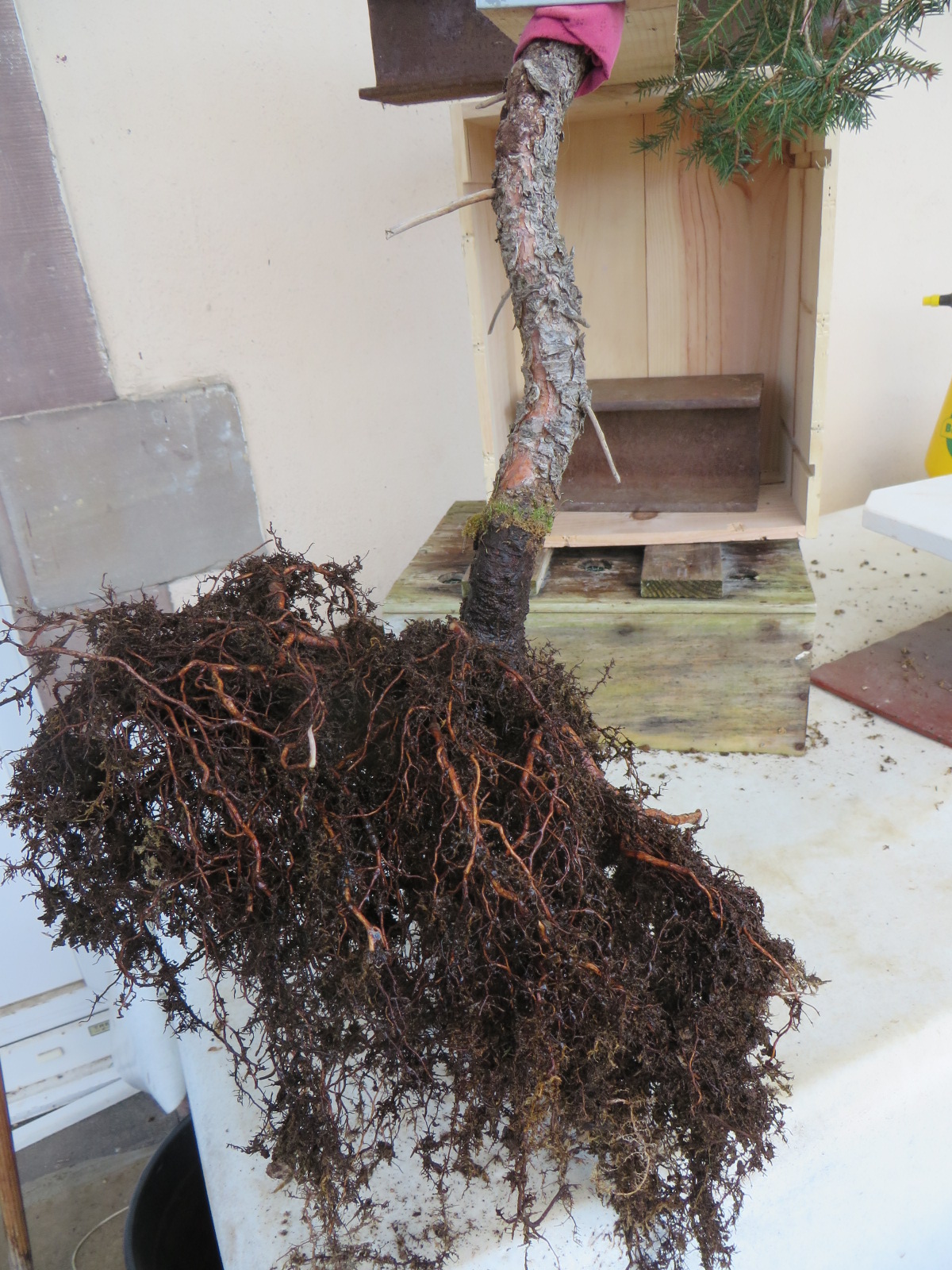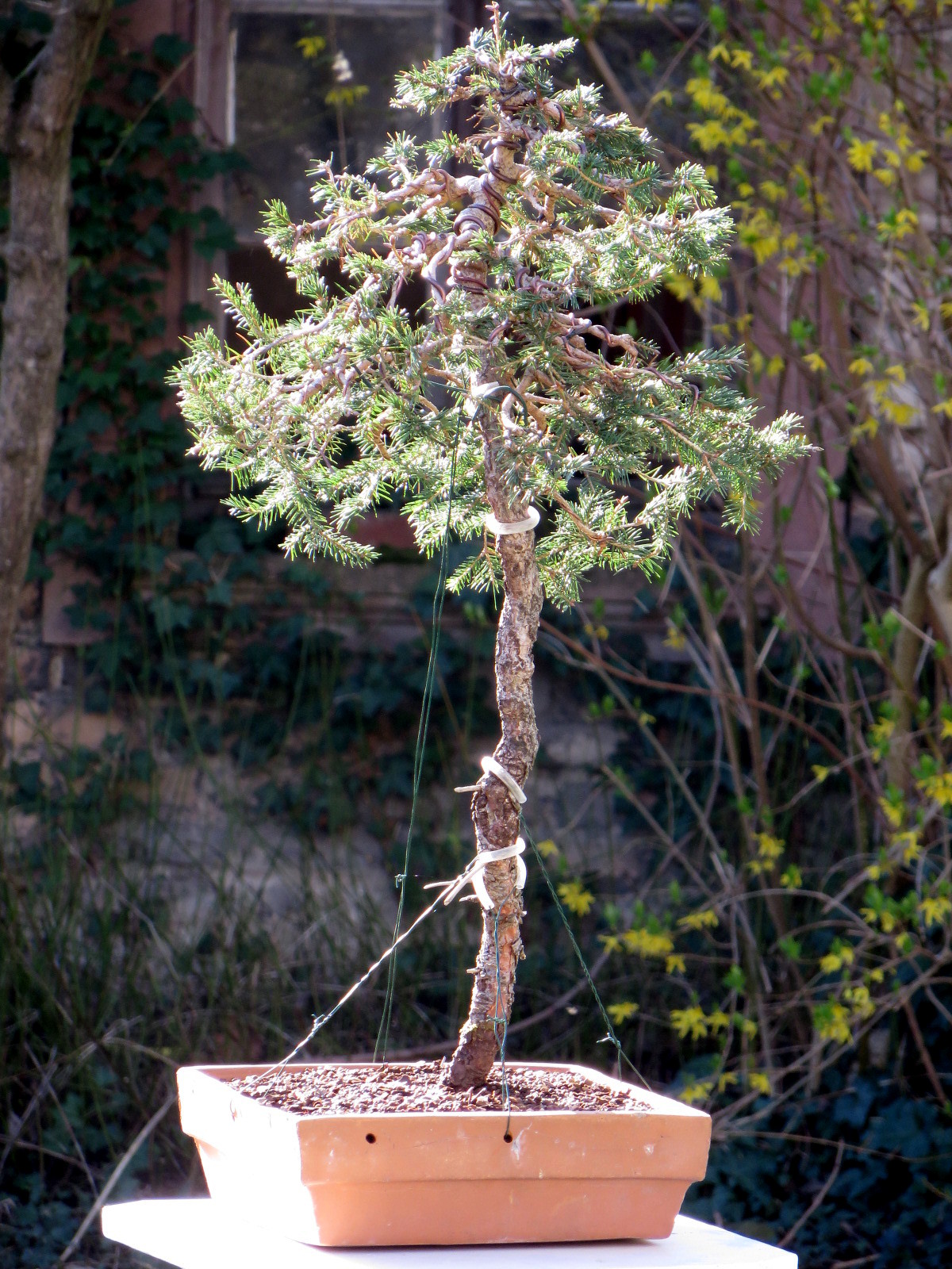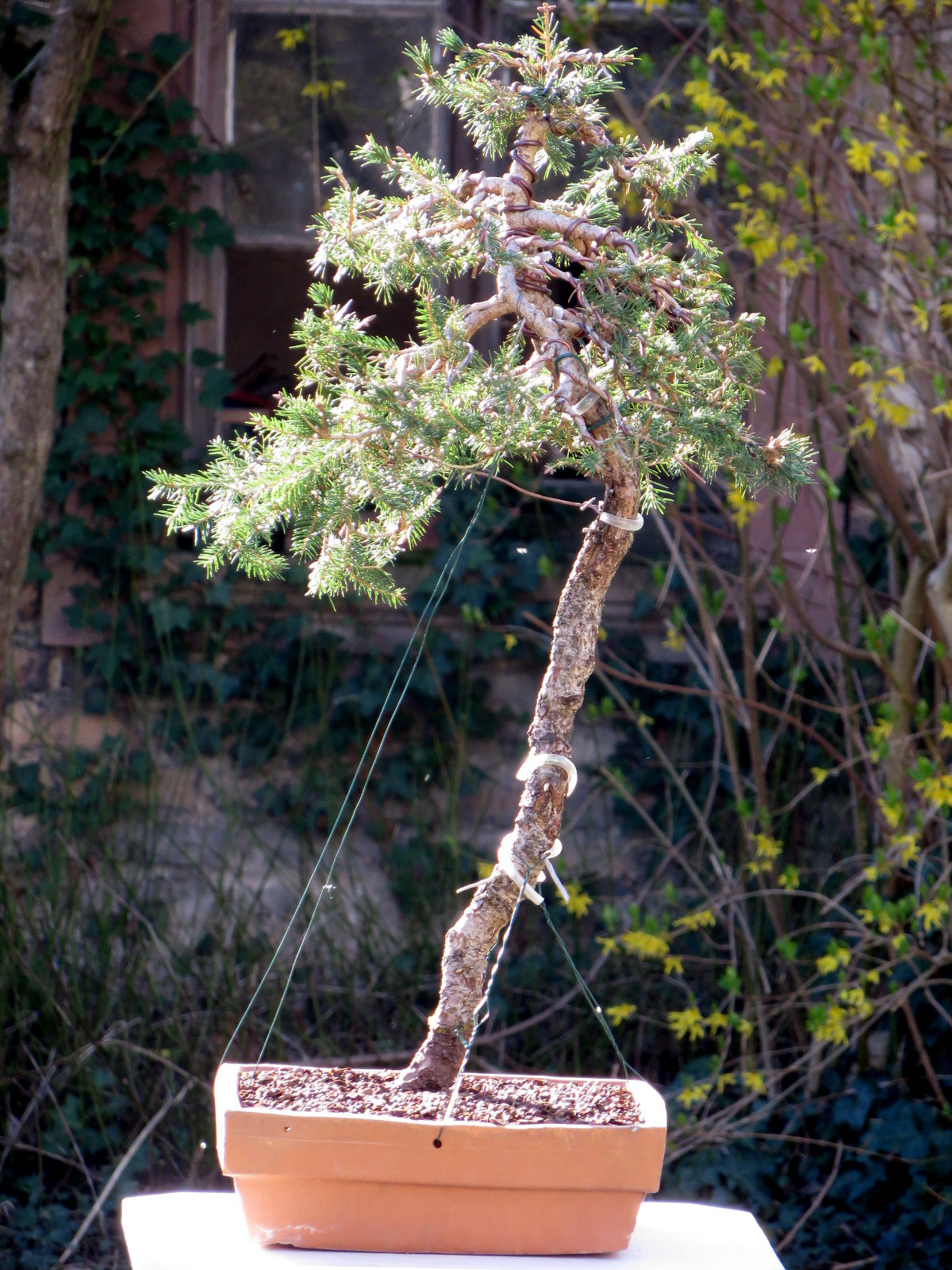 Difficulté supplémentaire : le départ du tronc doit être bien penché et le rester sur ses deux tiers. D'où un déséquilibre avant de pouvoir fixer l'arbre au pot.