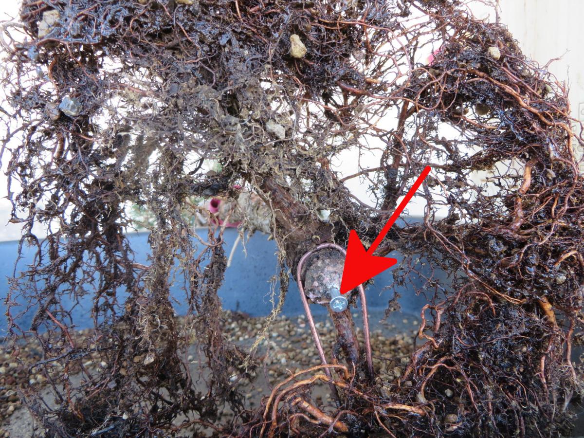 Je vous épargne jurons, gros mots et autres insalubrités au moment de la mise en pot. C'était pas le moment de me demander à prendre des photos. Quant au résultat, malgré tous mes efforts l'arbre ne penchait pas comme je le voulais. Ça n'avais l'air de rien. La raison en était la disposition des 3 racines au départ du nébari – 2 racines principales (A et X sur le schéma) et une moins grosse – et le manque de possibilités pour installer les fils d'ancrage au pot pour sécuriser l'arbre.