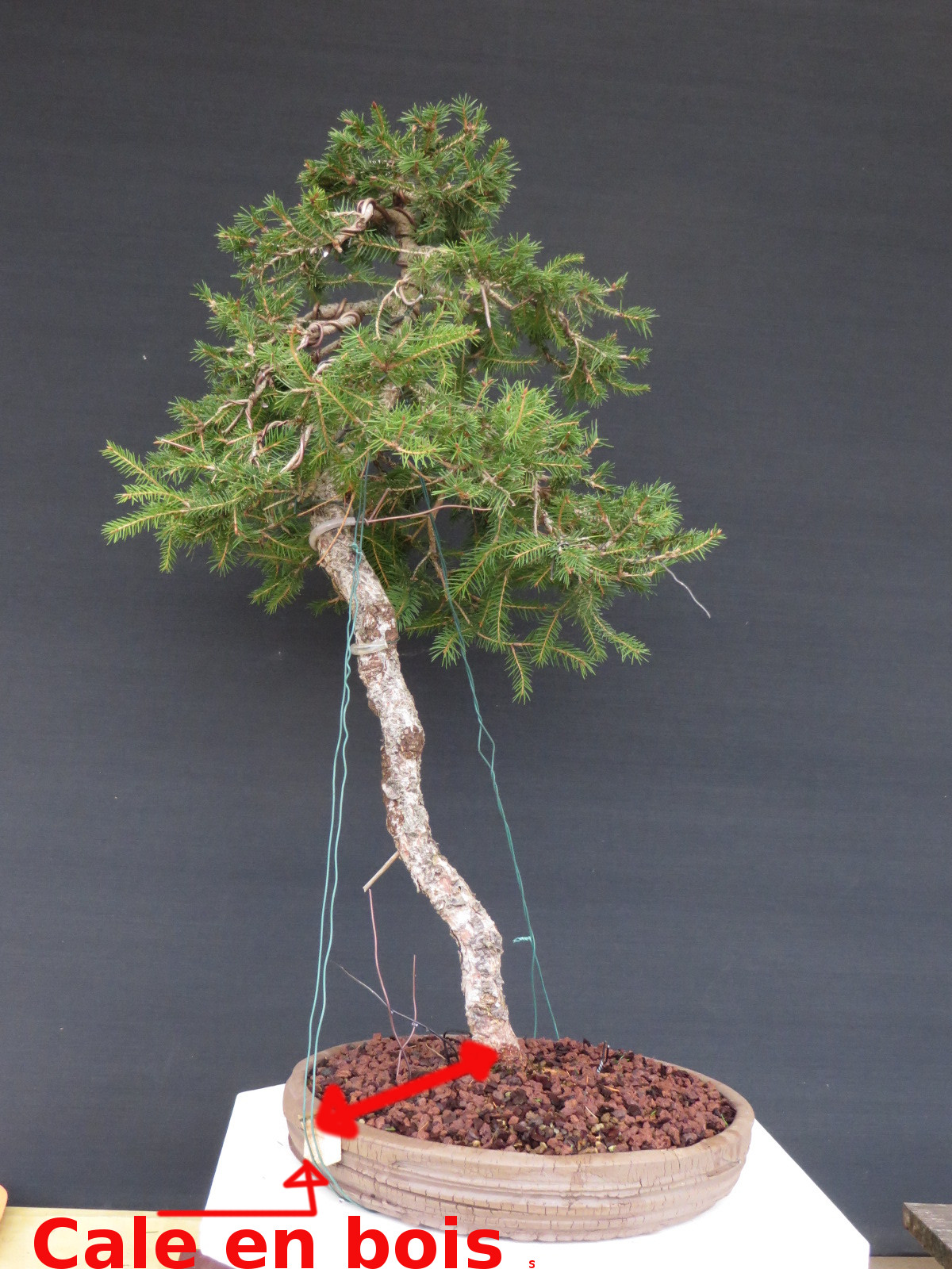 bonsoir phil pour faire un hauban tu peux te servir des trous existants qui sont dans le pot , il te suffit de mettre une vis que tu attaches au fil du hauban et tu attaches ton arbre , avec trois haubans l'arbre ne devrait pas bouger. pour faire un lettré il faut alléger tes plateaux, c'est trop dense , sur le 1er plateau, trop de branches , le 2 eme doit etre plus court et la cime doit etre fine. à+ MICHEL