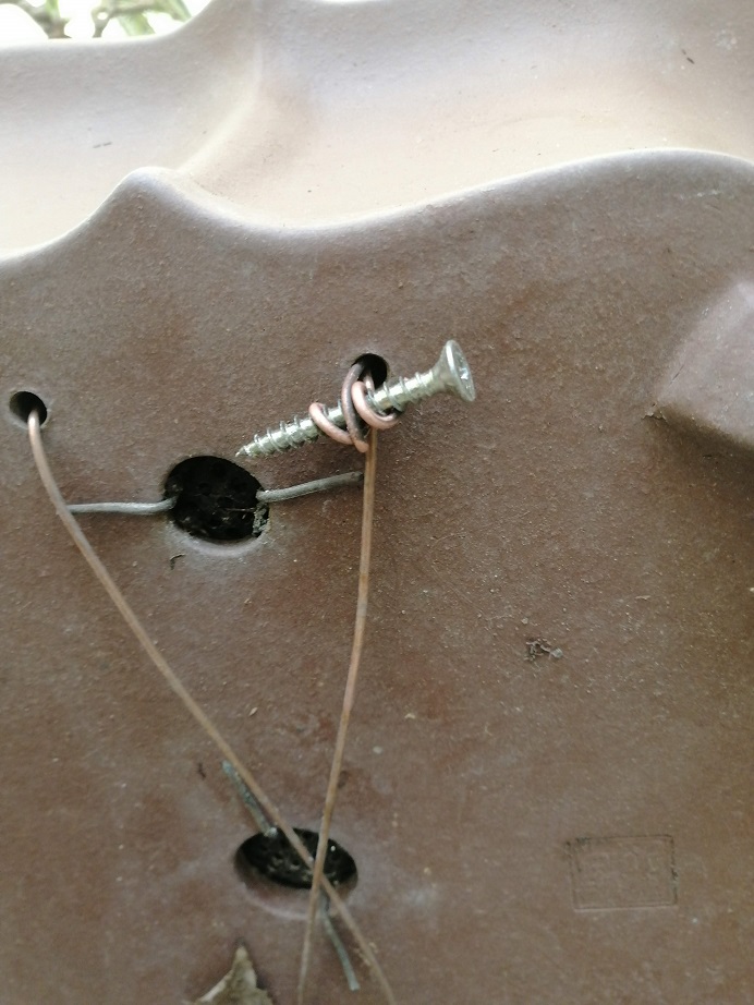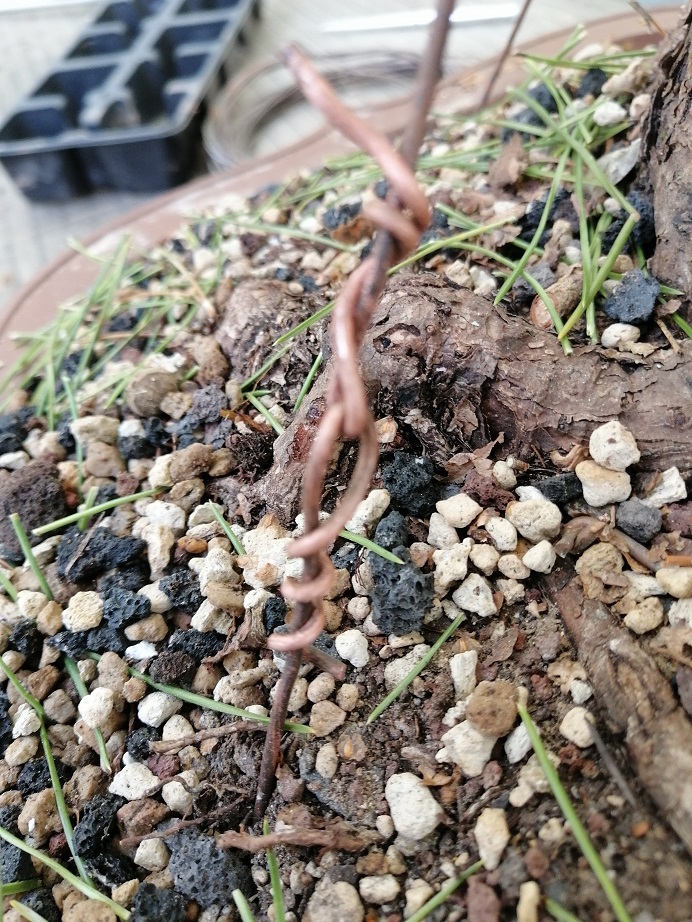 La fixation avec des fils passant dans les trous prévus à cet effet dans le pot n'a pas suffi parce que j'ai supprimé pas mal de racines dans la transposition. L'immobilisation de ce qui restait de racunes ne rendait pas l'arbre assez stable. J'ai donc été obligé à avoir recours à deux haubans extérieurs bien moches