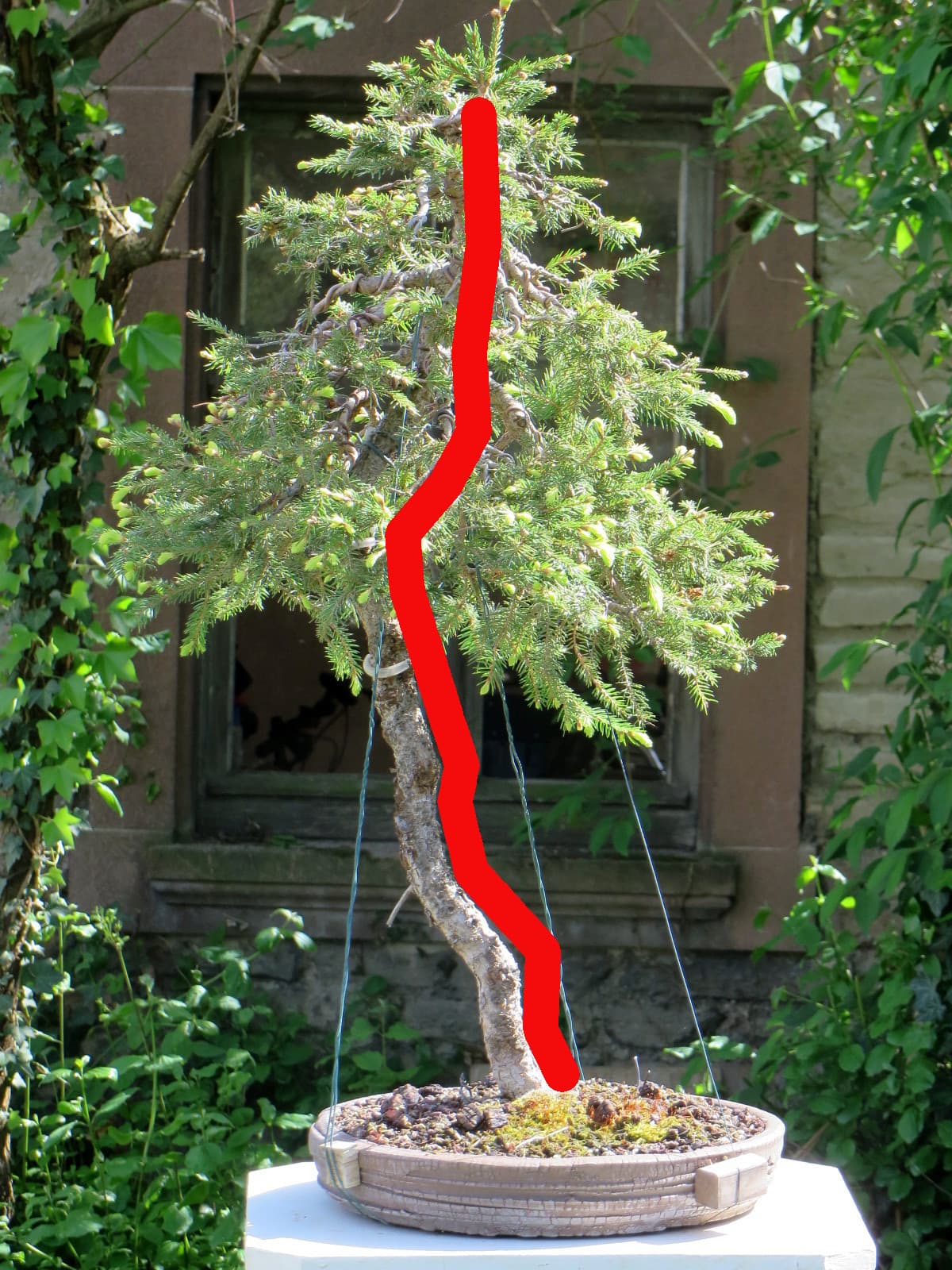 Ensuite, l'arbre se trouve maintenant dans un pot rond : or une rotation même minime de l'arbre par rapport à l'axe de prise de vue change complètement les courbes dans le tronc et les formes de la masse verte.