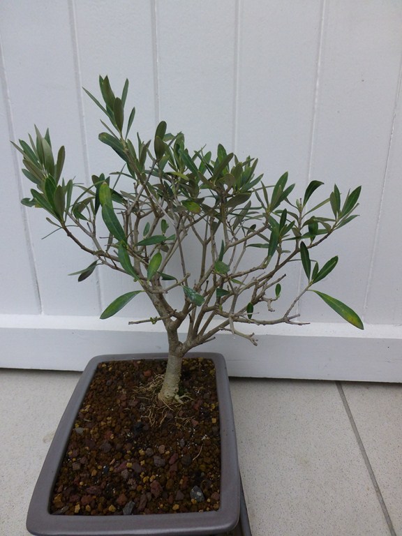 Venons-en maintenant aux fait. En ce moment j’ai quelques plantes à moi mais une seule peut seulon moi prétendre au titre de bonsaï à court terme. Il s’agit d’un olivier commun (Olea europae) que j’ai acheté en mars de cette année pour 13 euros en pépinière et vendu comme "jeune plant" mais j’ai rapidement vu qu’il avait un bon potentielle. Je l’ai rempoté dans la foulée dans un pot à bonsaï assez profond pour servir de caisse de culture mais en plus joli. Je lui donne de l’engrai Biogold tous les deux mois. En ce moment il est en moyenne santé, ni mourant ni pétant la forme car ces feuilles sont parsemées de taches jaunes et certaines sont courbées. Je pense que c’est du à un excès d’eau, ça ne serait pas étonnant après notre merveilleux printemps. Donc si vous avez une solution pour le remettre totalement d’aplomb je l’écoute.