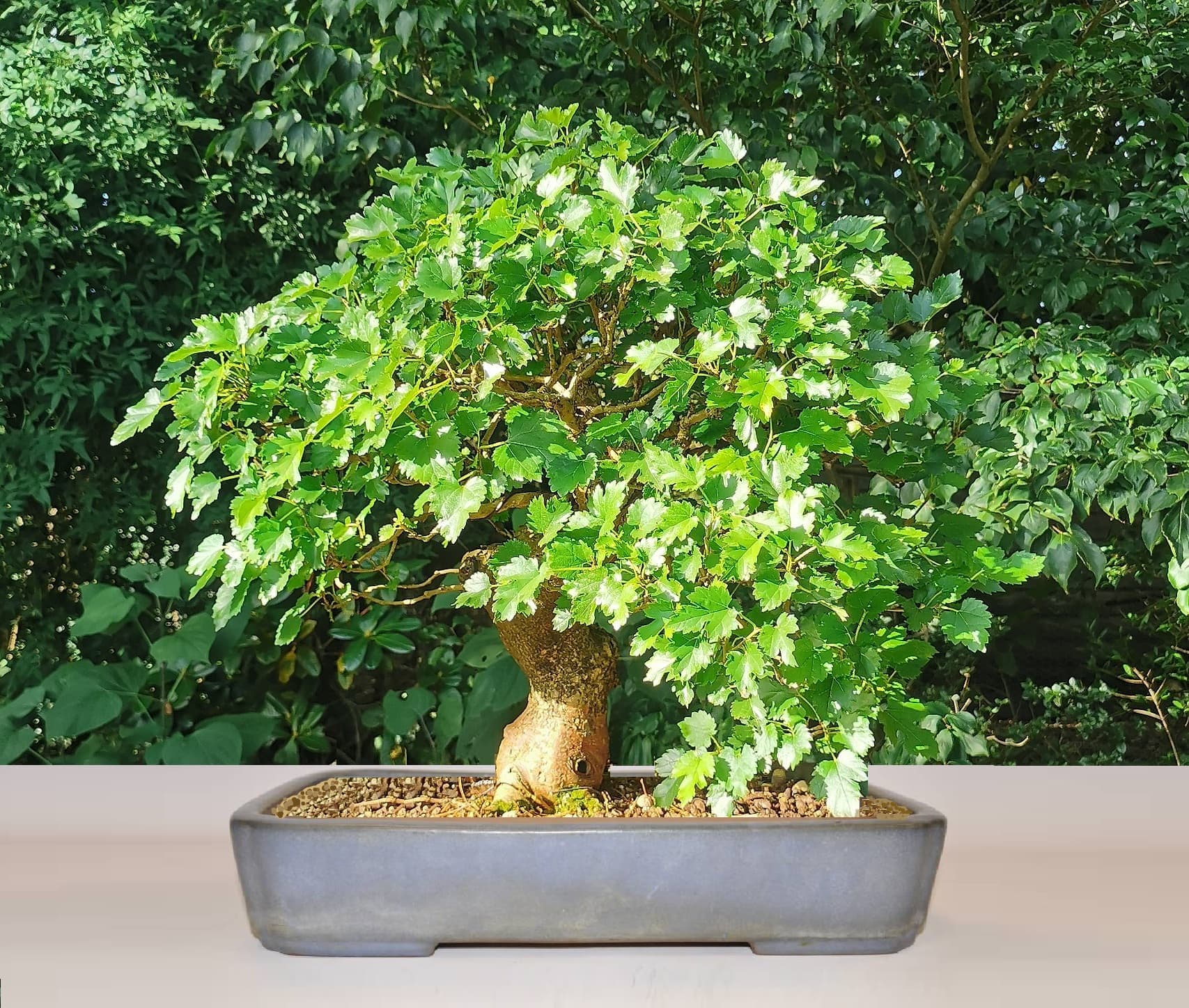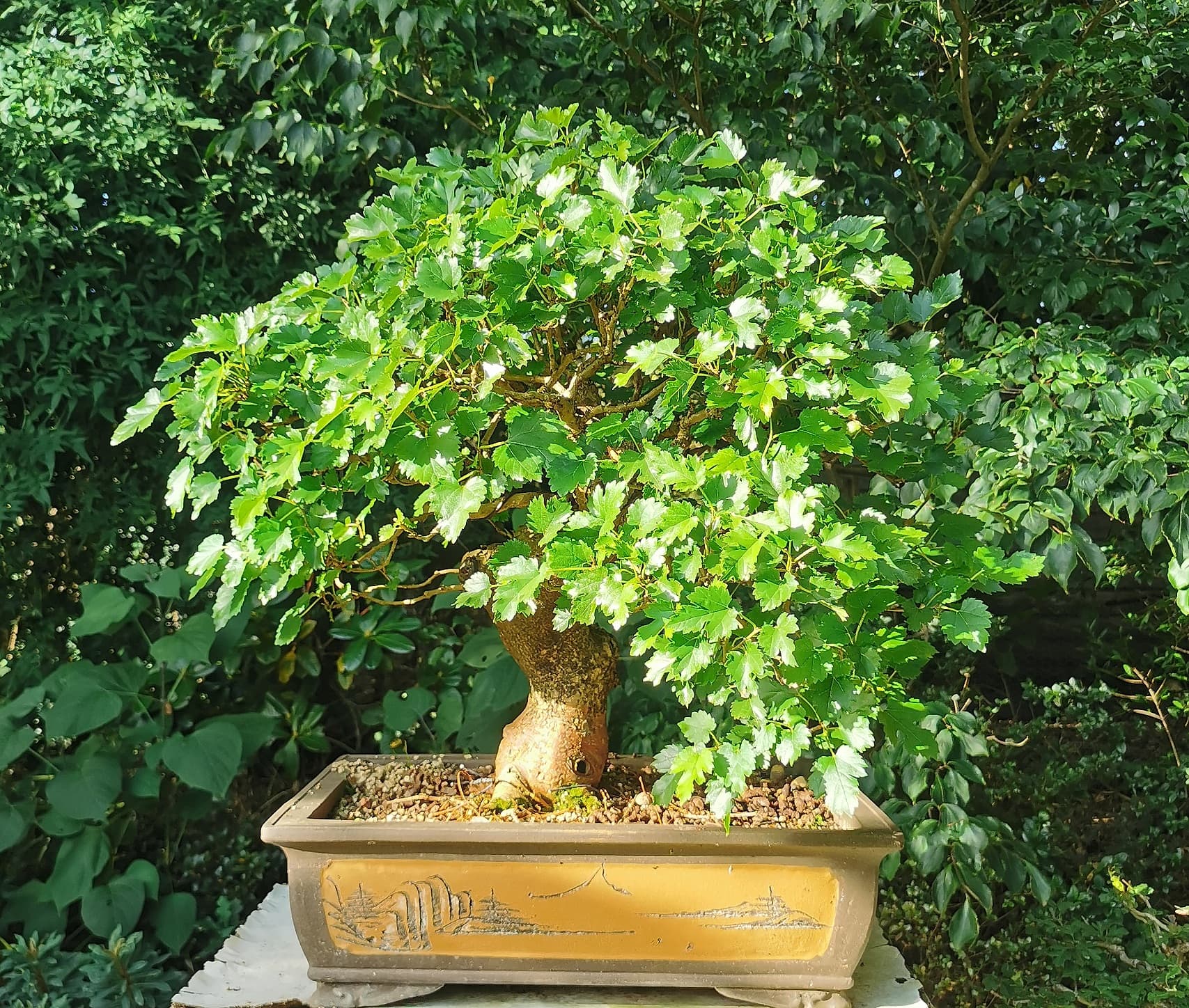 tu décris ton arbre comme étant assez massif, du coup je choisirais plutôt un pot rectangulaire qu’un pot ovale (surtout que c’est pas si souvent qu’on peut utiliser à bon escient un pot rectangulaire, nos arbres étant souvent trop élancés pour ça).
