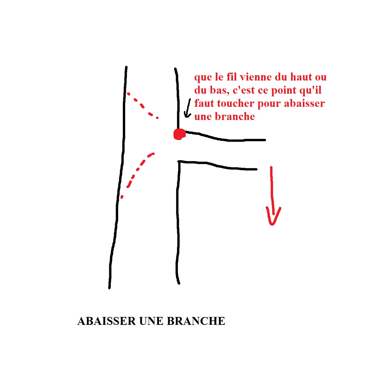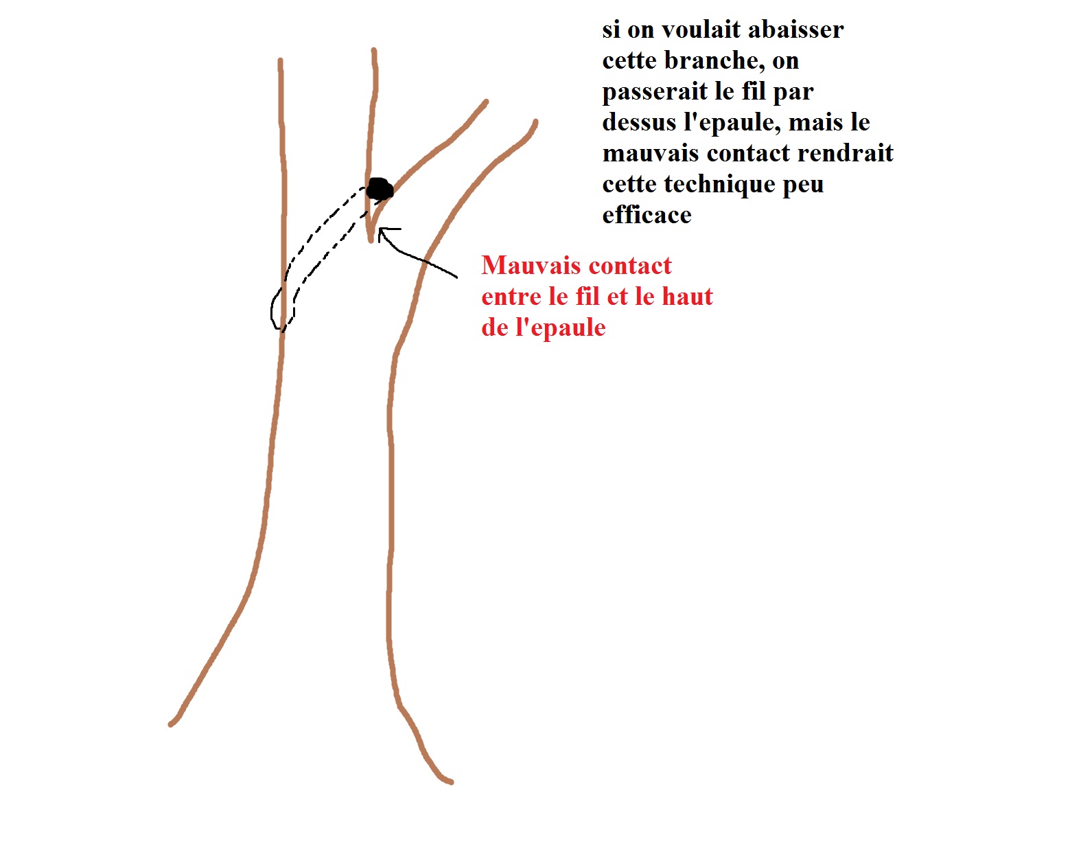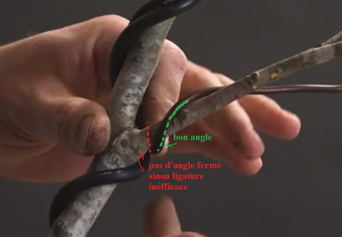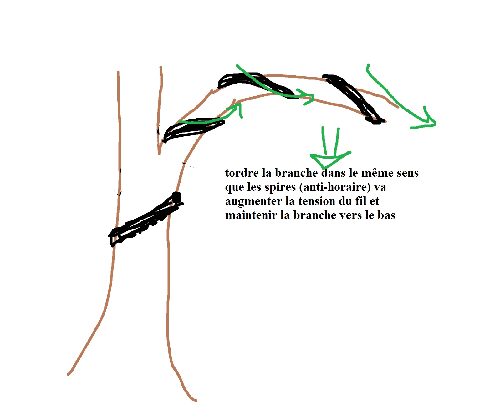 Quand la branche remonte trop, il vaut mieux passer la spire en bas →