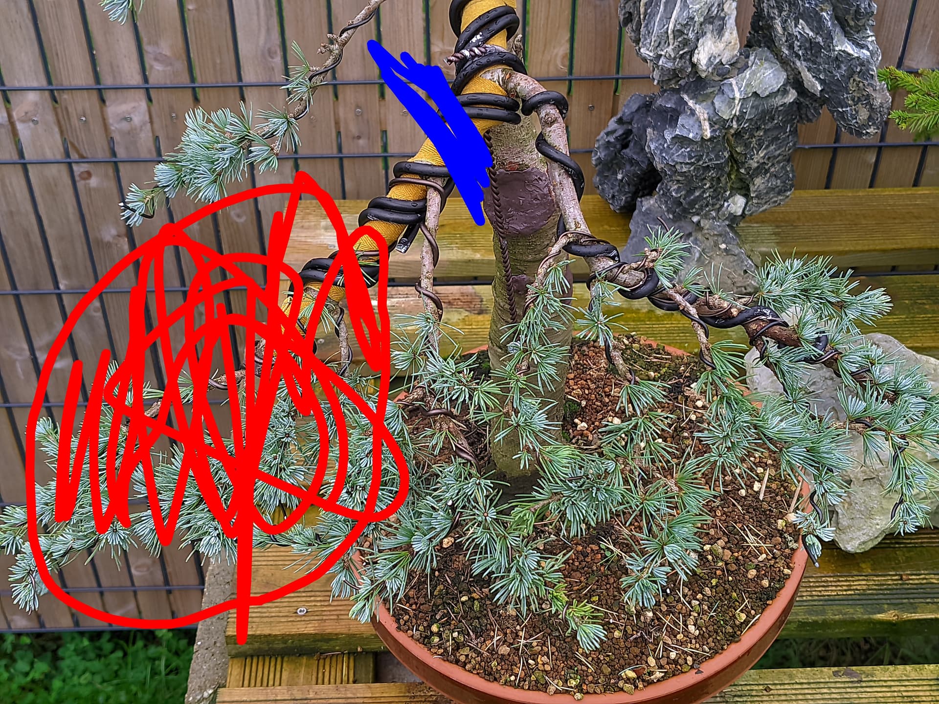 Vous reviendriez jusqu’où sur la première branche ? Perso j’aurais supprimer la première grosse partie, celle couverte de protection. Jusqu’au niveau de la deuxième ramification (en rouge) ou alors, plus drastiquement à la première (en bleu). Je pense qu’il faut que j’enlève de la masse foliaire pour équilibrer un peu.