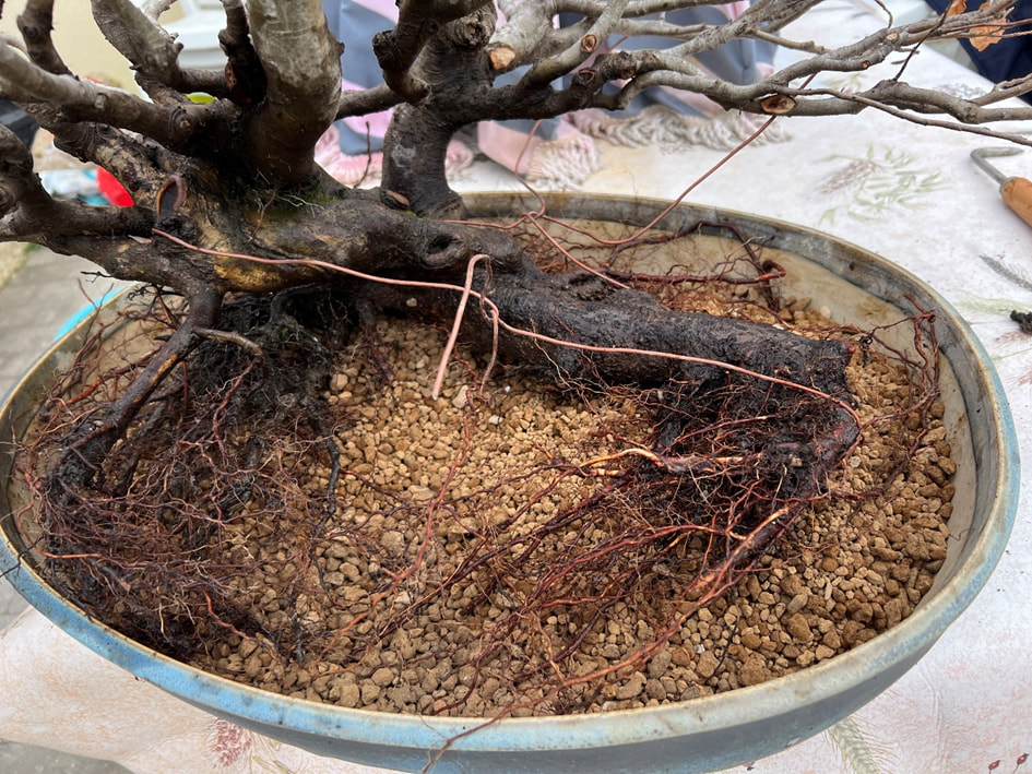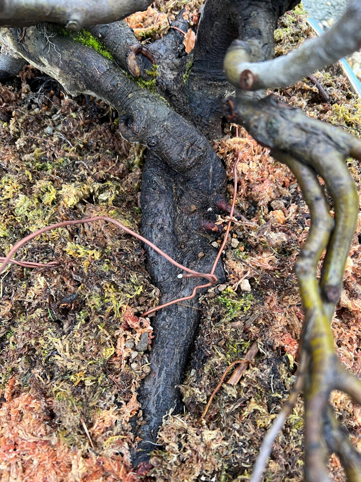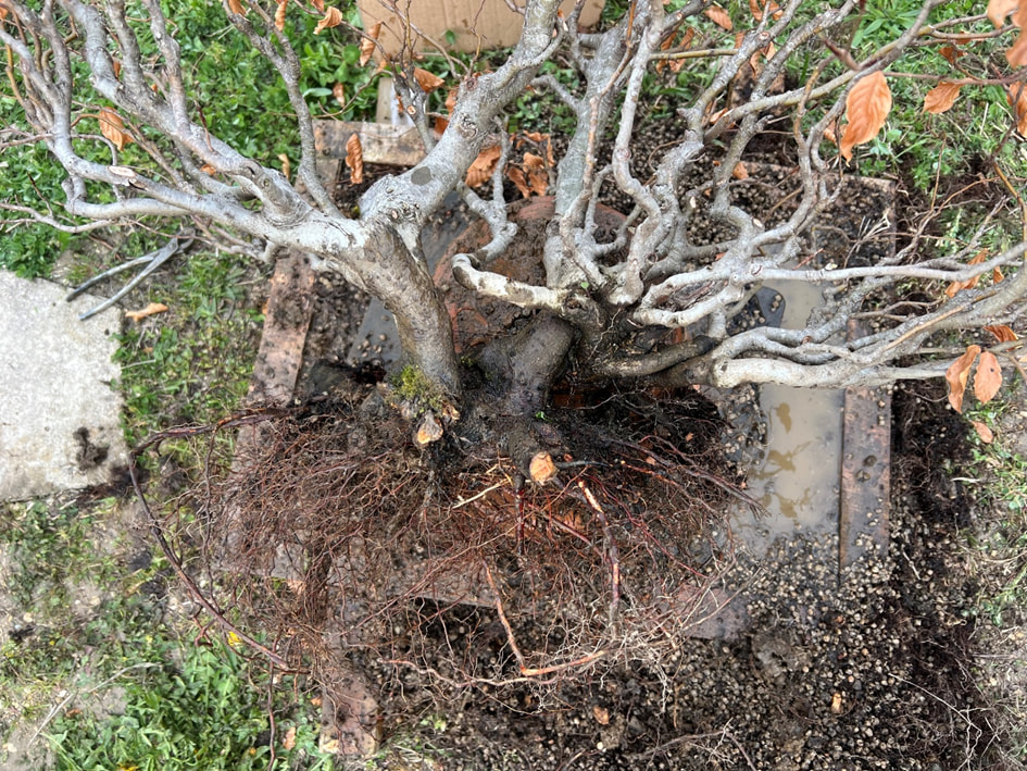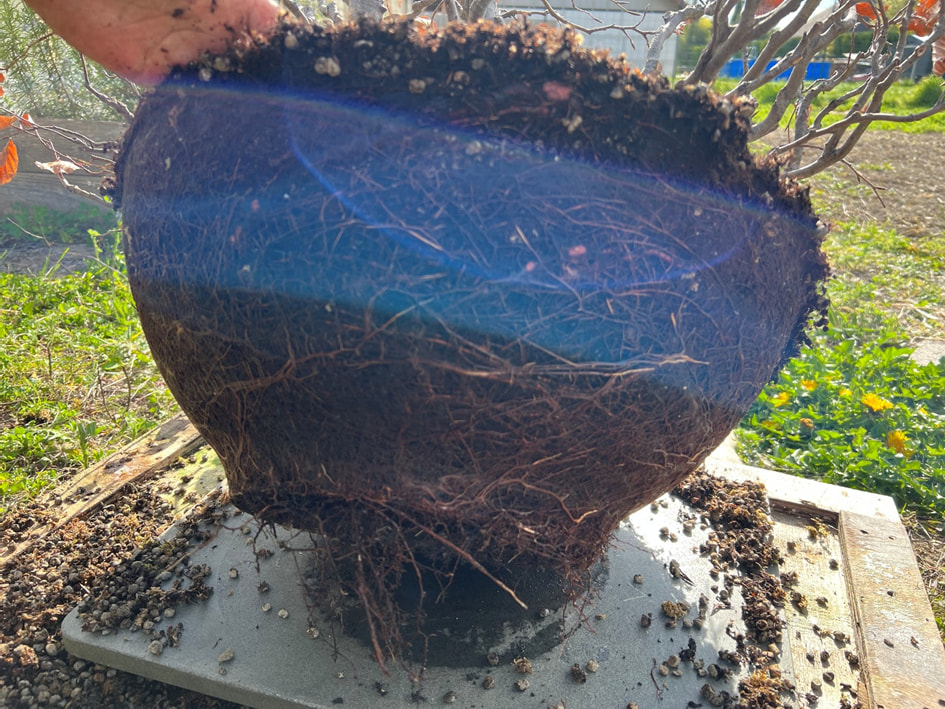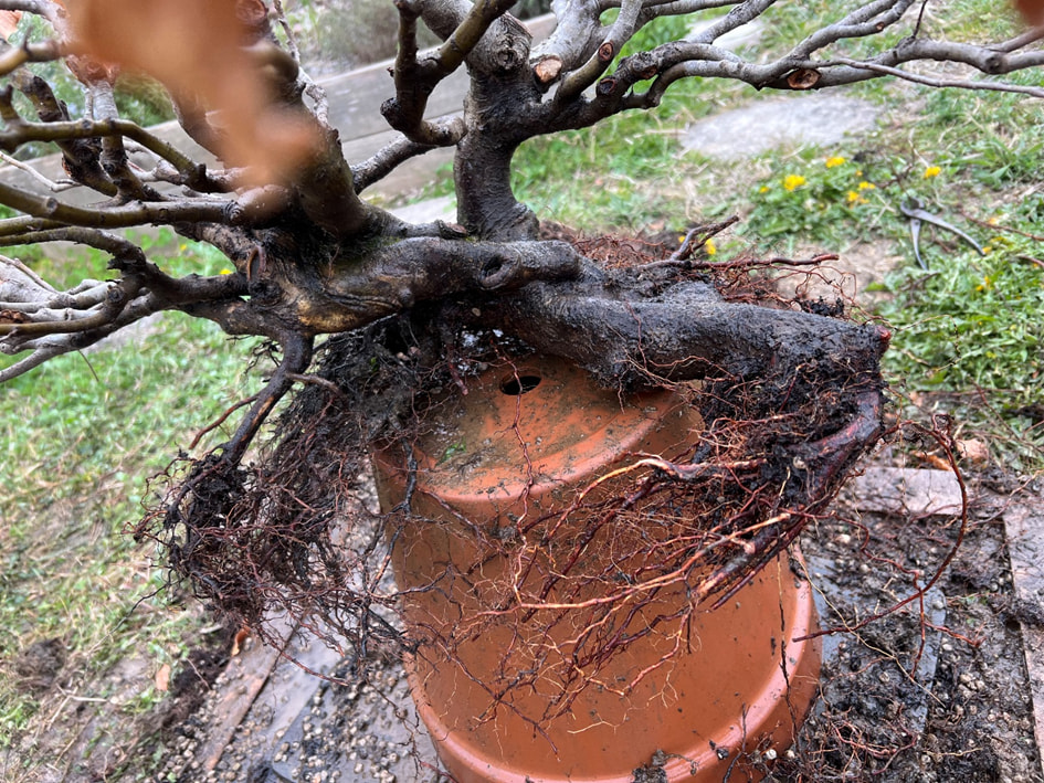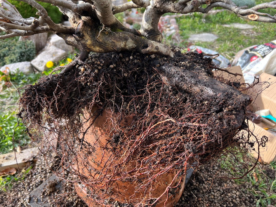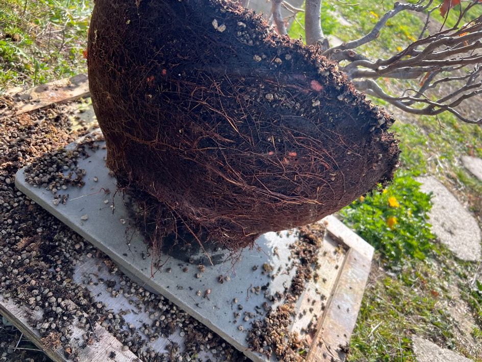 Pour le rempotage je suis tombé sur une motte ultra compacte de racine l’arbre était dans un substrat 100% pumice il ne restait quasiment rien de la terre d’origine. Il m’a fallu 4 heures, j’y suis allé comme un bourrin avec la griffe ca ne voulait pas se démêler j’ai bien évidement été plus doux quand je me rapprochai du centre. Pareil dans le feu de l’action j’espere ne pas avoir été trop loin, l’arbre était plein de vigueur. Je me suis apercu qu’en réduisant les racines petit a petit je ne me rend pas compte de la quantité de racine que je retire au final ce qui après coup me parait énorme. Par ailleurs j’avais déjà entendu que les arbres produisaient différents types de racine qui ont des objectifs différents (exemple : encrage, récupération de ressource, réserve d’energie), je me demande donc si c’est applicable a la culture de bonsai ou alors si le fait de tailler les racines modifie trop cette spécificité.