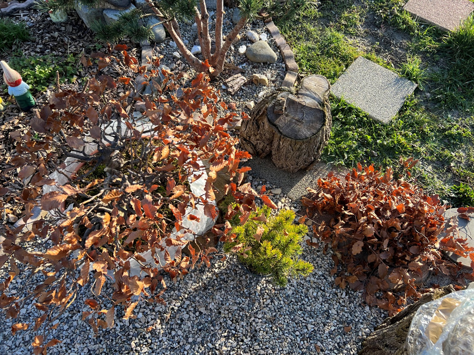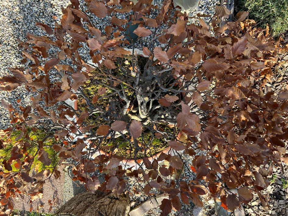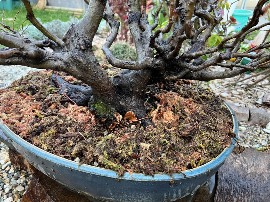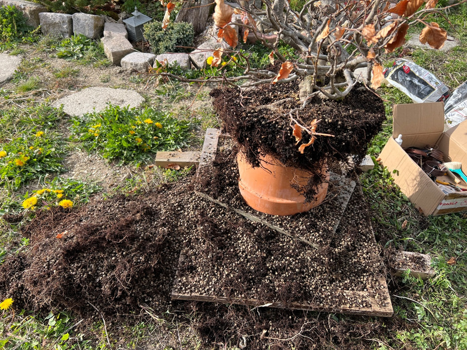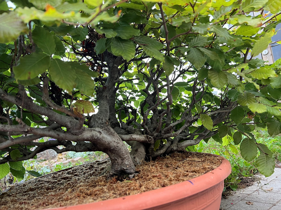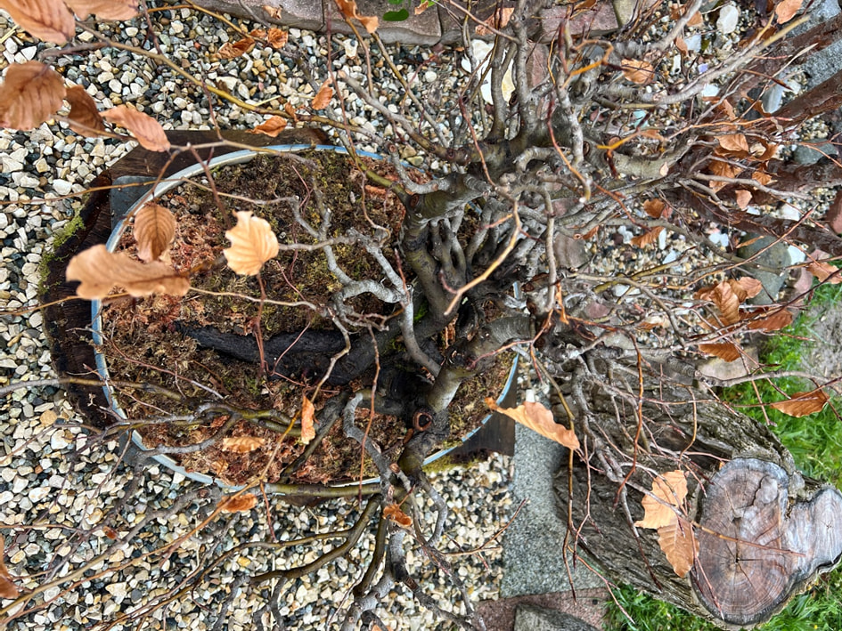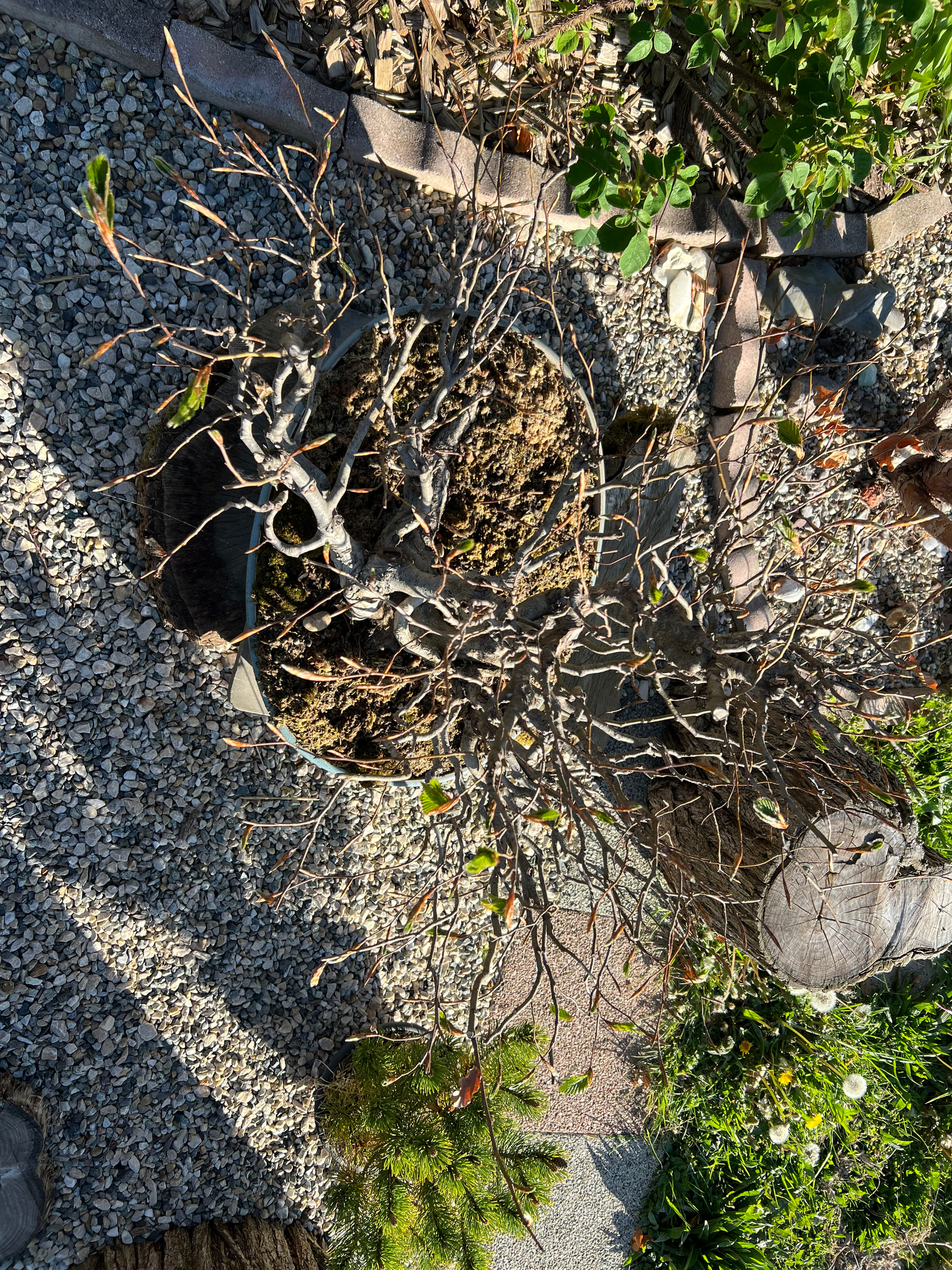 Pour le rempotage je suis tombé sur une motte ultra compacte de racine l’arbre était dans un substrat 100% pumice il ne restait quasiment rien de la terre d’origine. Il m’a fallu 4 heures, j’y suis allé comme un bourrin avec la griffe ca ne voulait pas se démêler j’ai bien évidement été plus doux quand je me rapprochai du centre. Pareil dans le feu de l’action j’espere ne pas avoir été trop loin, l’arbre était plein de vigueur. Je me suis apercu qu’en réduisant les racines petit a petit je ne me rend pas compte de la quantité de racine que je retire au final ce qui après coup me parait énorme. Par ailleurs j’avais déjà entendu que les arbres produisaient différents types de racine qui ont des objectifs différents (exemple : encrage, récupération de ressource, réserve d’energie), je me demande donc si c’est applicable a la culture de bonsai ou alors si le fait de tailler les racines modifie trop cette spécificité.