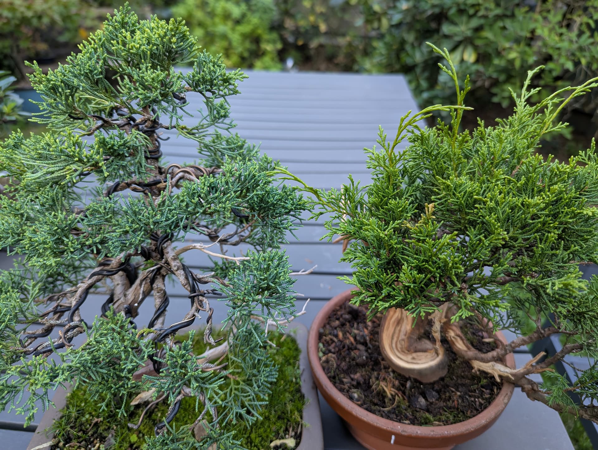Voici à gauche mon junip’ chinensis kishu ou shimpaku je ne sais pas… et à droite un junip’ Itoigawa . Celui de gauche est plus dans les tons bleutés même si les jeunes pousses sont un peu plus vertes .