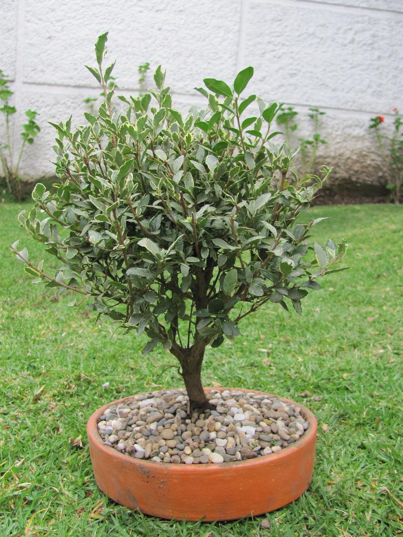 Il vient tout juste d’être transformé en bonsai, il doit faire 40 cm de haut et les feuilles sont toutes petites (1 cm environ)