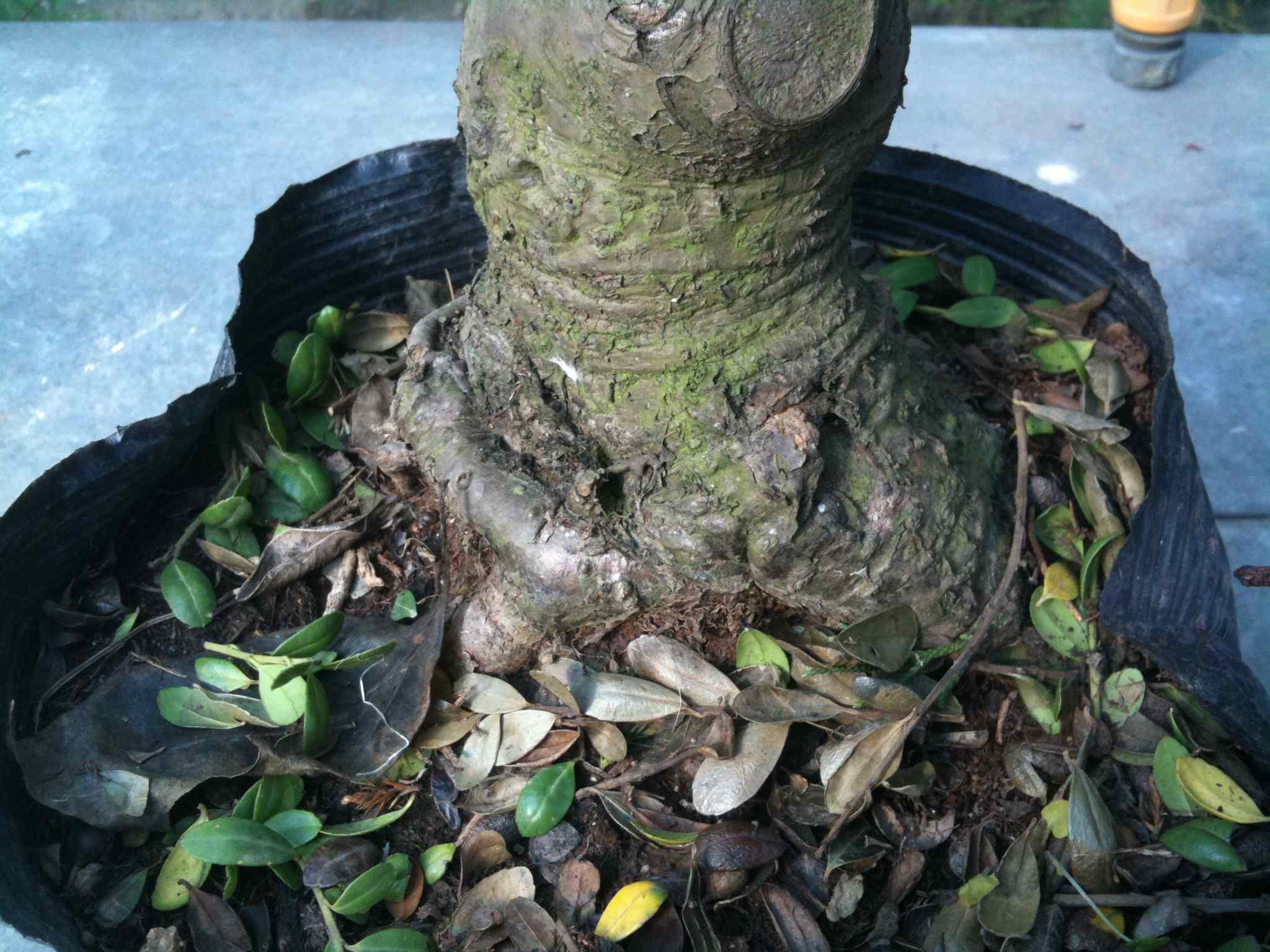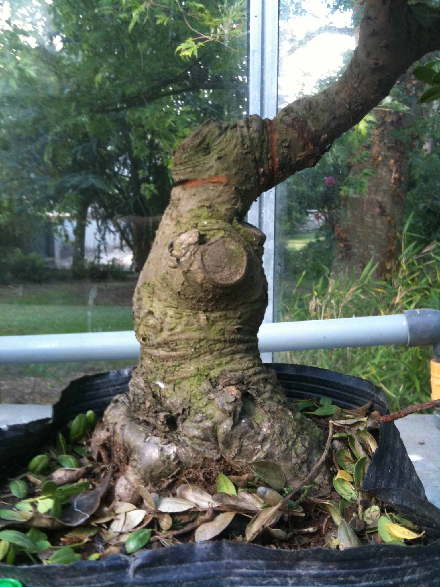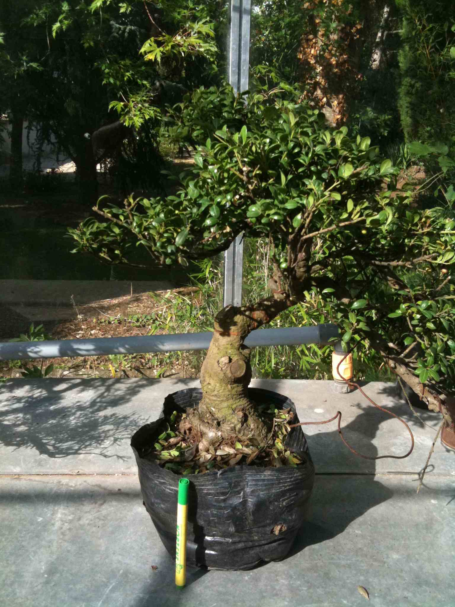Mon idée est de rempoter, reprendre les coupes pour améliorer la conicité, travailler en parallèle le racinaire, pour en faire un trapu (je trouve que toute la partie en arrondi au dessus est à enlever…). Le tout étalé sur plusieurs années pour garder une vigueur importante… même s’il n’a pas encore de vraie face avant, je le trouve prometteur…