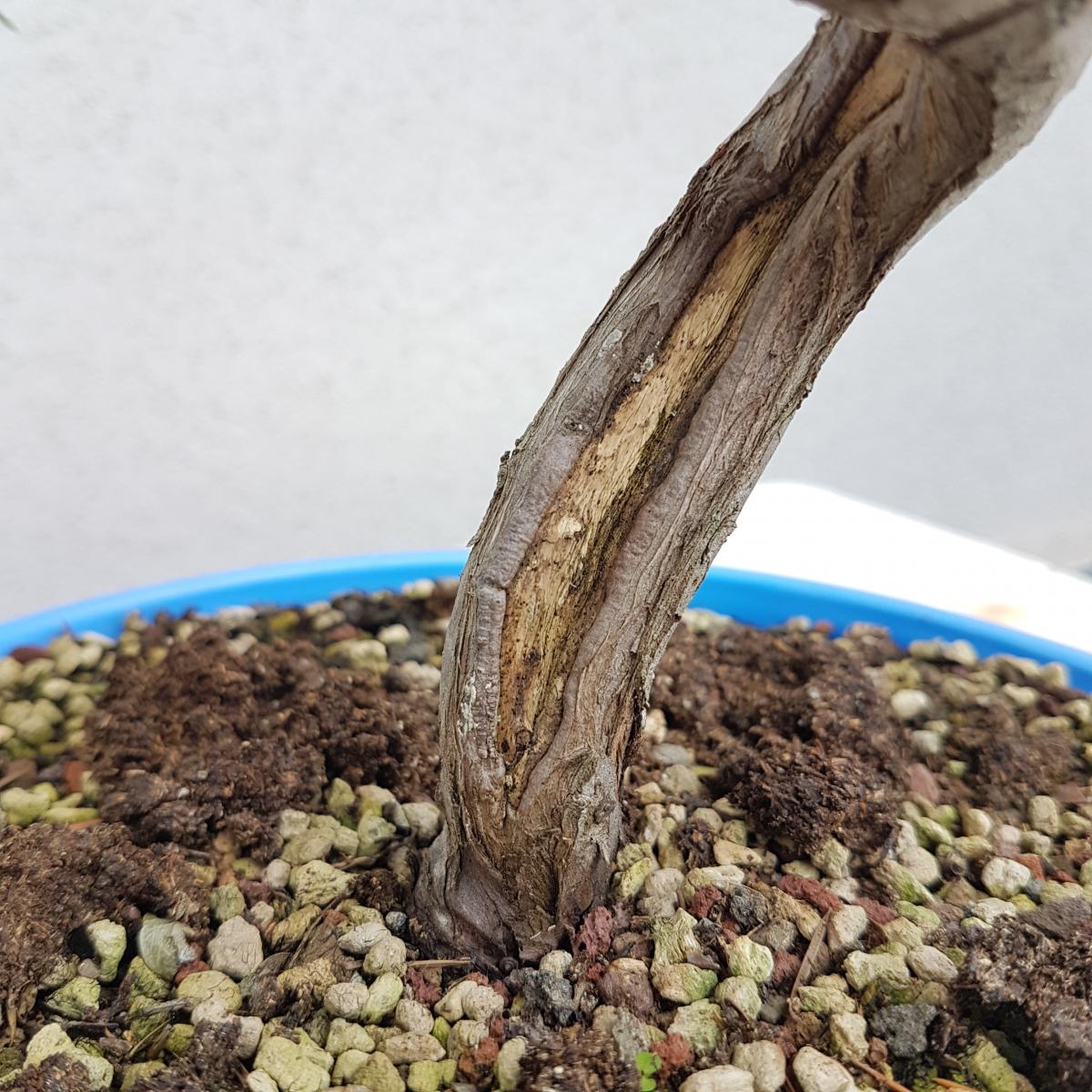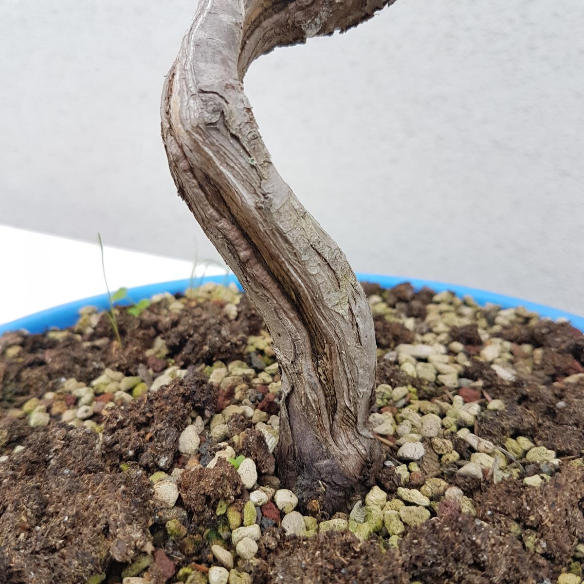 Il y a une semaine, comme je trouvais que l'arbre était un peu faiblard mais que cet été, posé sur le sol pendant les vacances d'aout, il a sorti pas mal de bouts de racines sur le dessous de la passoire, j'ai décidé d'anticiper la mise en place de la seconde passoire. J'espère ainsi, aussi, protéger l'arbre cet hiver et lui permettre de rester un peu plus à l'humidité alors que les racines continuent leur pousse. Encore une sorte d'expérience. Le tout premier Juniperus, lui, a été laissé dans sa passoire taille 22. Il pousse bien : on sent qu'il a été moins traumatisé par le rempotage effectué, lui aussi, cette année.