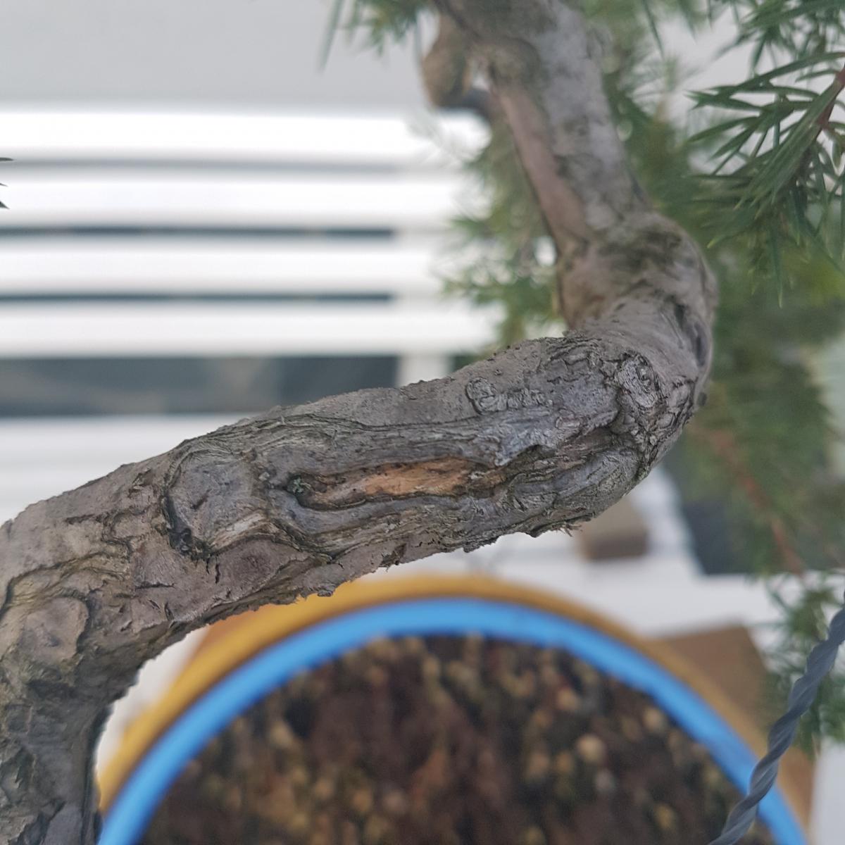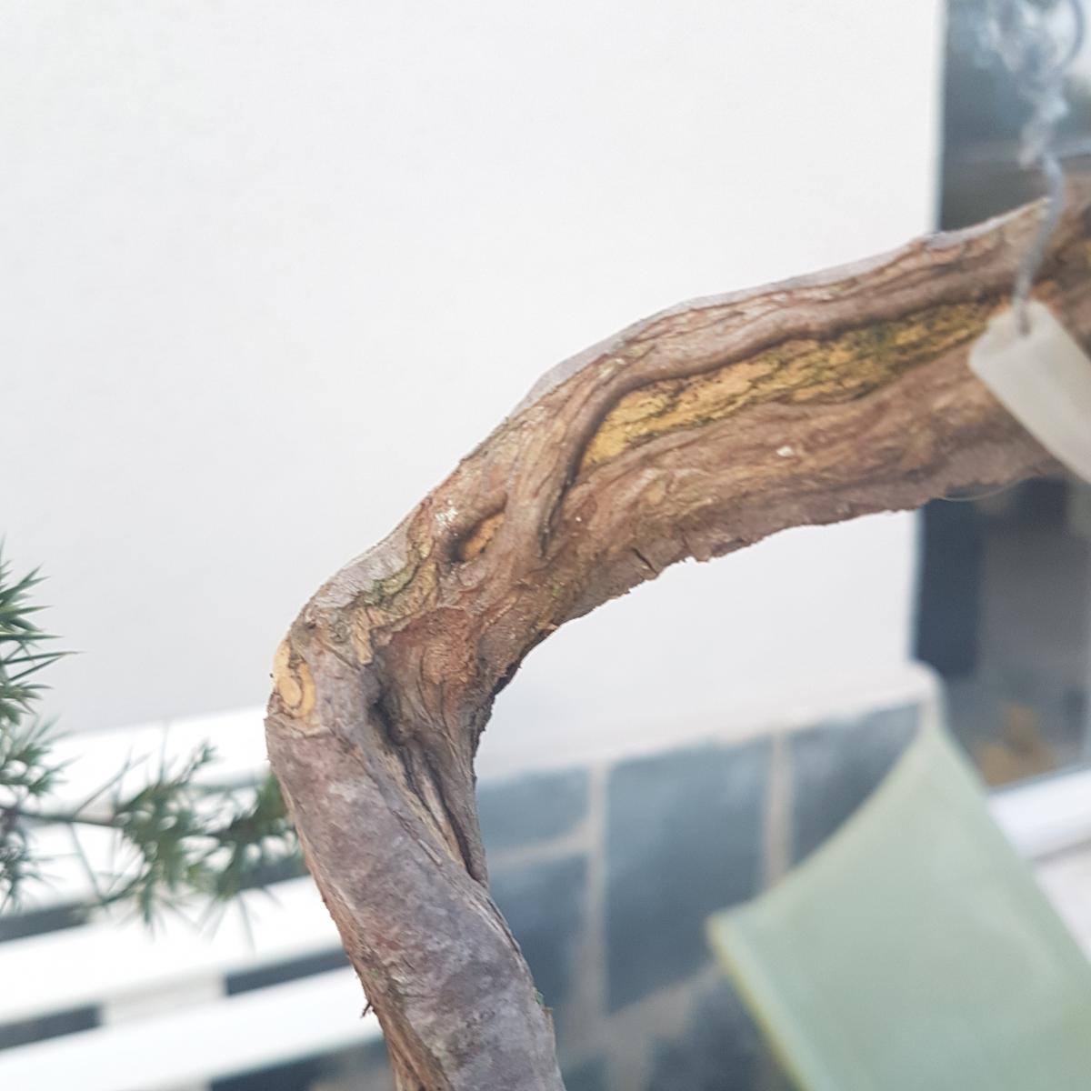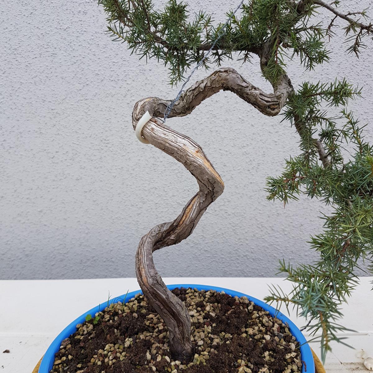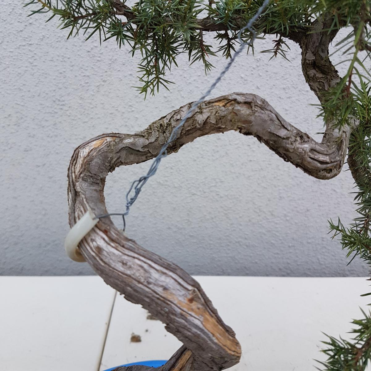 Donc, premier travail : je ligature pour donner un première forme. Le projet au départ était de faire un lettré. Je dis "était" car je ne suis plus trop sûr de rester sur cette forme. L'arbre évolue et ma connaissance du bonsaï aussi et plus je vois des genévriers et plus j'oublie cette idée de lettré.