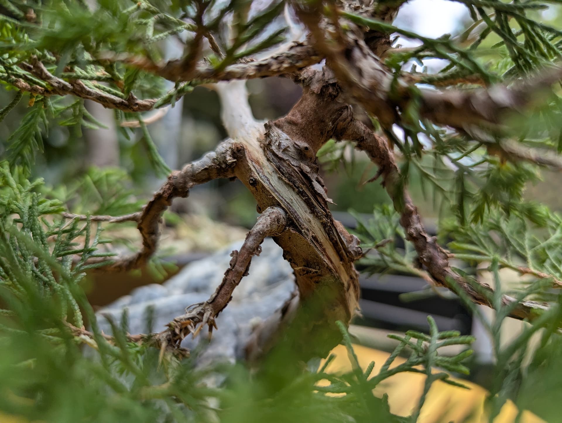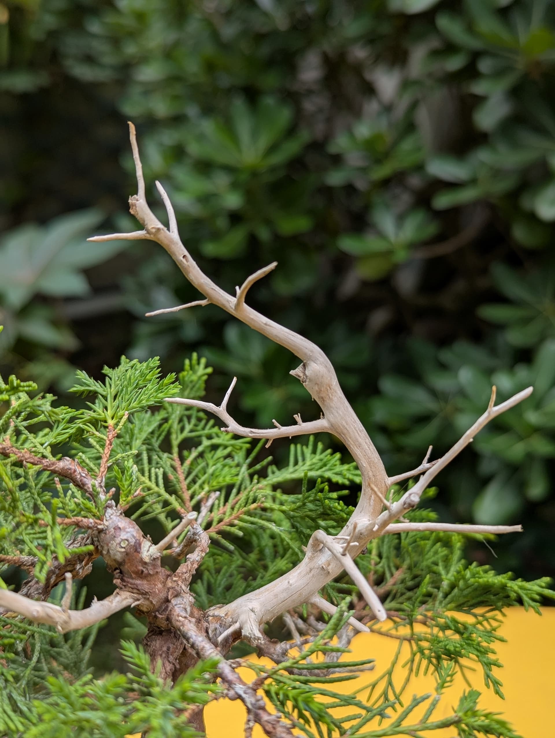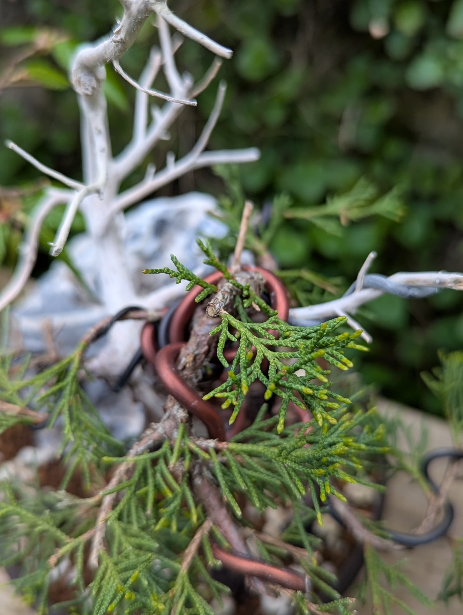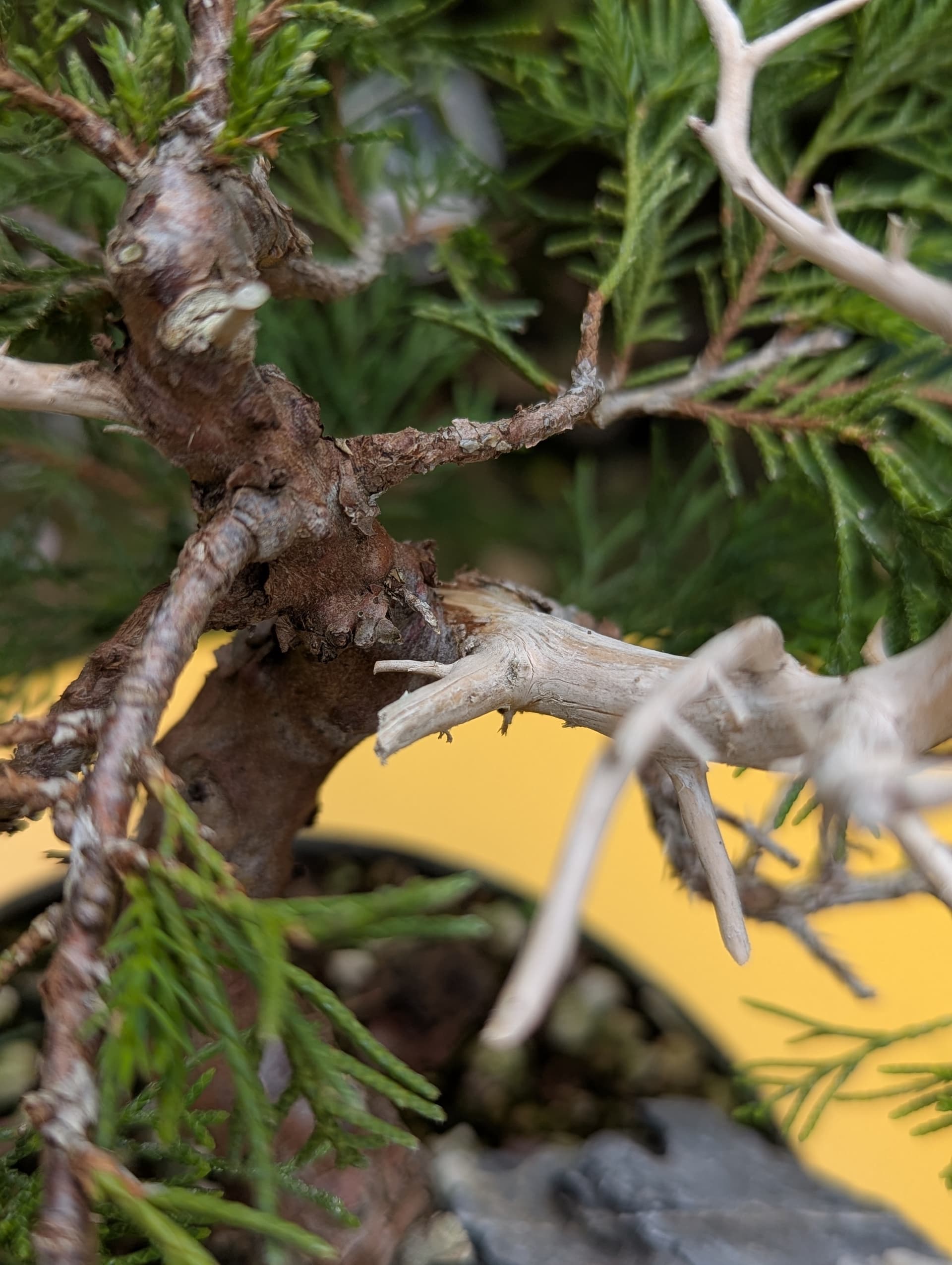 Quelques photos de détails des jins et du shari. Là où le gros fil de ligature passait ,le shari est un peu plus étroit, il faut que je le retouche légèrement . J’ai 2 branches au même niveau que j’avais conservées sur la 1ere mise en forme pour éviter de trop le déplumer , mais l’une d’elle va sûrement devenir un jin également .