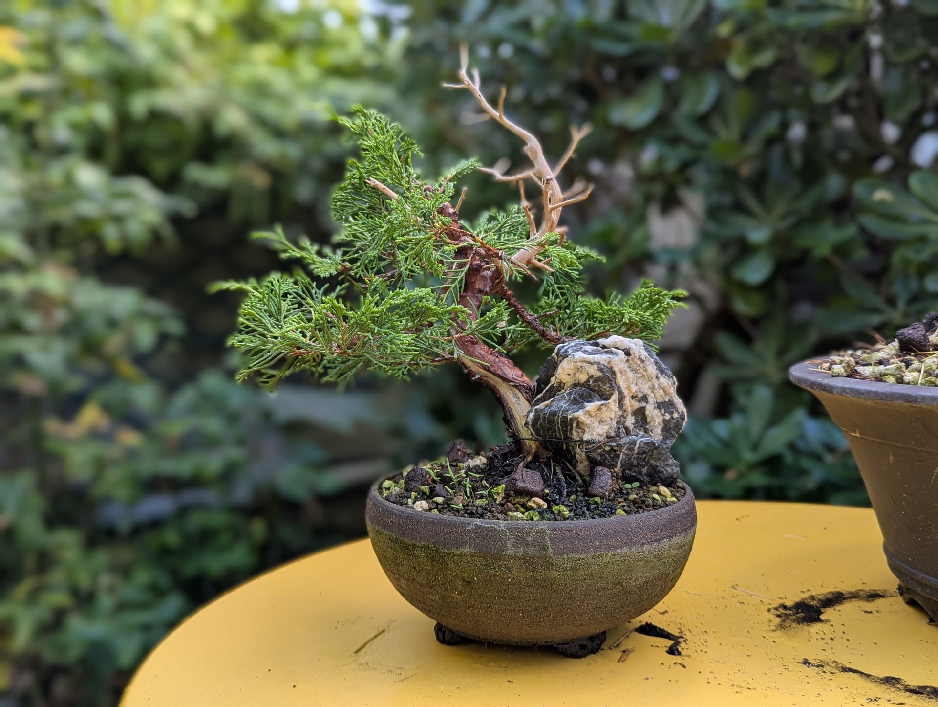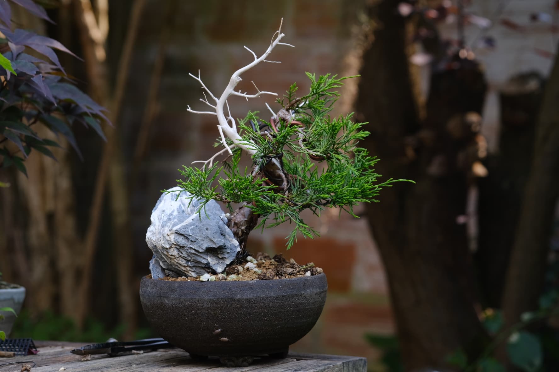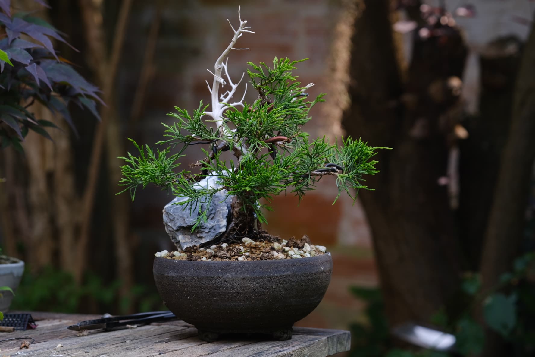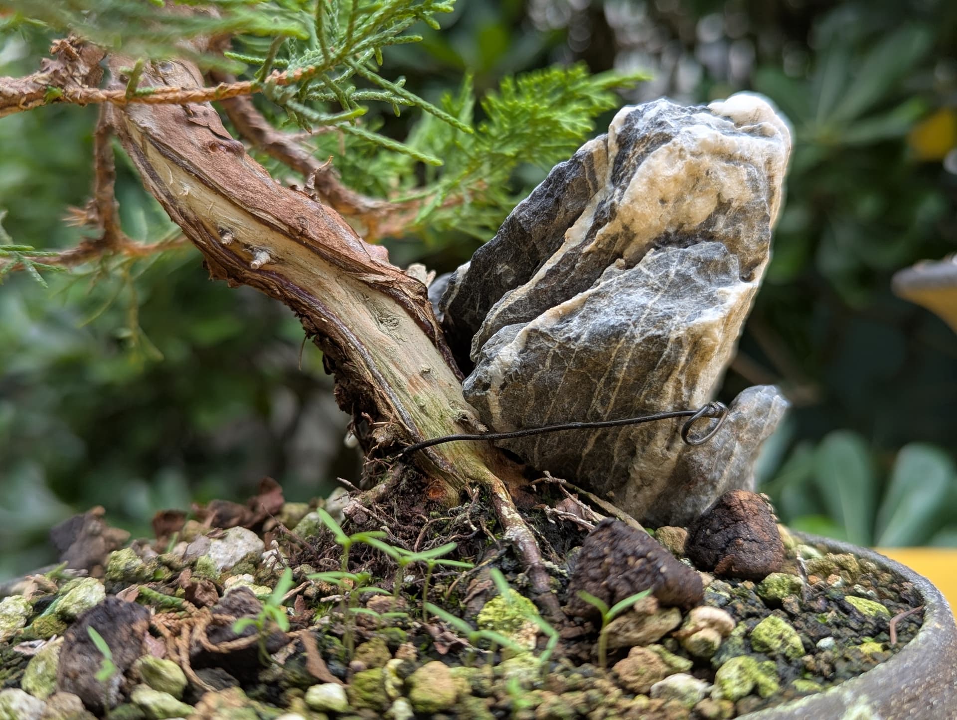 Quelques photos de détails des jins et du shari. Là où le gros fil de ligature passait ,le shari est un peu plus étroit, il faut que je le retouche légèrement . J’ai 2 branches au même niveau que j’avais conservées sur la 1ere mise en forme pour éviter de trop le déplumer , mais l’une d’elle va sûrement devenir un jin également .