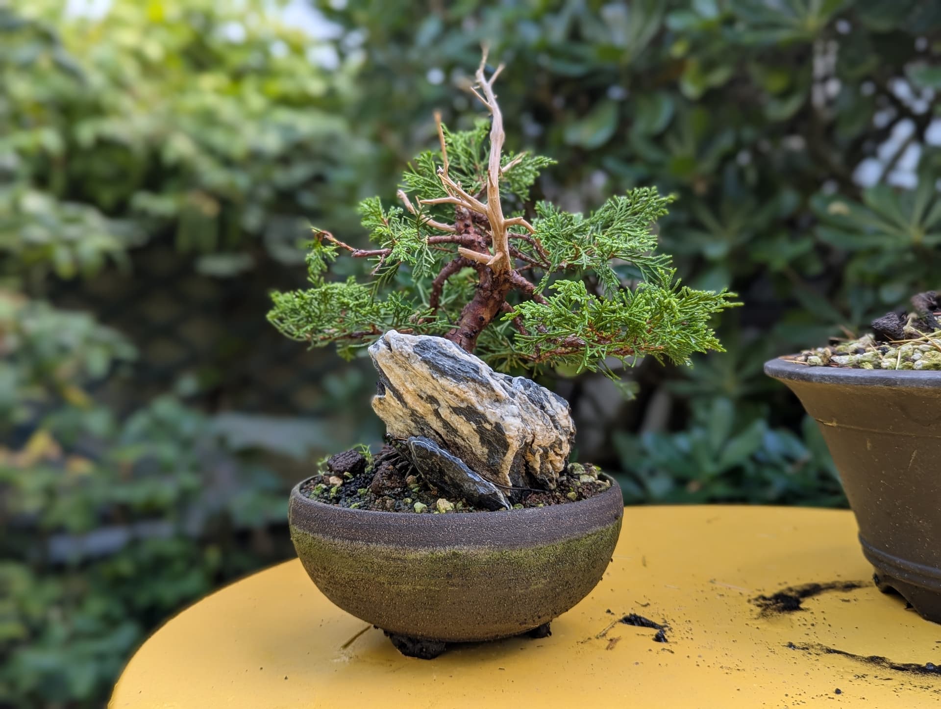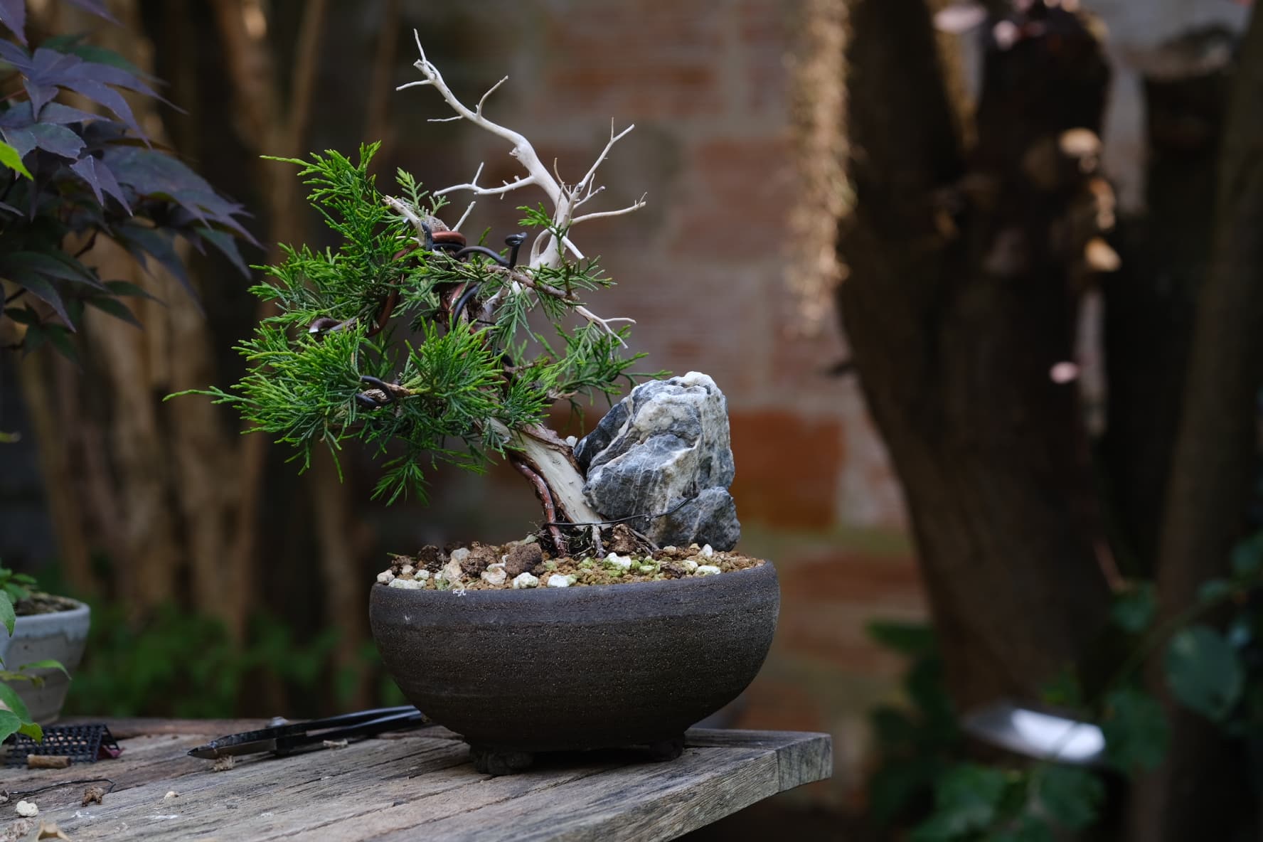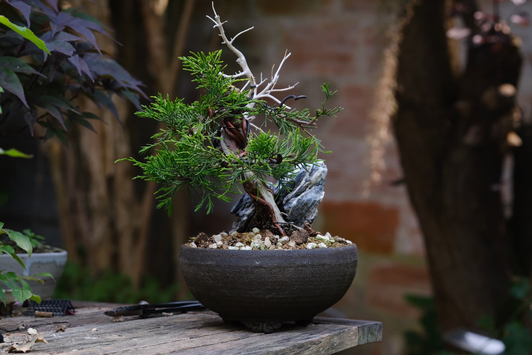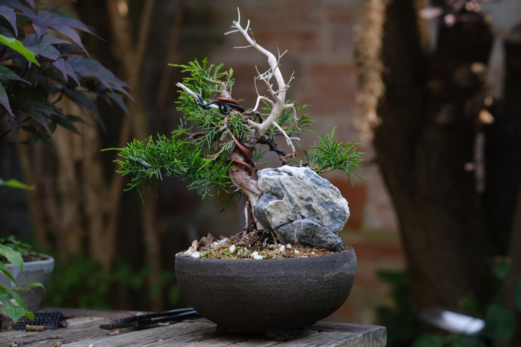 Quelques photos de détails des jins et du shari. Là où le gros fil de ligature passait ,le shari est un peu plus étroit, il faut que je le retouche légèrement . J’ai 2 branches au même niveau que j’avais conservées sur la 1ere mise en forme pour éviter de trop le déplumer , mais l’une d’elle va sûrement devenir un jin également .