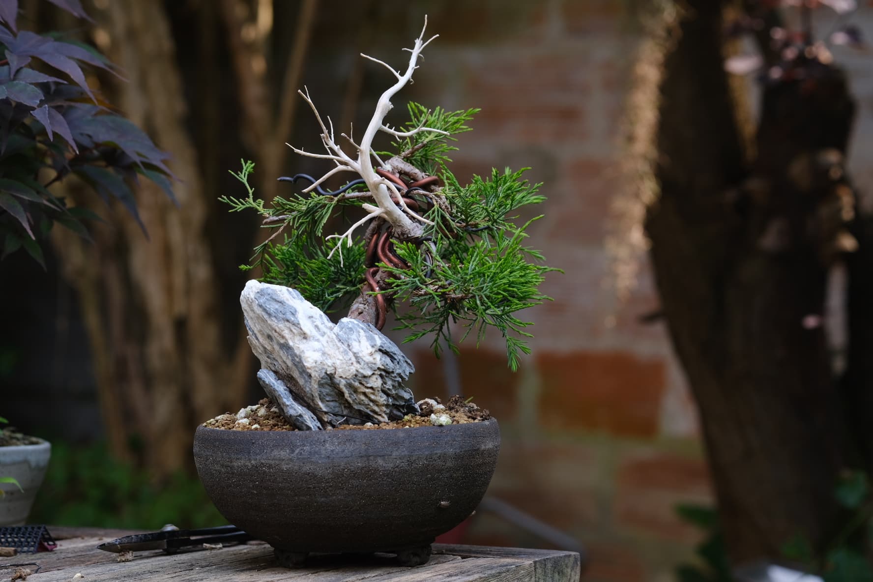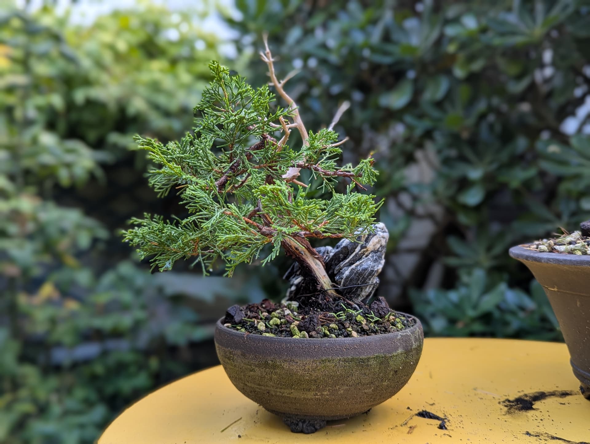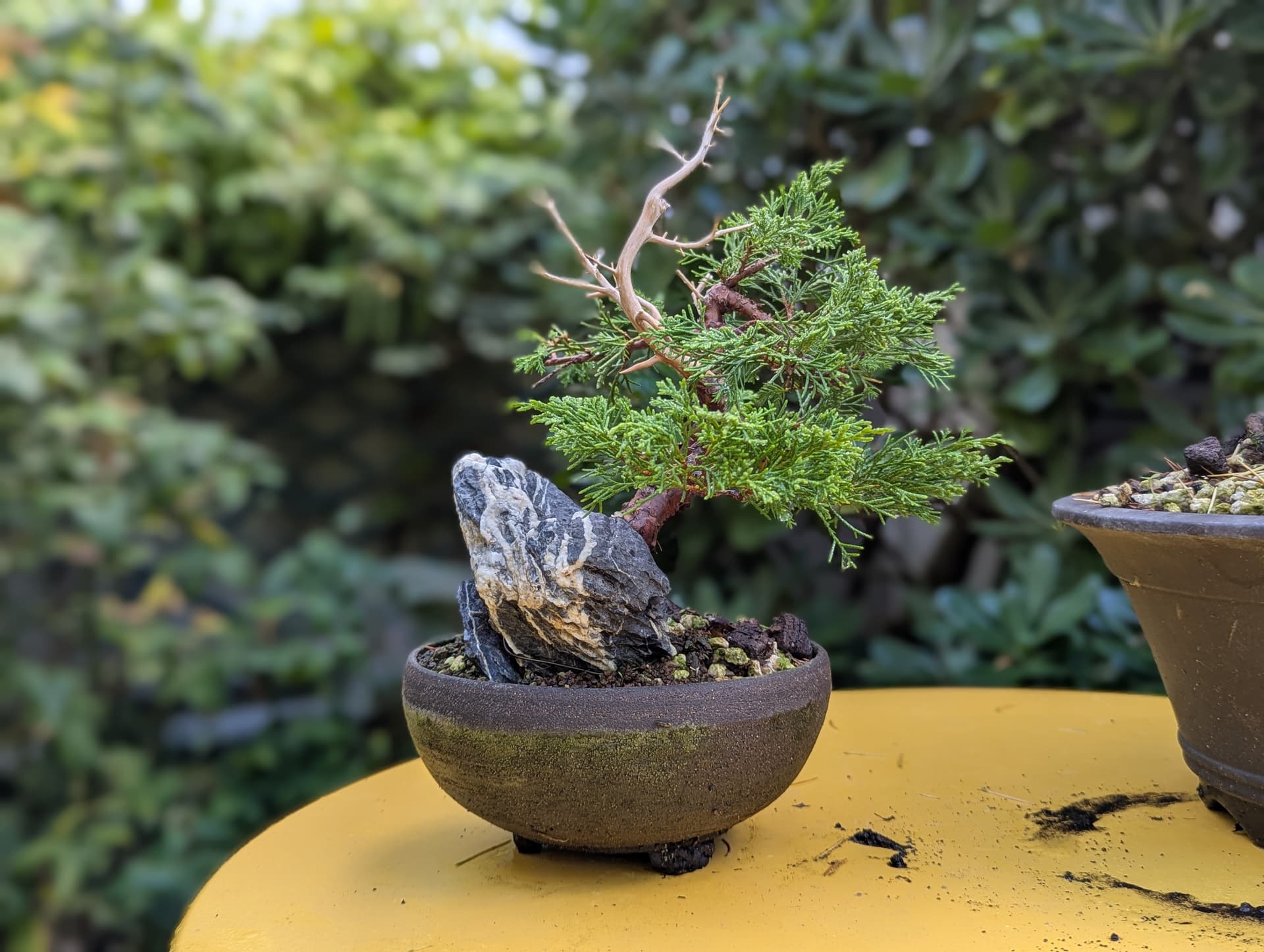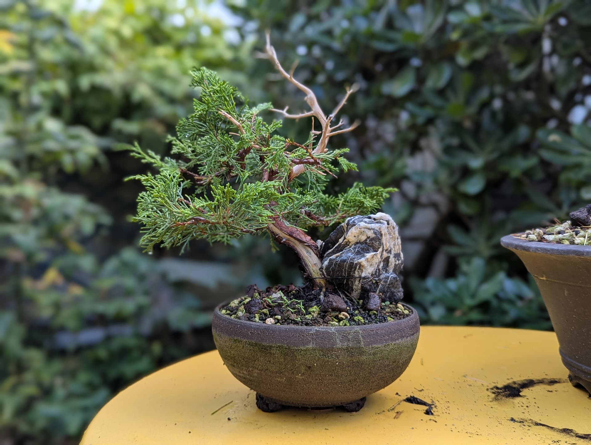 Quelques photos de détails des jins et du shari. Là où le gros fil de ligature passait ,le shari est un peu plus étroit, il faut que je le retouche légèrement . J’ai 2 branches au même niveau que j’avais conservées sur la 1ere mise en forme pour éviter de trop le déplumer , mais l’une d’elle va sûrement devenir un jin également .