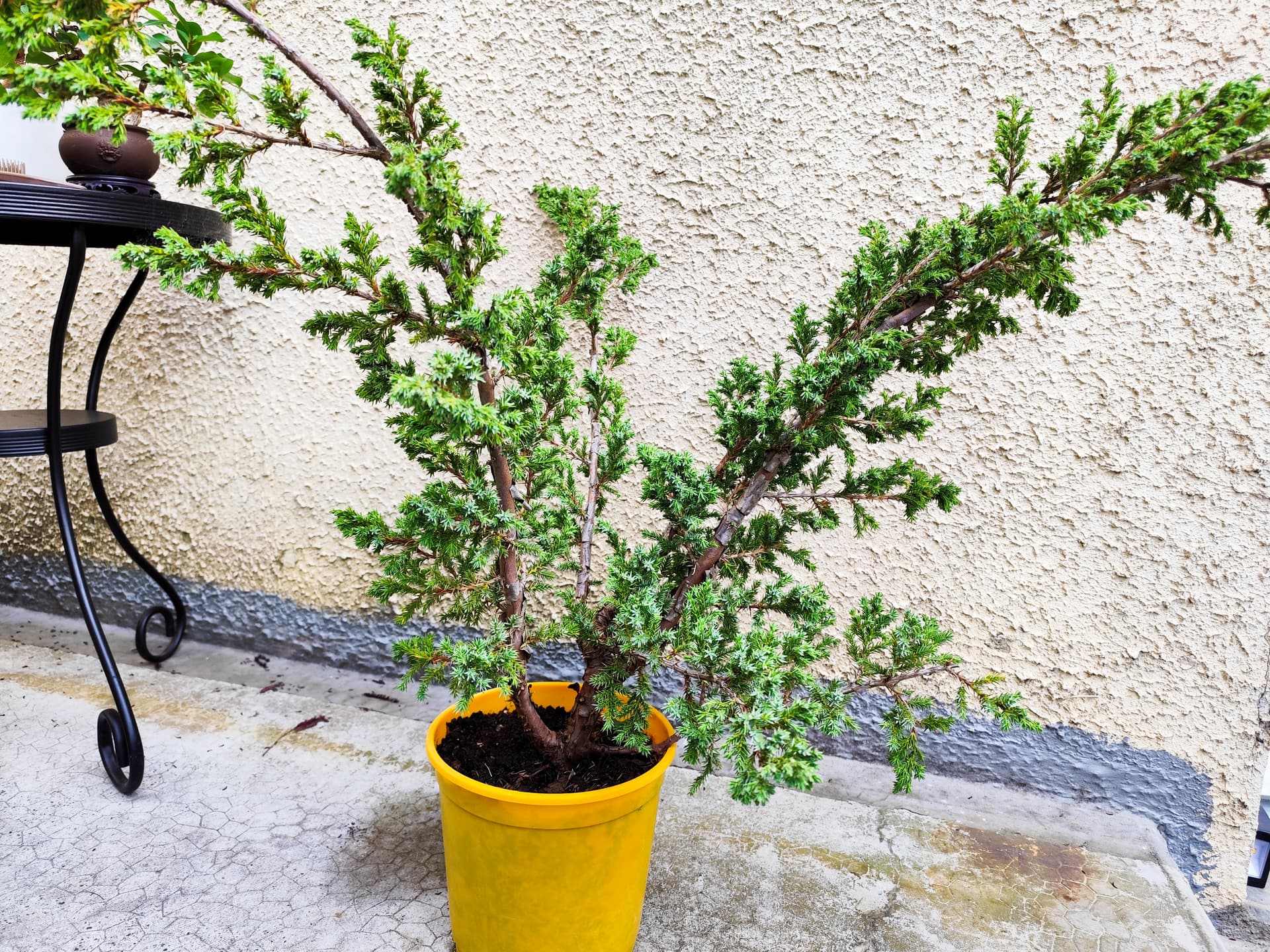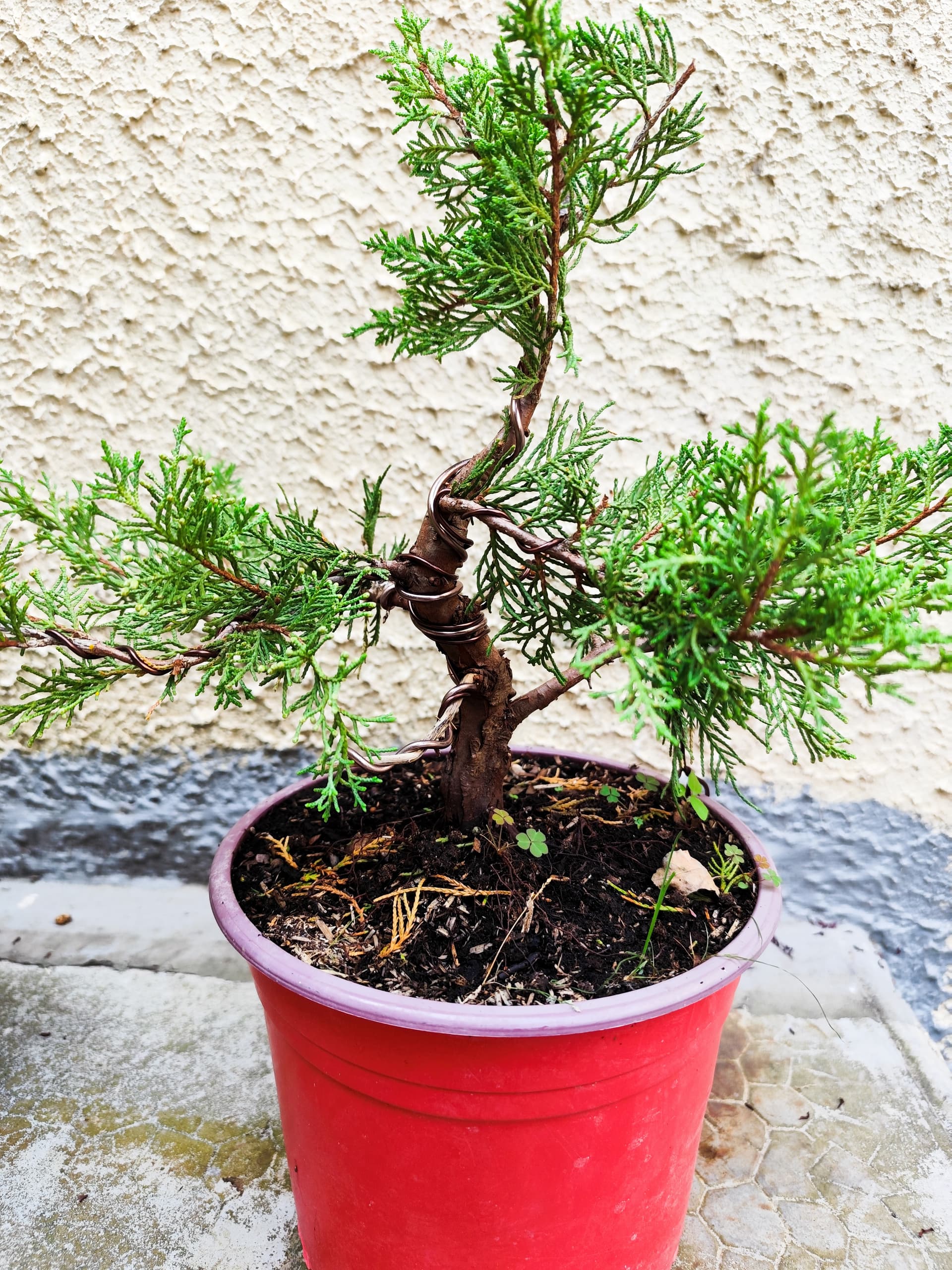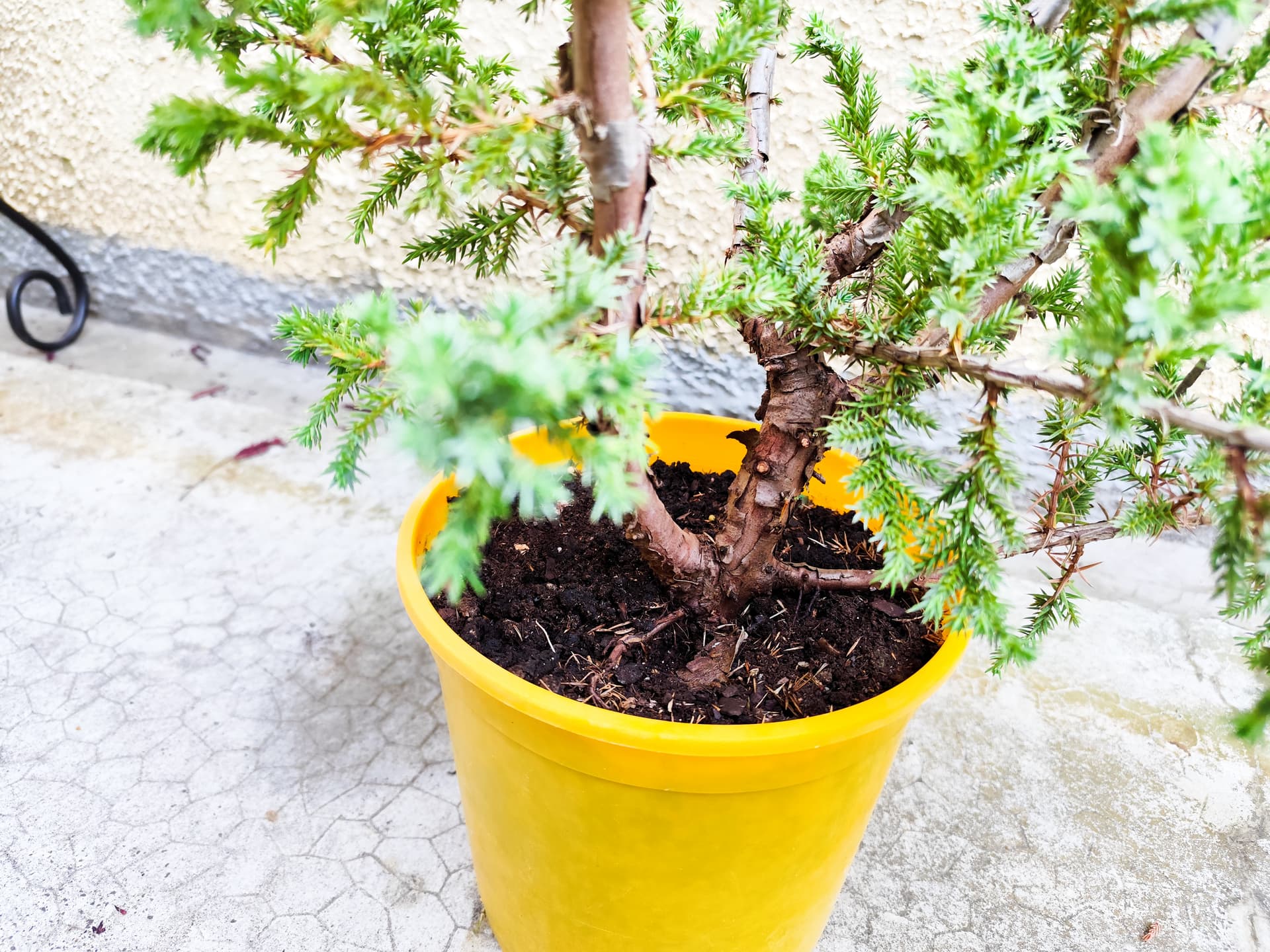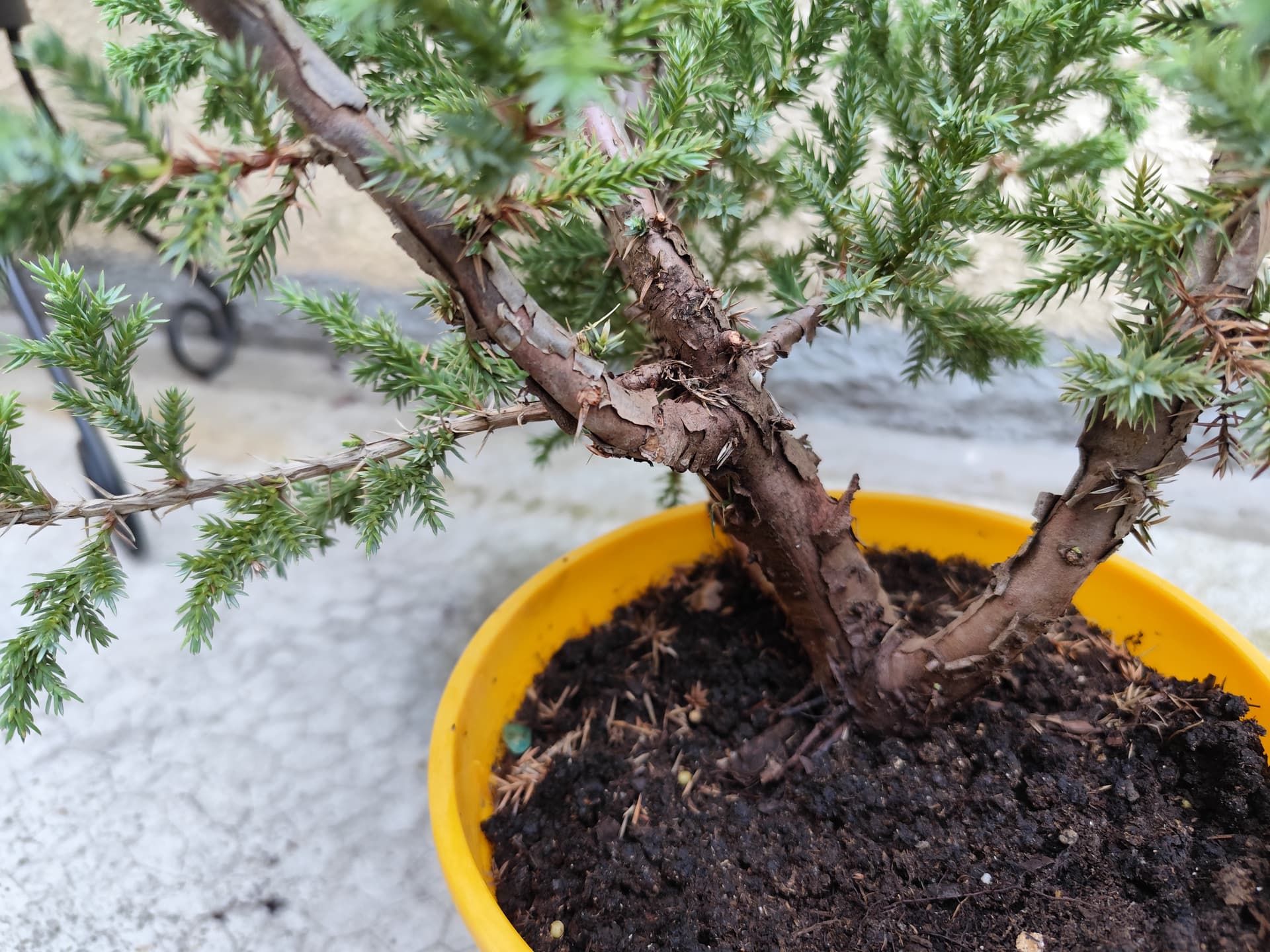 Vu qu’’ils sont dans du terreau, il est préférable de les rempoter dans du drainant, à la bonne saison (printemps ou automne selon les amateurs/régions). Pour le juniperus, je conserverais un seul tronc pour plus tard (soit un lettré soit un arbre plus compact).