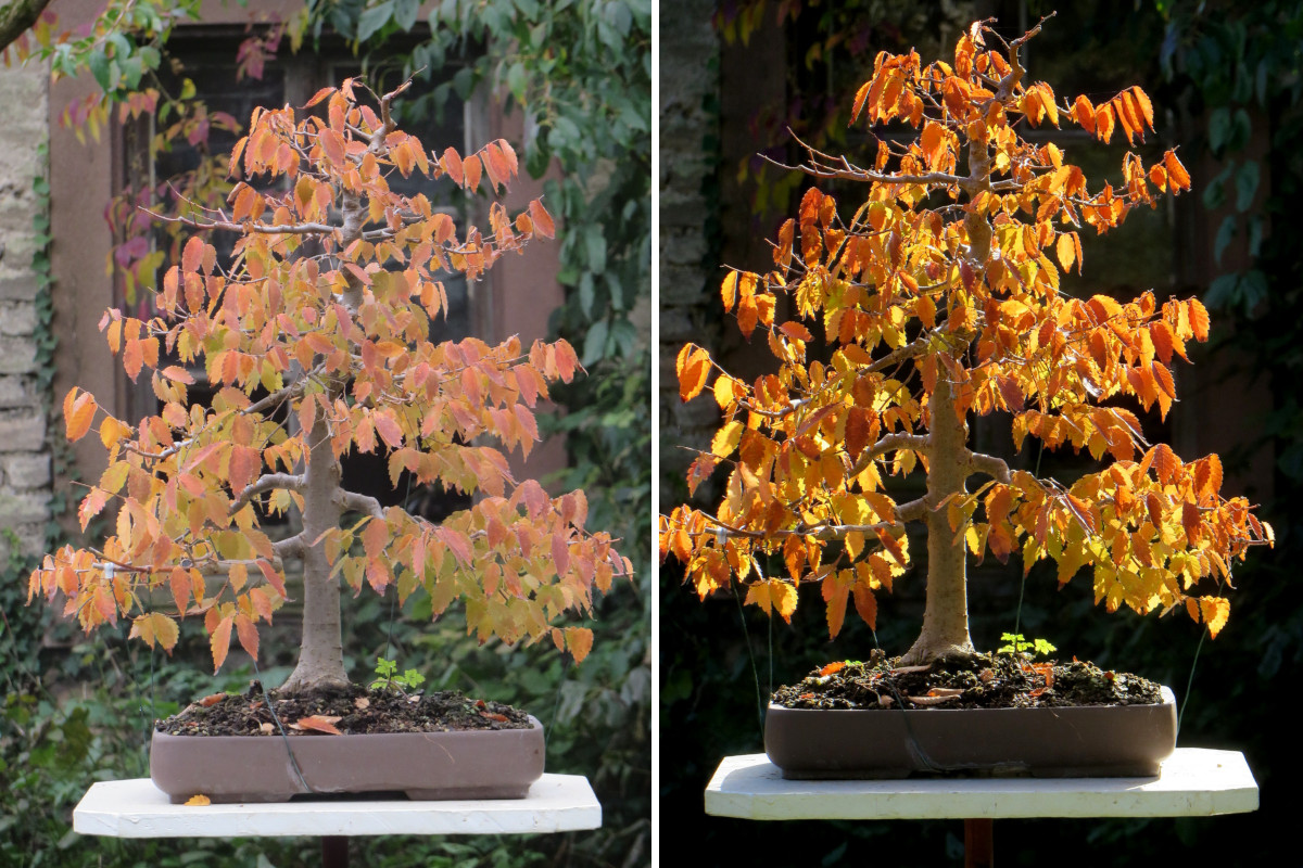 La largeur du tronc en haut s’en trouvera grossie et la largeur du tronc en bas sera diminuée, donc un effet au détriment de la conicité réelle, et même sans contre-plongée les branches de premier plan seront exagérément grossies au grand-angle et nuiront à la silhouette générale du bonsai.