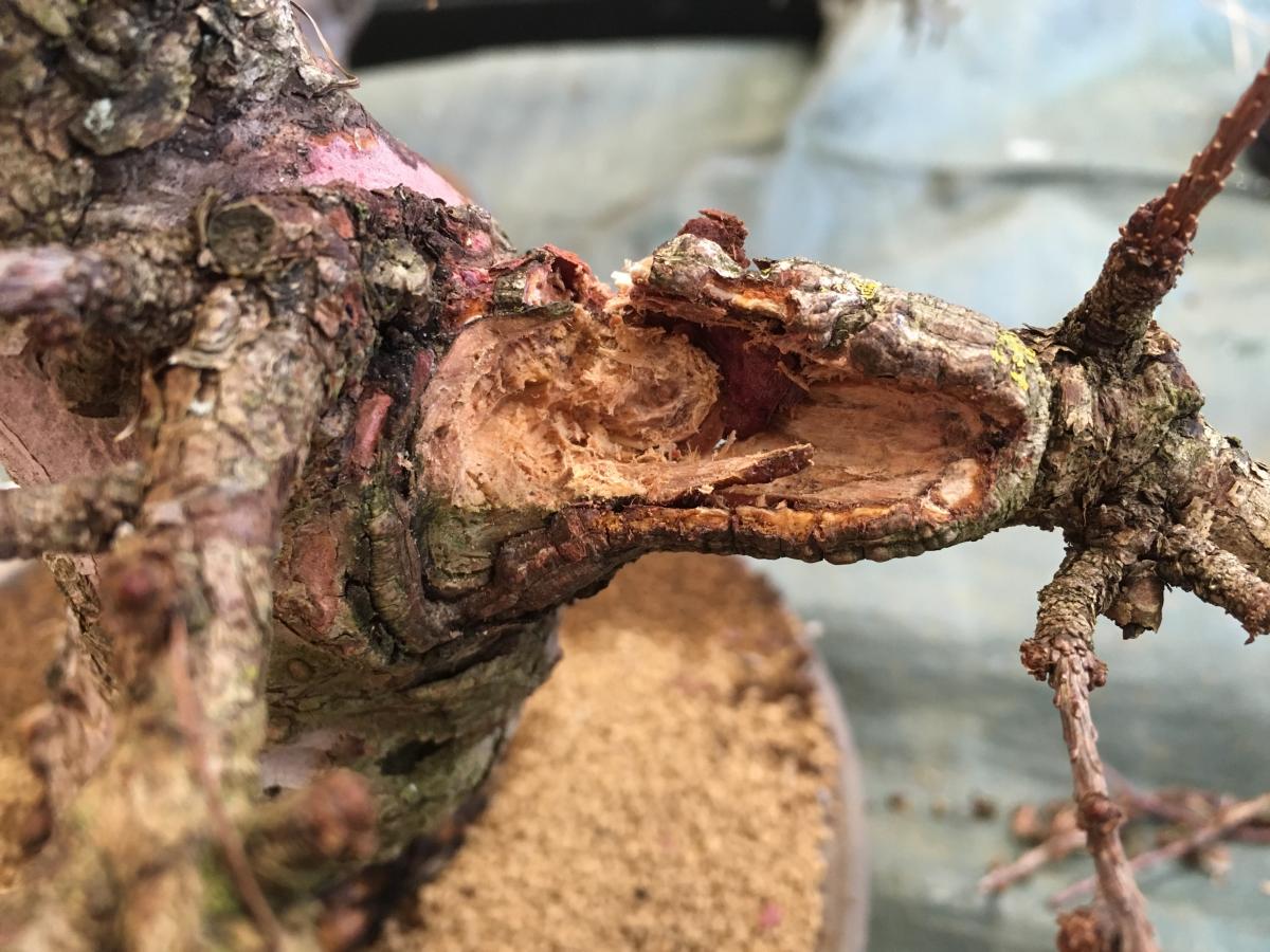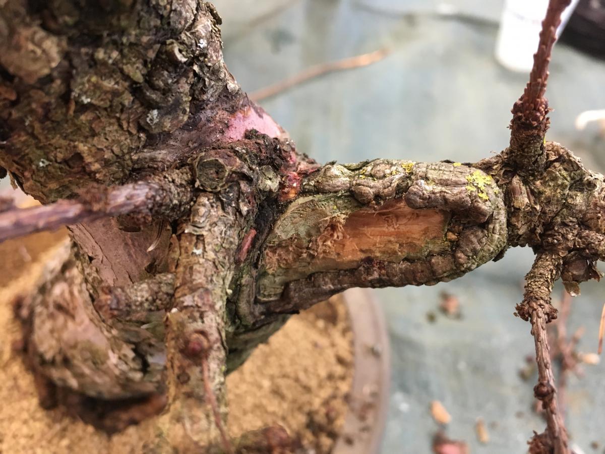 Tu comptes laisser la cime tirer librement pour entamer la reconstruction de la partie haute? Si c’est le cas tu pourrais couper à ras la partie que tu comptais travailler en bois mort, la coupe se fermera d’ici à ce que tu finisses de reconstruire sa tête. Je fais de la sorte sur le mélèze que je reforme, ton projet est similaire
