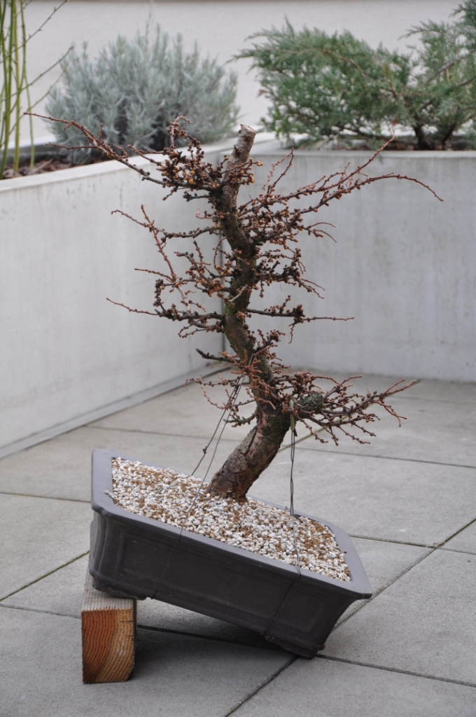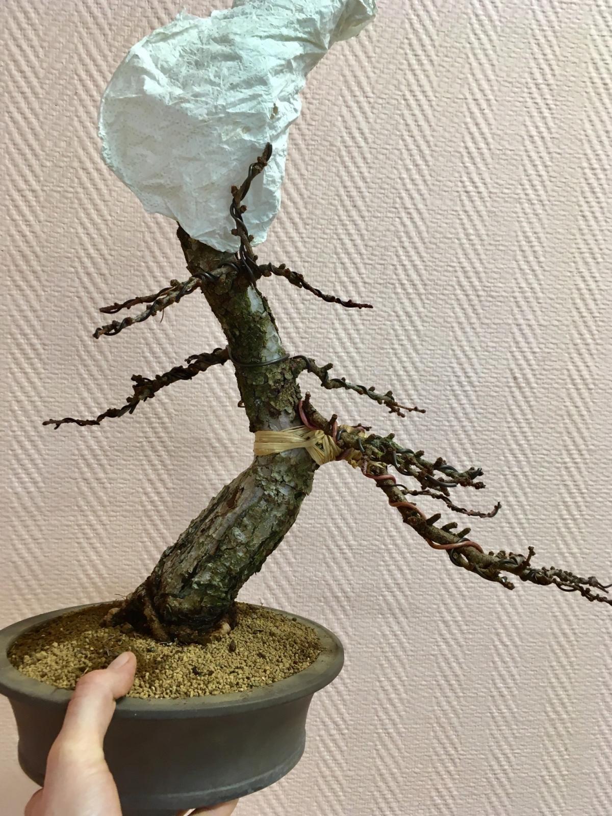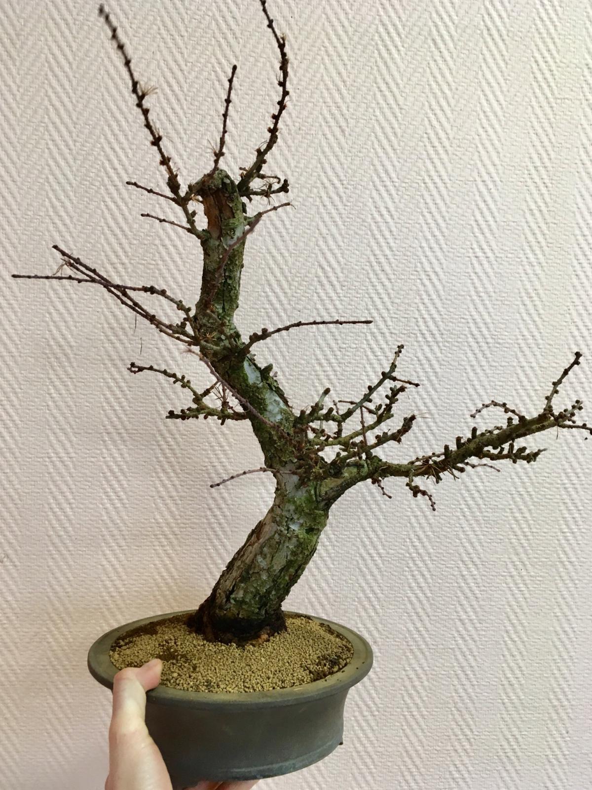 Photo du jour. Suite au rempotage, l’arbre n’a pas été très vigoureux. Je le laisse tranquille une saison supplémentaire avant de le mettre en forme. J’ai juste supprimé la parie supérieur morte. J’anticipe la question… le ten jin ne me séduisait pas sur cet arbre.