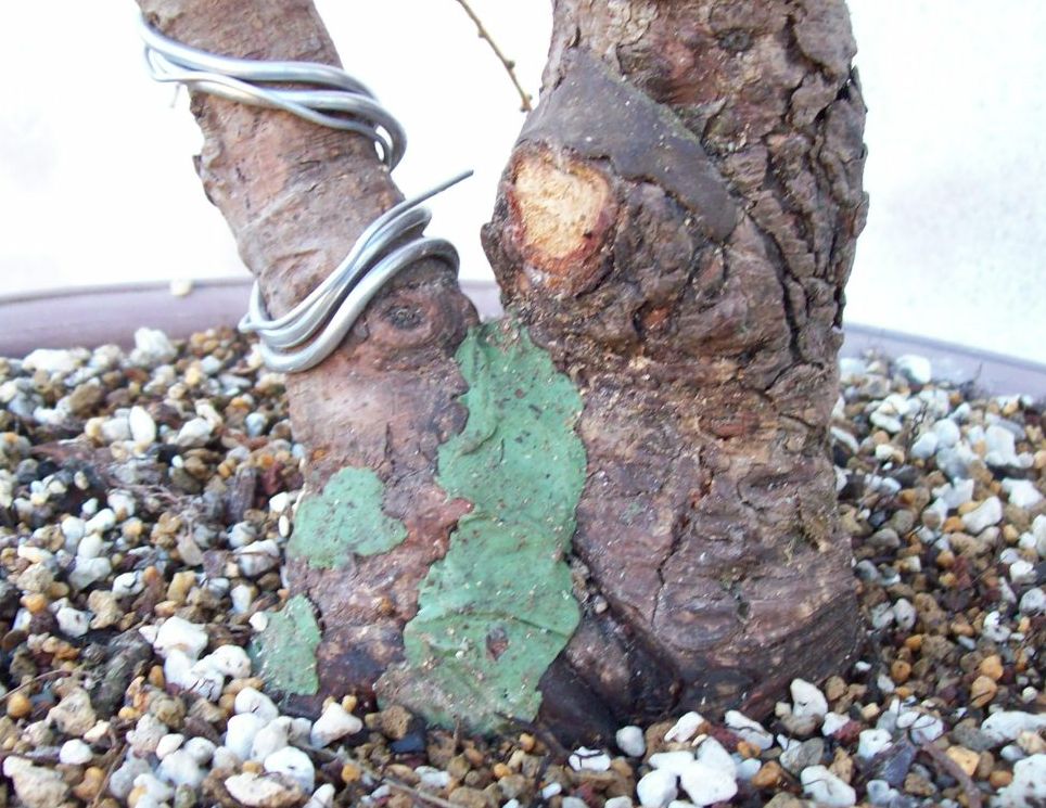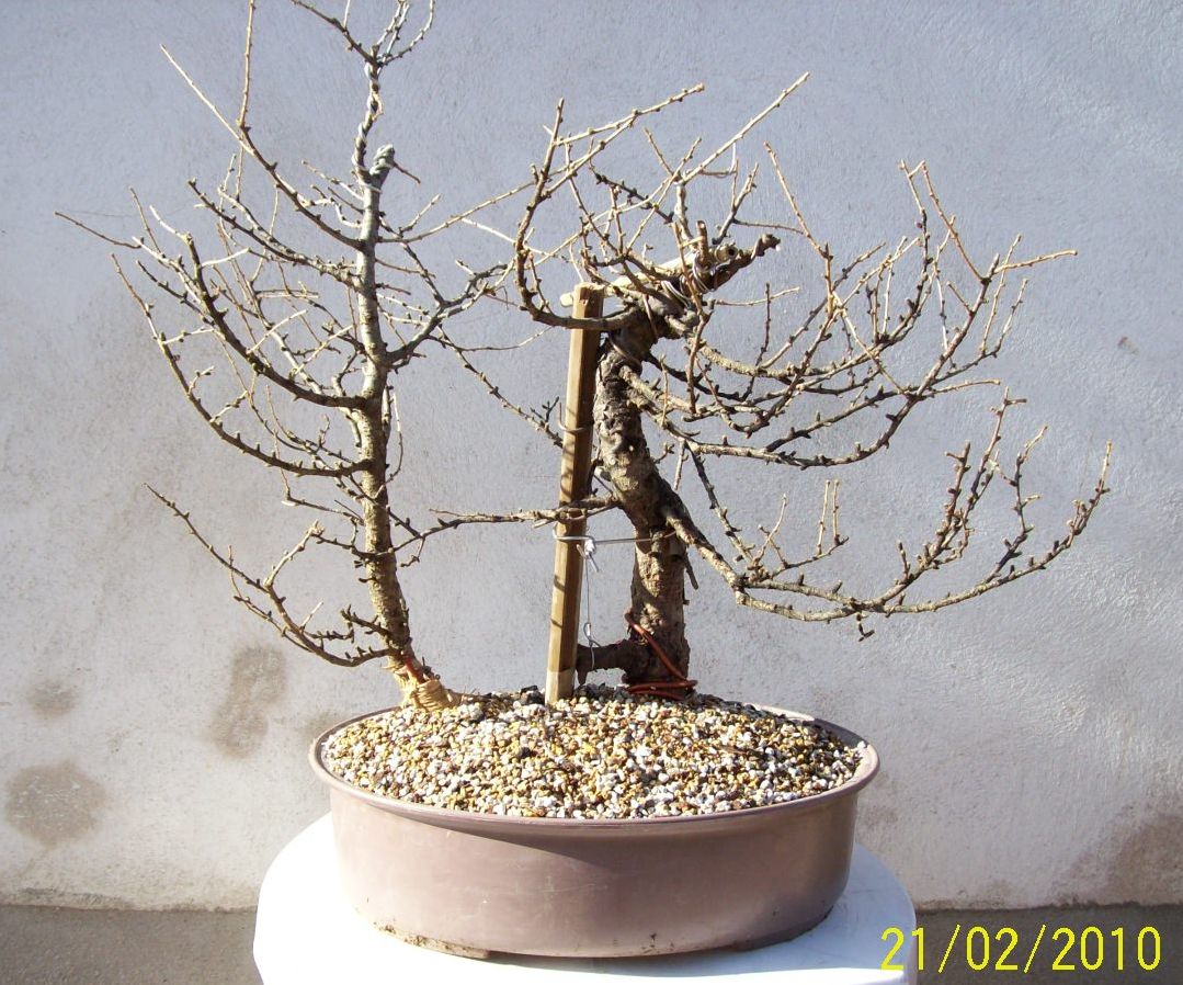 Une grande branche de mon larix étant très basse et touchant la terre s’est enracinée naturellement. J’ai donc décidé de la tordre de manière a ce qu’elle me fasse un deuxième arbre, qui resterait lié à l’arbre mère. Hélas je n’ai pas réussi, alors je l’ai coupée, replantée en l’accolant au tronc (avant cela, je l’ai écorcée ainsi que le tronc) le tout assemblé avec deux vis. Au final je me retrouve avec un double tronc. Le temps et une bonne culture achèveront de les unifier. Les photos vous aideront à mieux comprendre.179275
