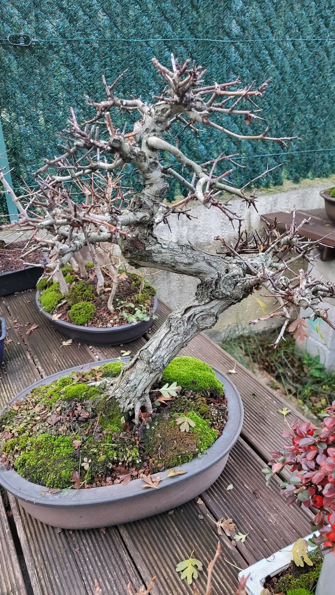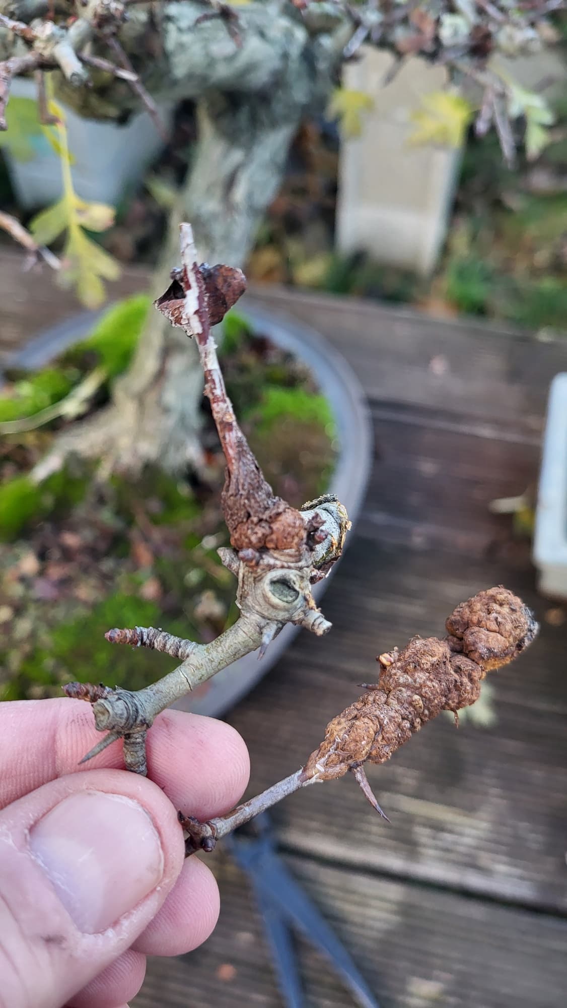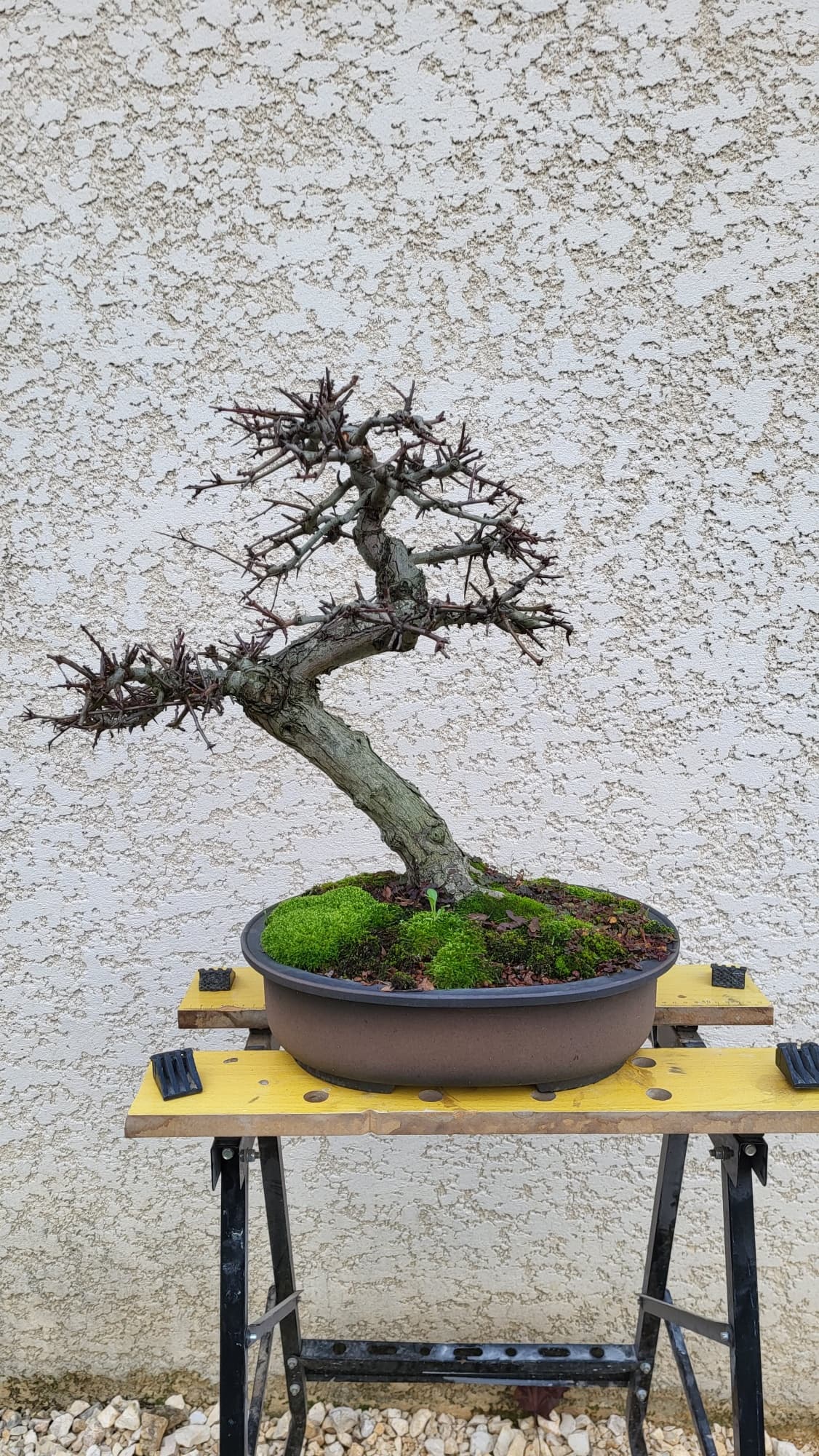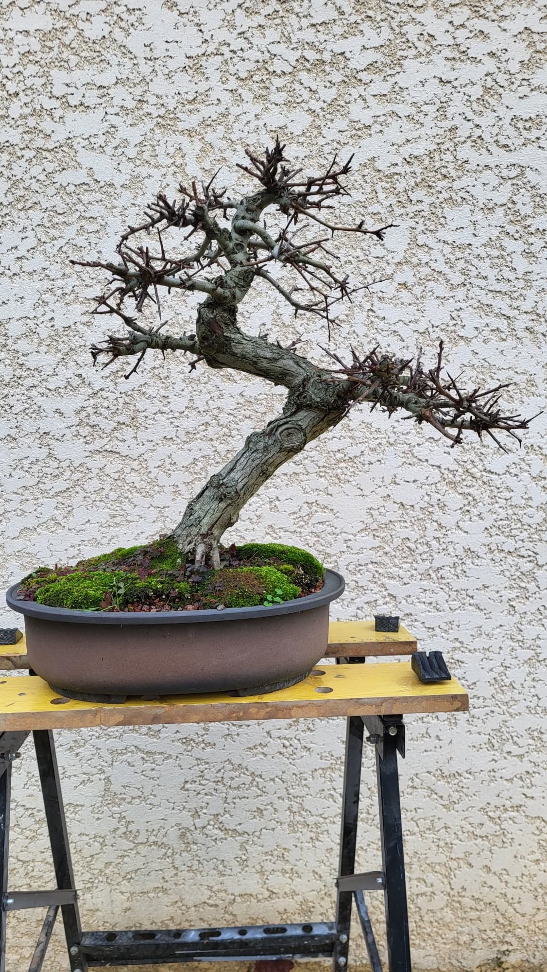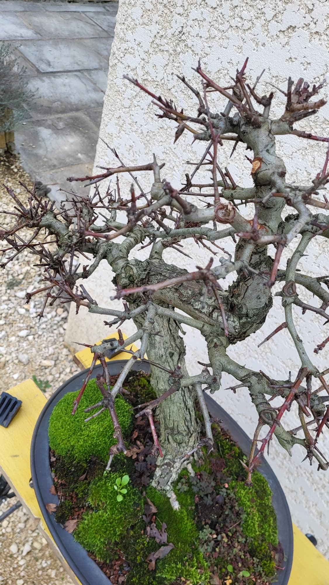 Si elle m’appartenait, j’aurai tenté depuis longtemps une marcotte juste au dessous du premier coude pour essayer de créer une semi cascade avec une tête (avec la première branche de gauche)