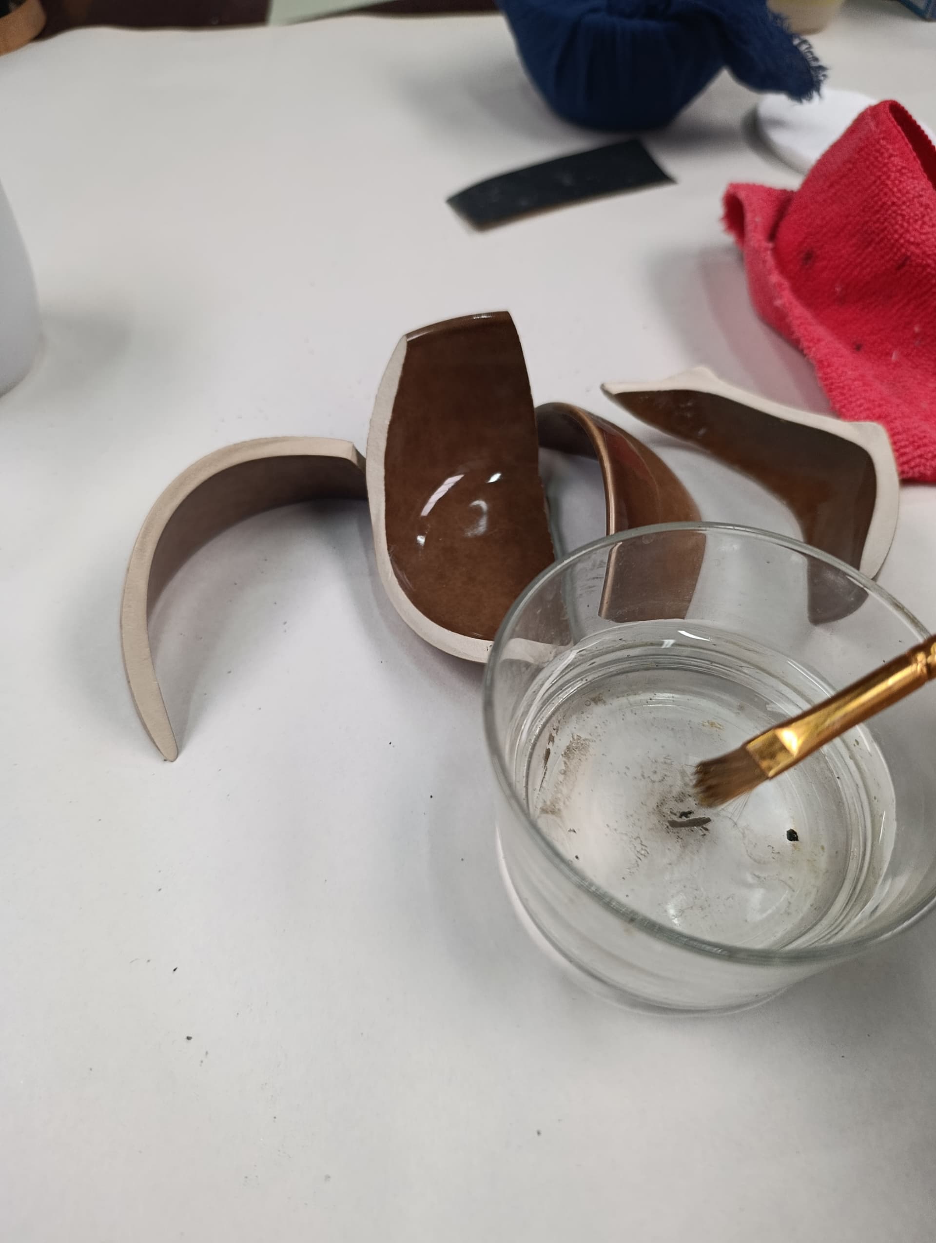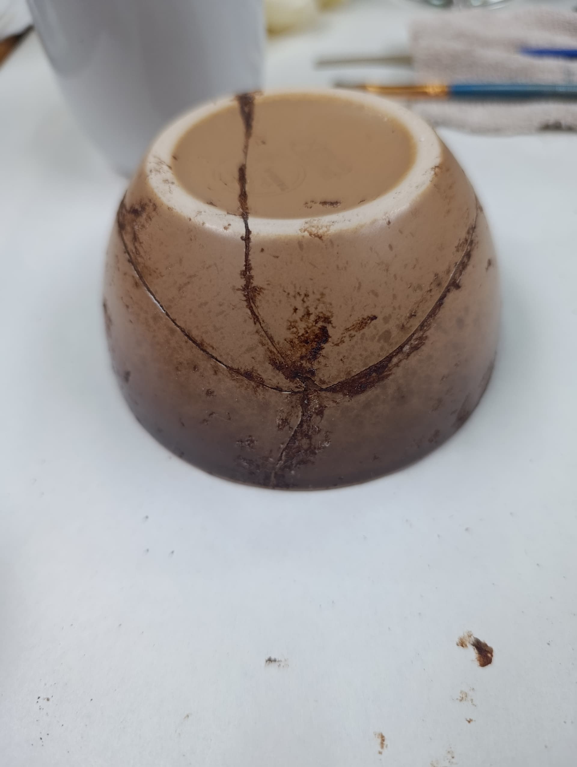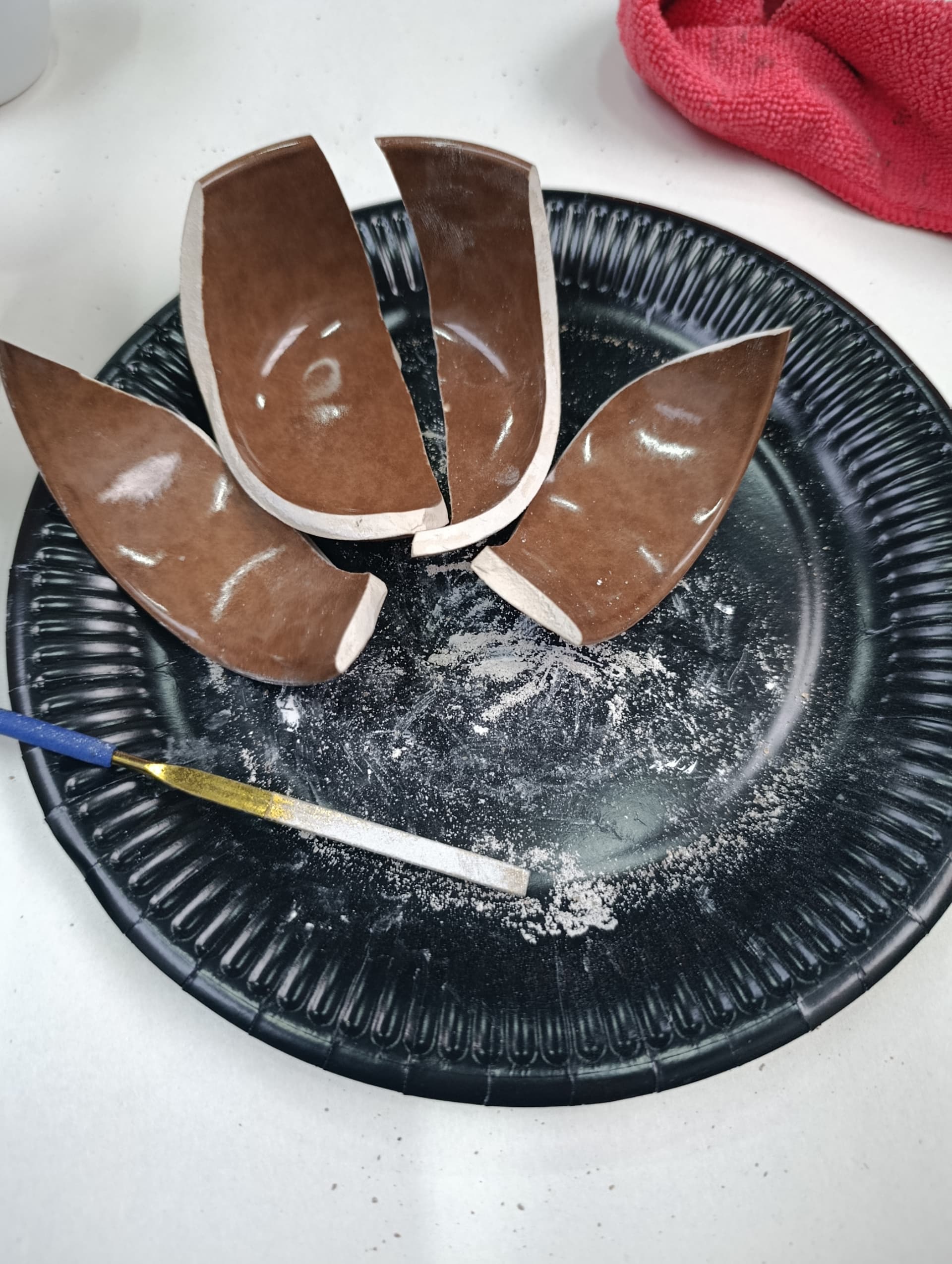 J’ai utilisé de la colle universelle ainsi que deux types de peinture acrylique, ce matériel est abordable est permet de retrouver l’essence du Kintsugi à moindre coup !