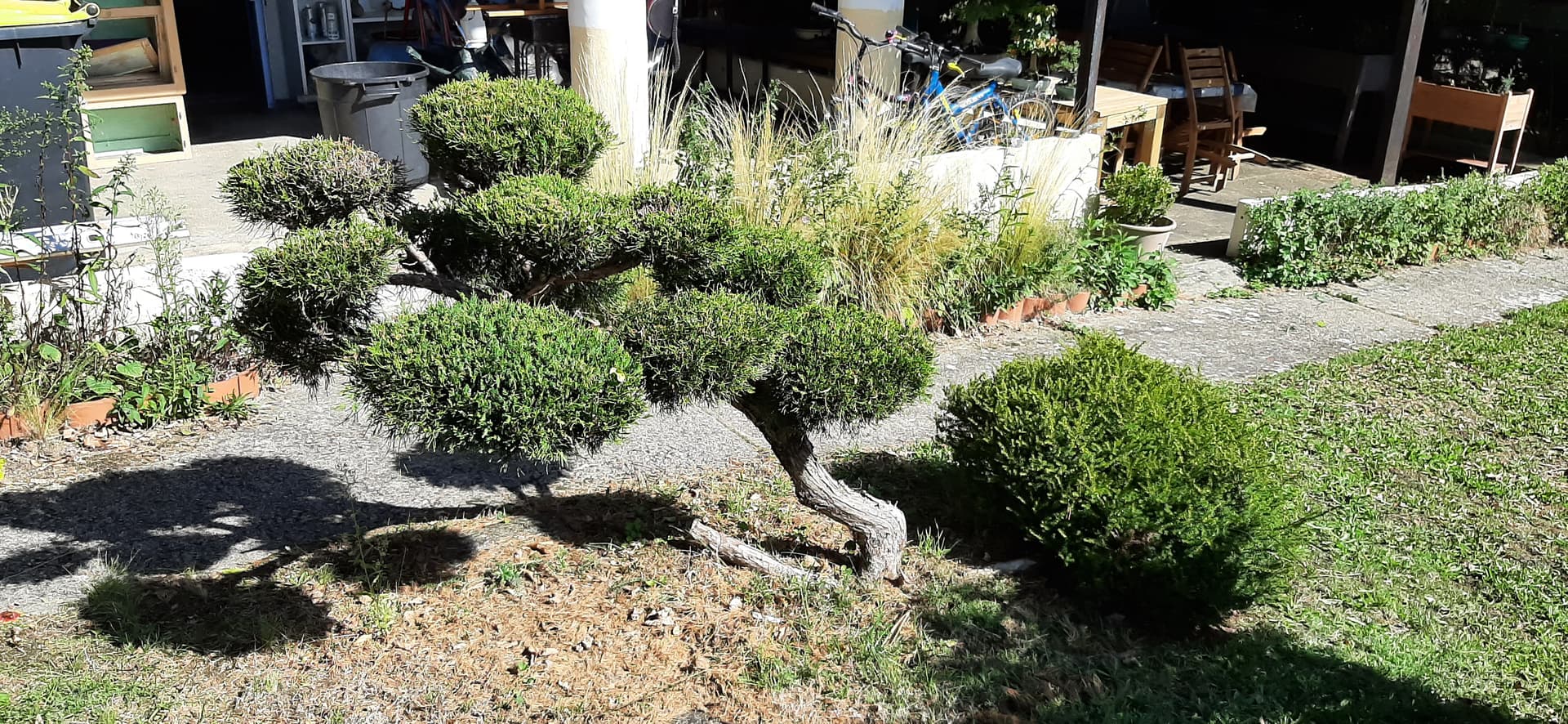 Mon premier essai est un genévrier commun, et j’avoue que ça va plus vite au taille-haie qu’aux ciseaux ![]()