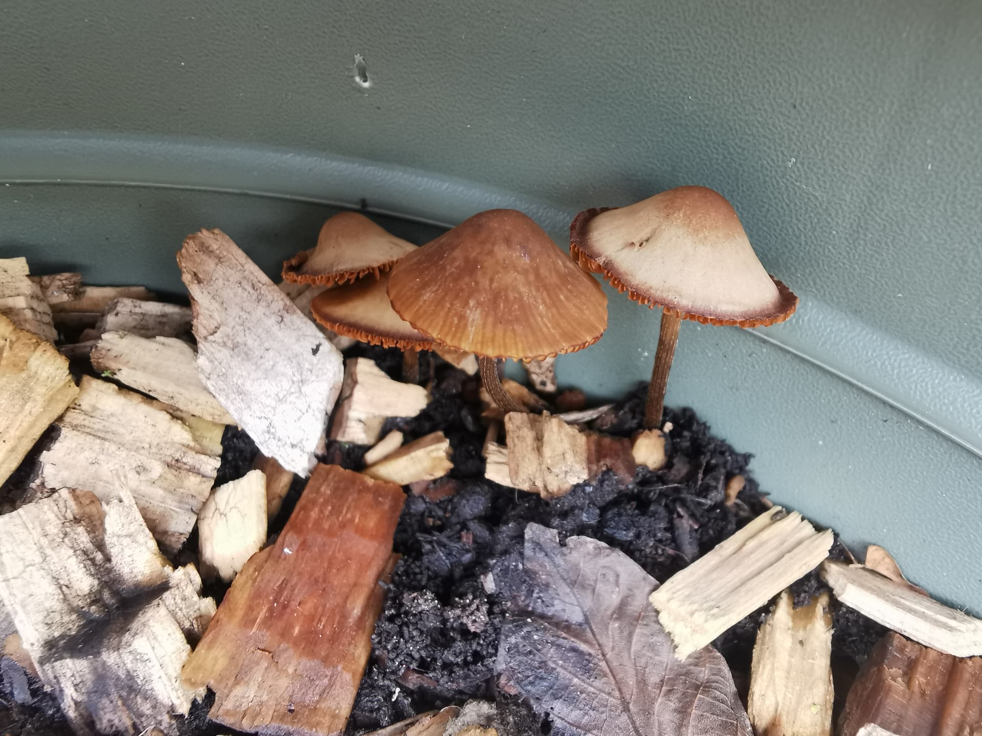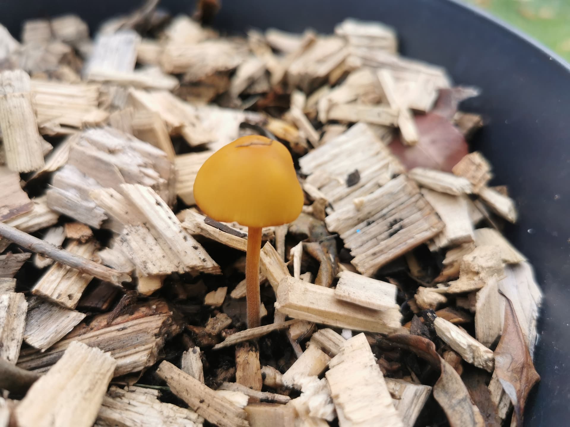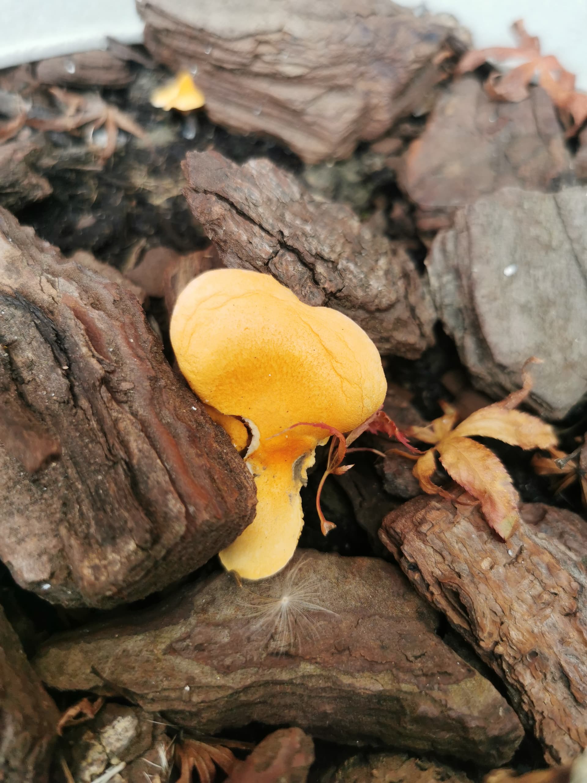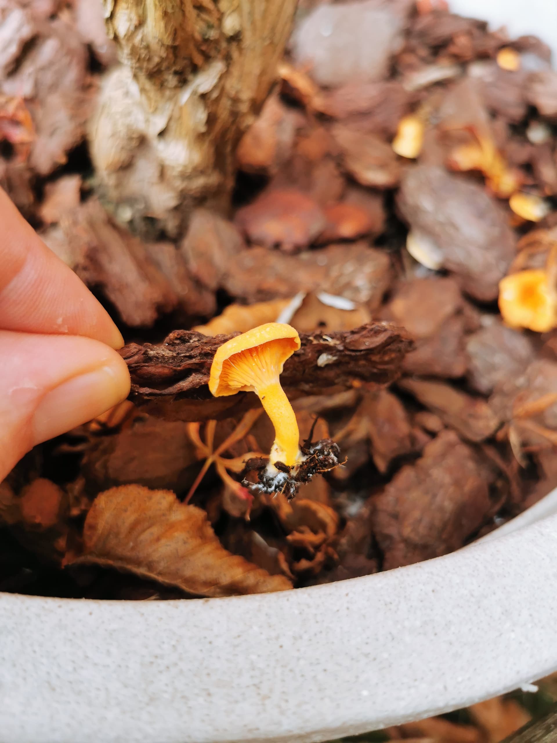 Ben quoi ..? C’est tout de même pas tous les jours qu’on rencontre Hygrophoropsis aurantiaca (fausse girole) dans nos pots. Tu as dû la ramener avec les écorces de pin qu’on voit dans la photo.