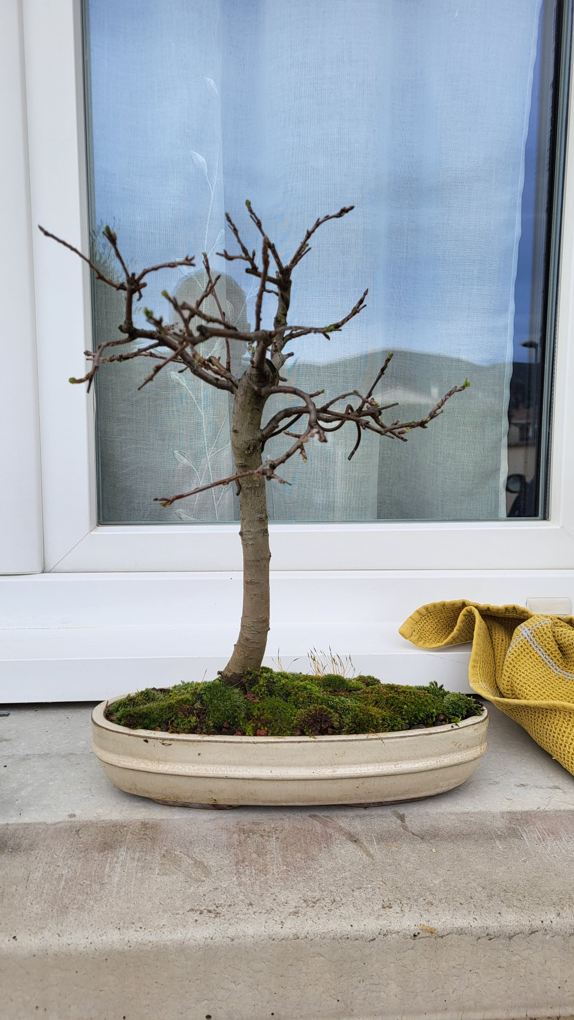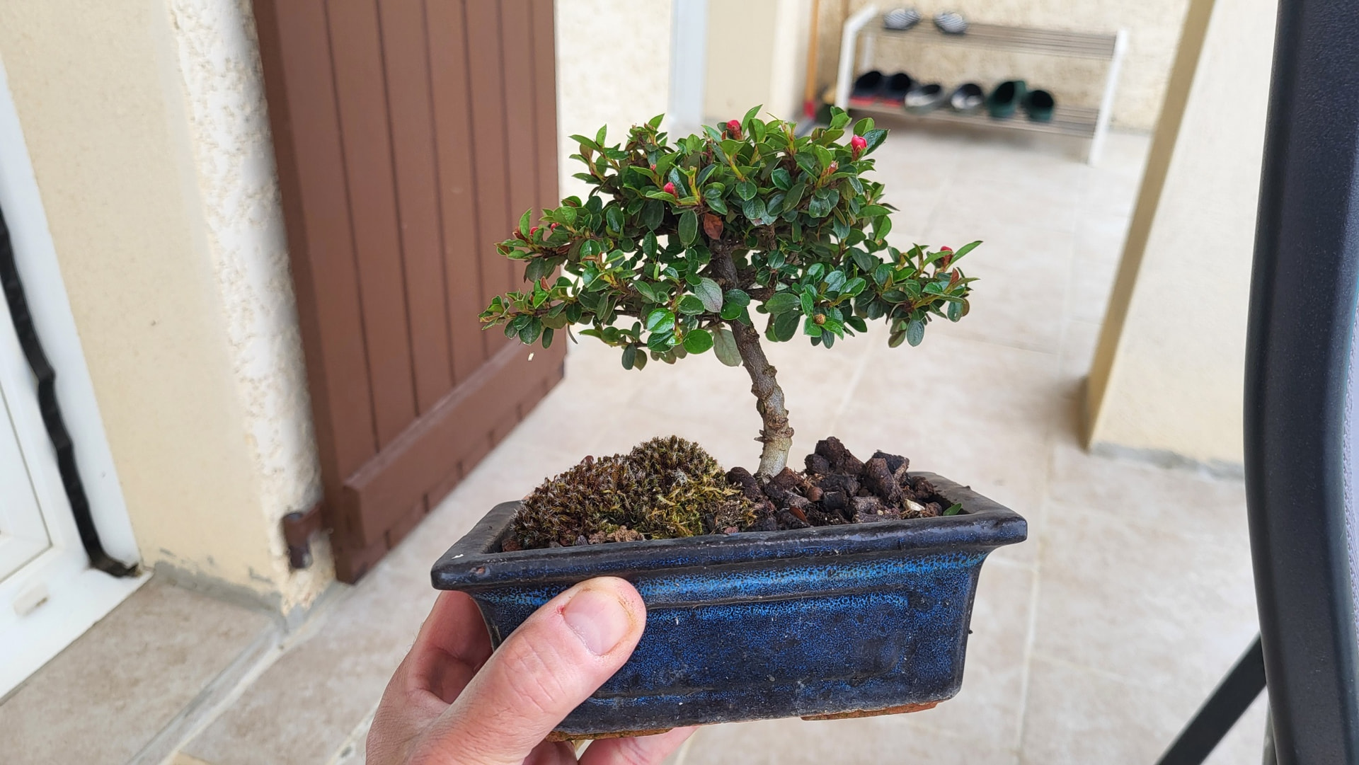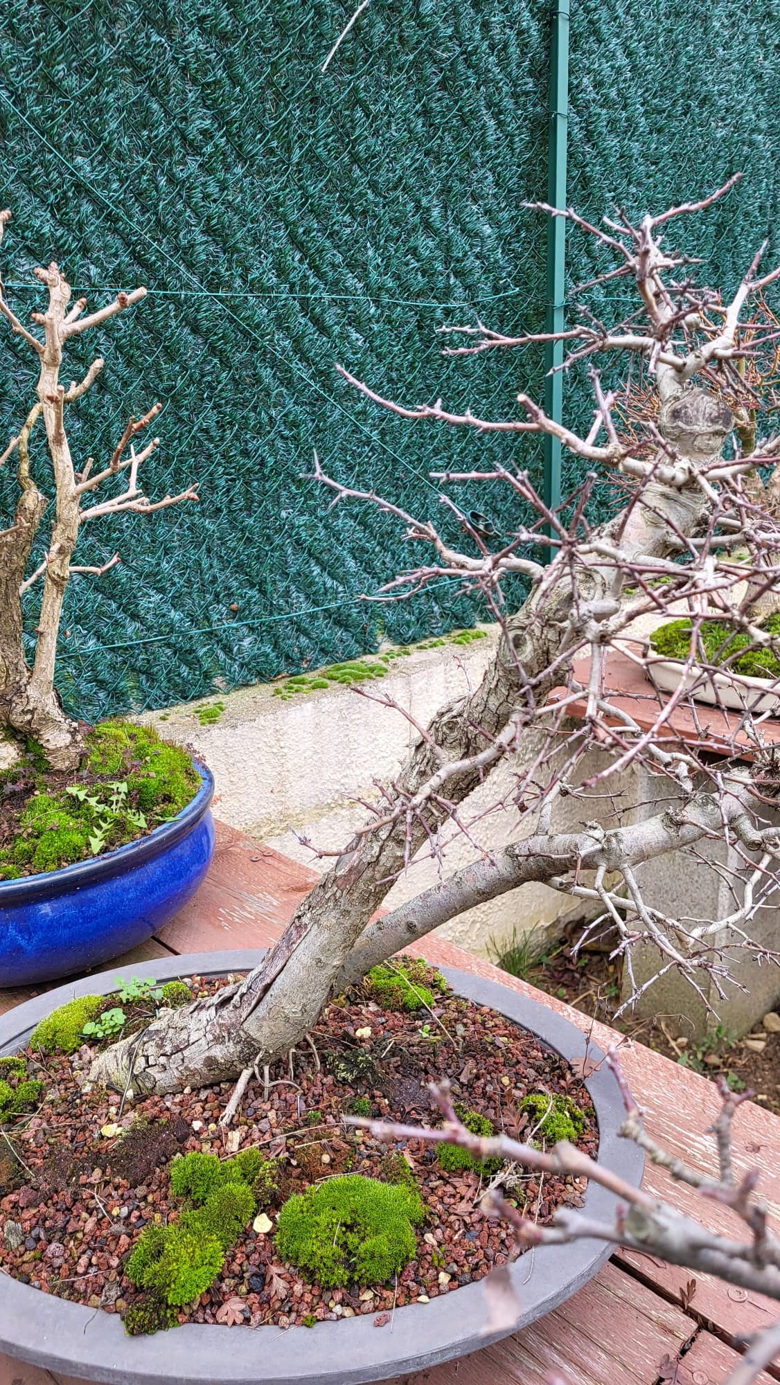 Un petit pommier il me semble, le pot est atypique mais l’ensemble me plait.