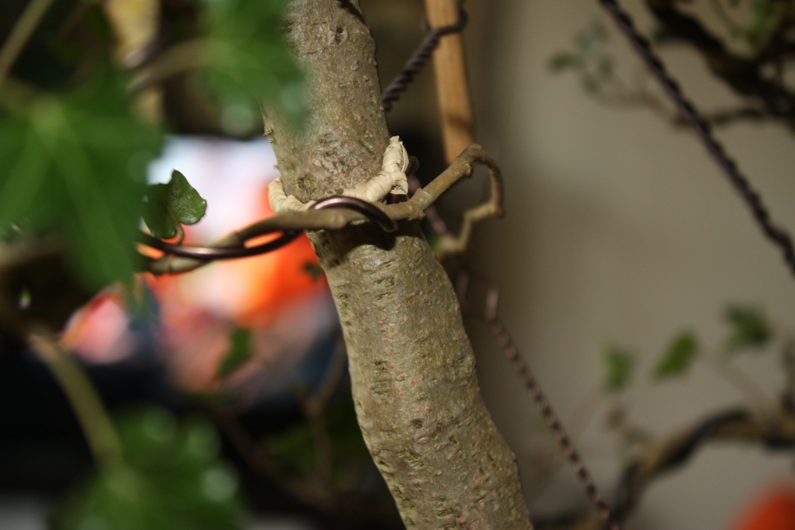 un detail d’une branche tres raide qui a ete raphiaté puis liguaturé et haubanné