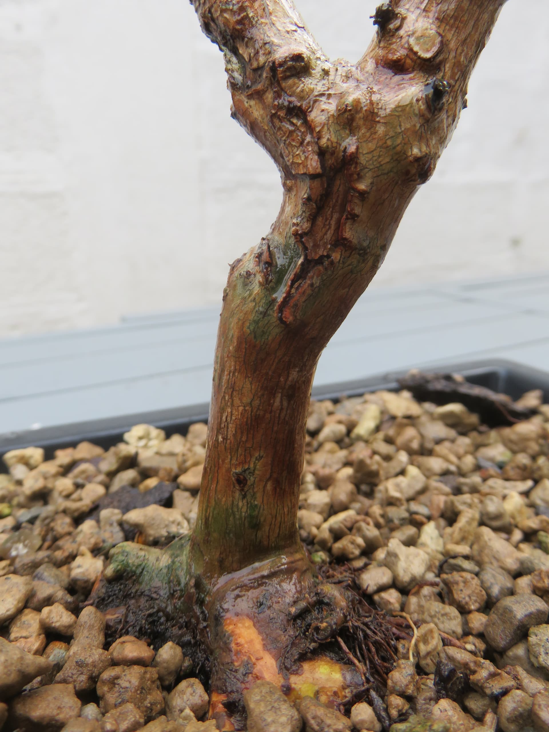 Racinaire sympa, bien plat et dense. J’ai juste raccourci les longueurs et supprimé les quelques racines qui se croisent ou ont poussé sous le pied, mais guère plus. Le nébari commence à s’affirmer et semble prometteur. Ici pour un plan rapproché (il présente mieux en vrai qu’en photo où il semble un peu déséquilibré)