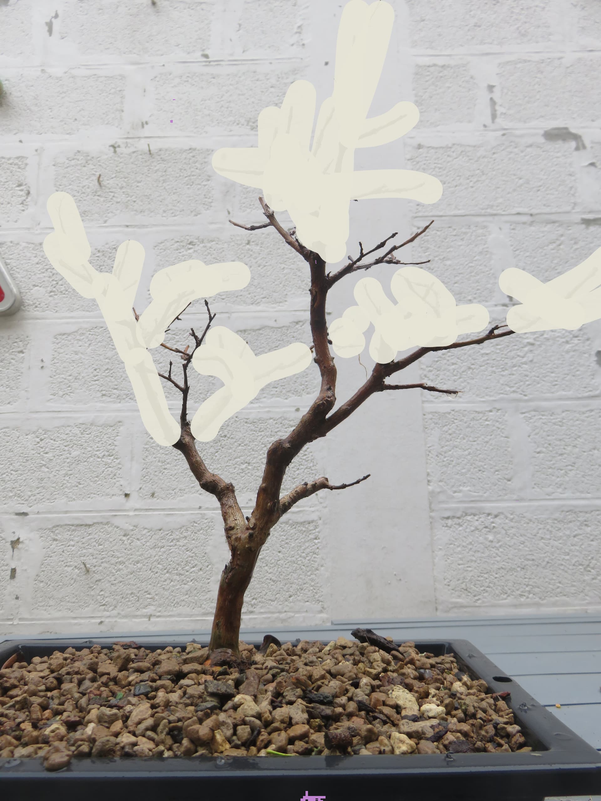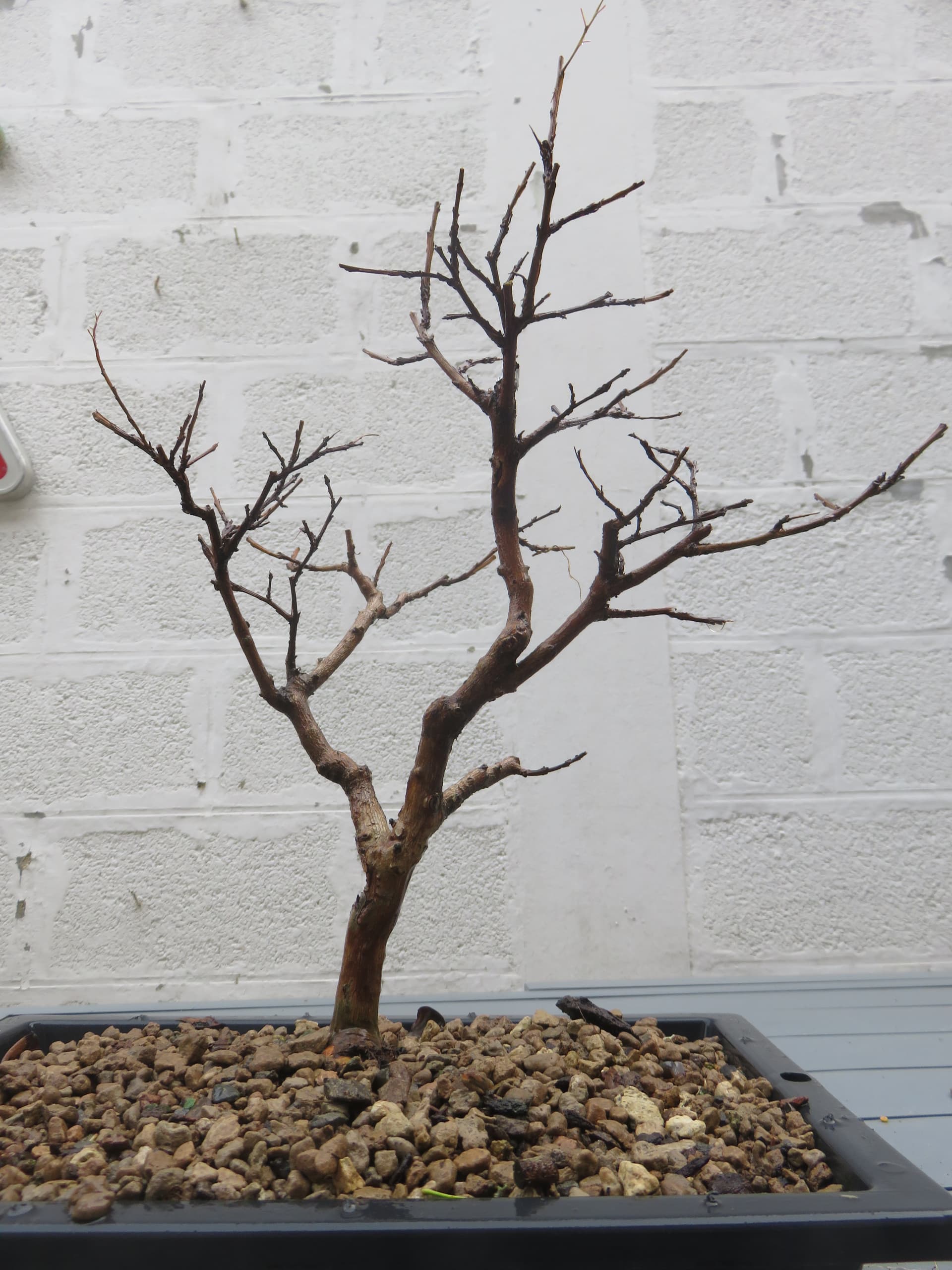 Je pense garder ce gabarit, et raccourcir progressivement les 2 charpentière en essayant de les densifier. Pour la branche principale, je ne sais pas encore s’il faut la raccourcir donc pour l’heure elle reste comme elle est, d’autant qu’elle présente plusieurs départs secondaires assez bien répartis. J’y vais mollo car c’est une espèce que je découvre. J’ai brossé le tronc pour faire apparaître l’écorce lisse, c’est ce qui fait le charme des Lilas des Indes.