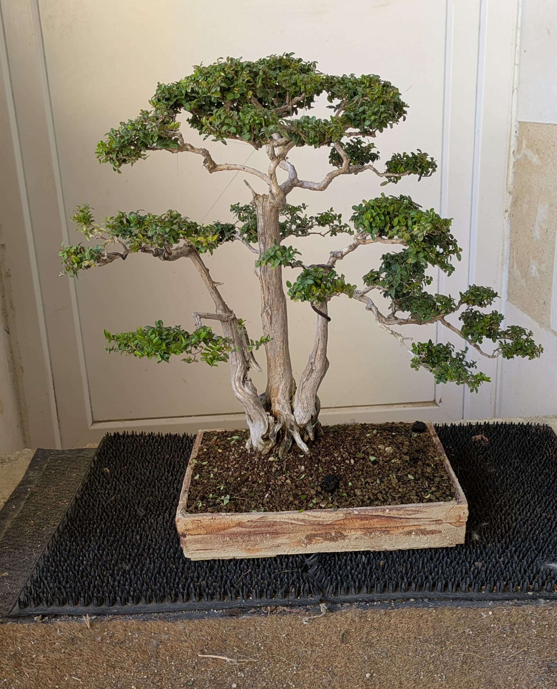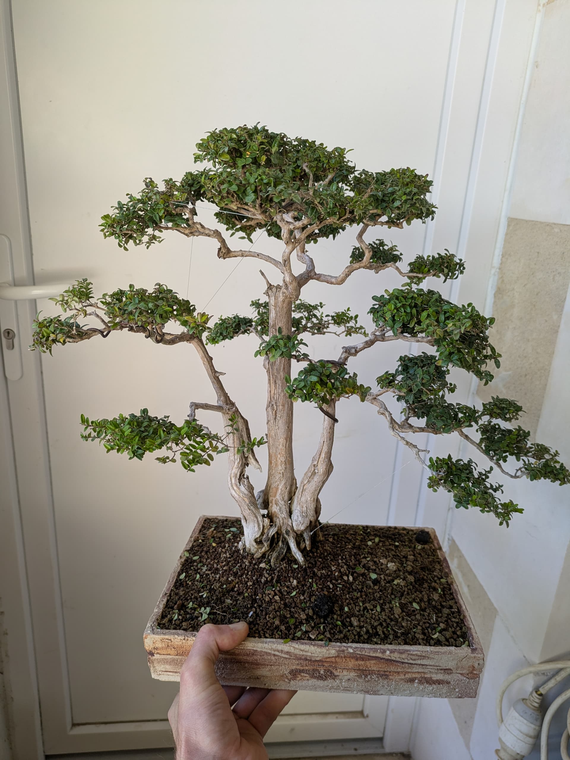 Comme les autres j’ai cru a une caisse en bois! J’aime bien ce contraste géométrique du pot et des mouvements du tronc! Il a une jolie teinte d’hiver le feuillage.
