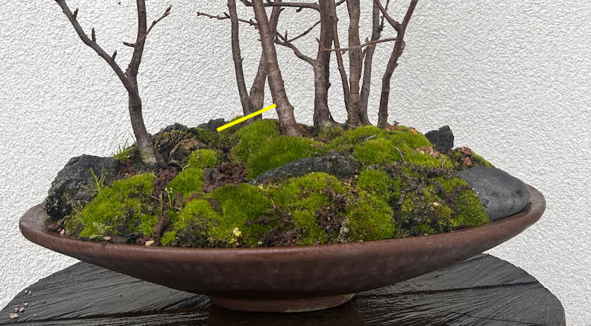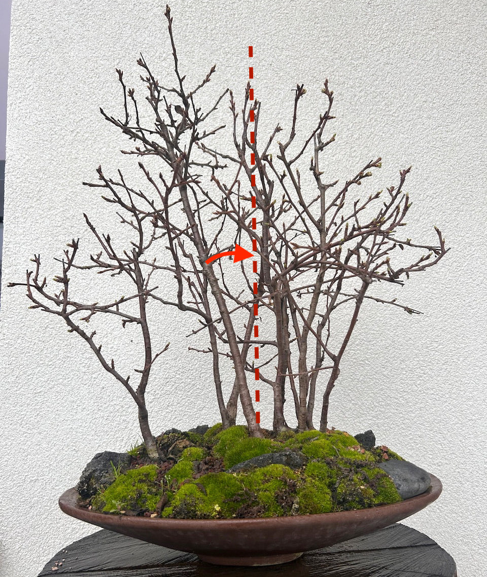 Il faudrait que tu testes à la main si tu arrives à doucement redresser vers la verticale l’arbre le plus haut, sans forcer sur les racines pour évaluer la marge de manœuvre. Il faut pousser sur le tronc près des racines pour ne pas le tordre : vue la forme des autres troncs, une courbe sur celui-là détruirait l’homogénéité du groupe.