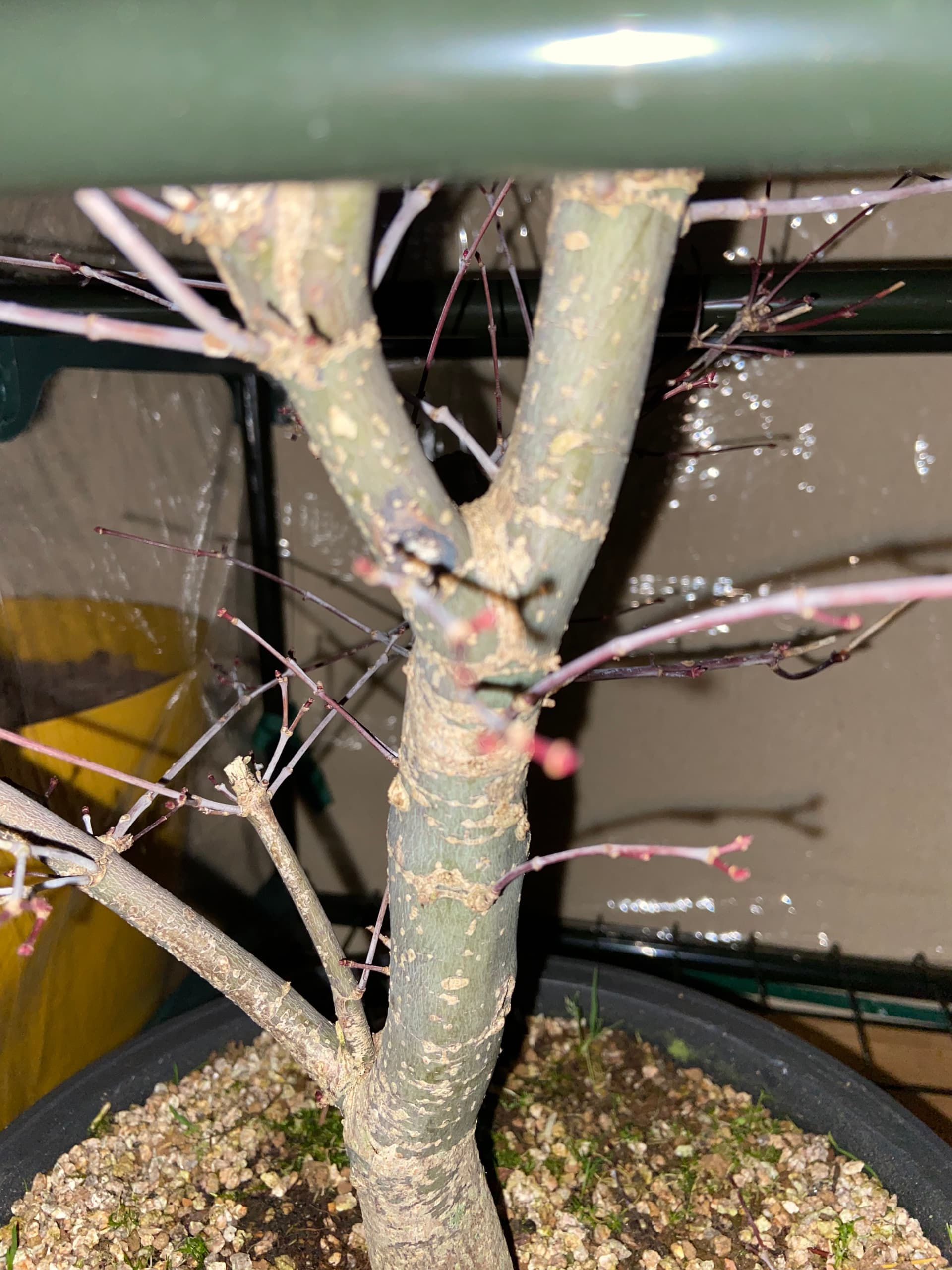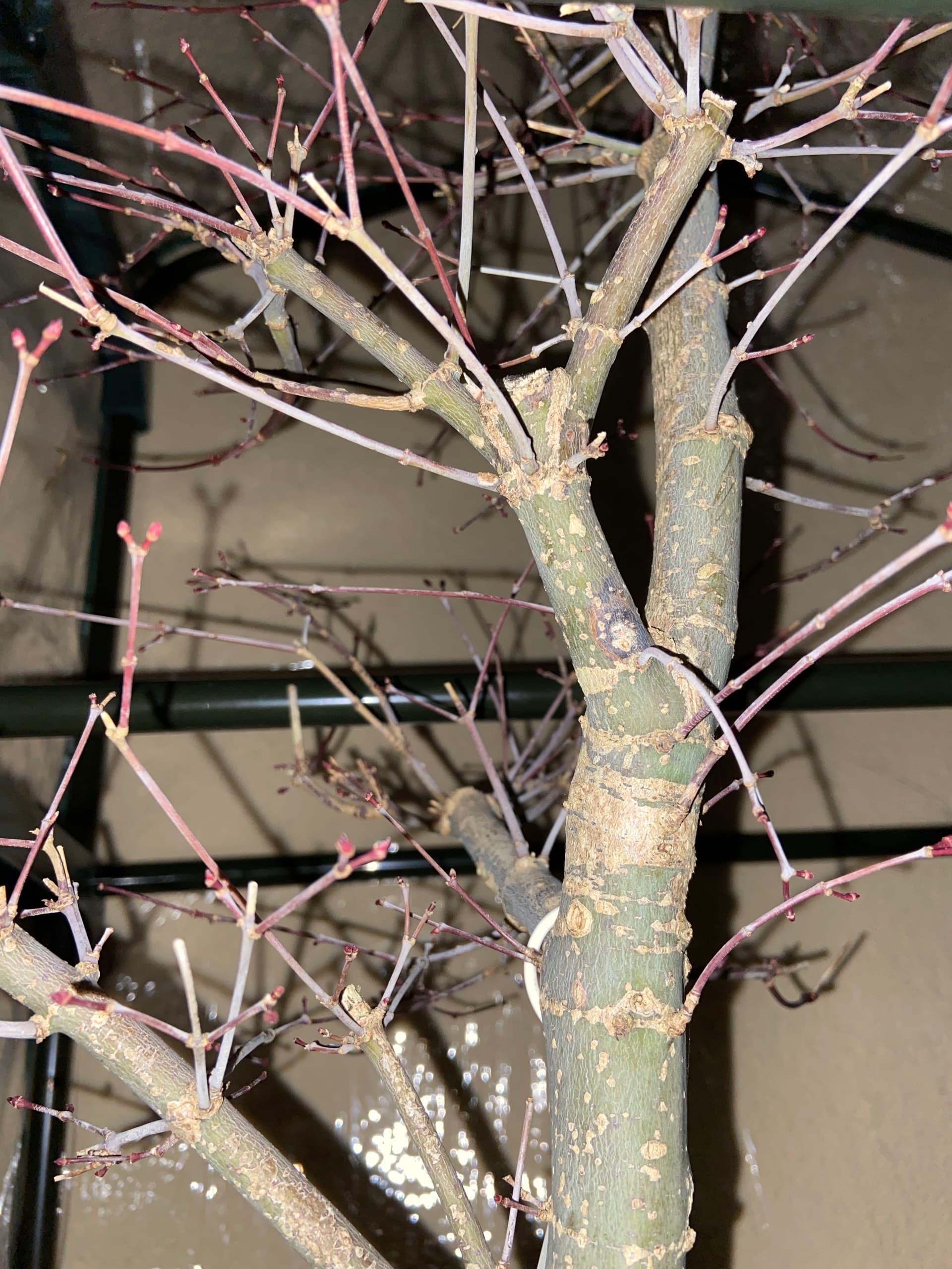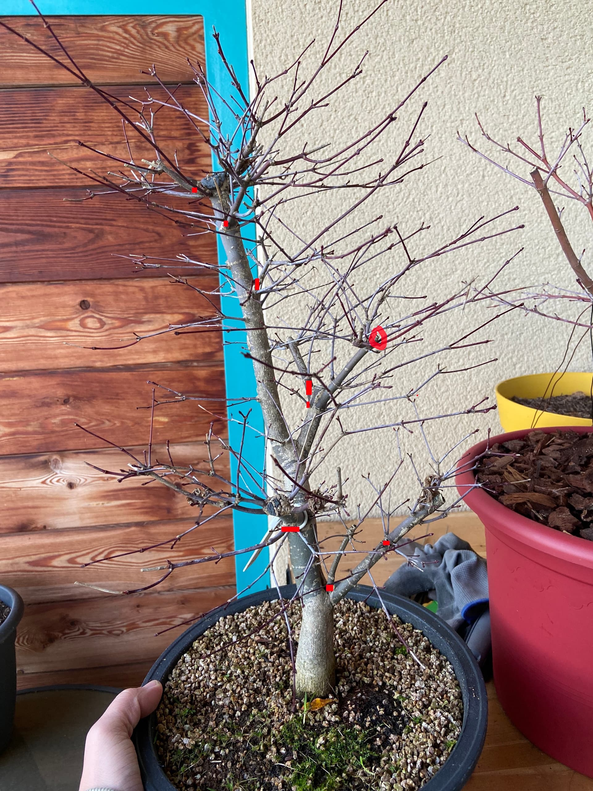 Je me permets d’ouvrir un sujet du mon acer palmatum Deshojo, en cours de structure. J’ai acheté cet arbre il y a bientôt 6 mois sur Bonsai Plaza ( 10 ans) , et je suis actuellement perdu dans cette période de taille de structure, il a une bonne quantité de branches et des entre nœuds a certains endroit assez longs. Il sera rempoté au début printemps en pot bonsaï. J’ai mit en rouge certaines coupes que je pense être possible. Merci beaucoup pour vos idées !