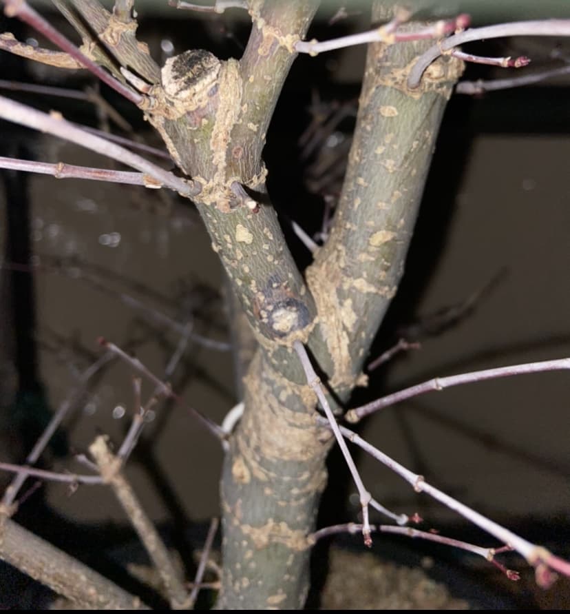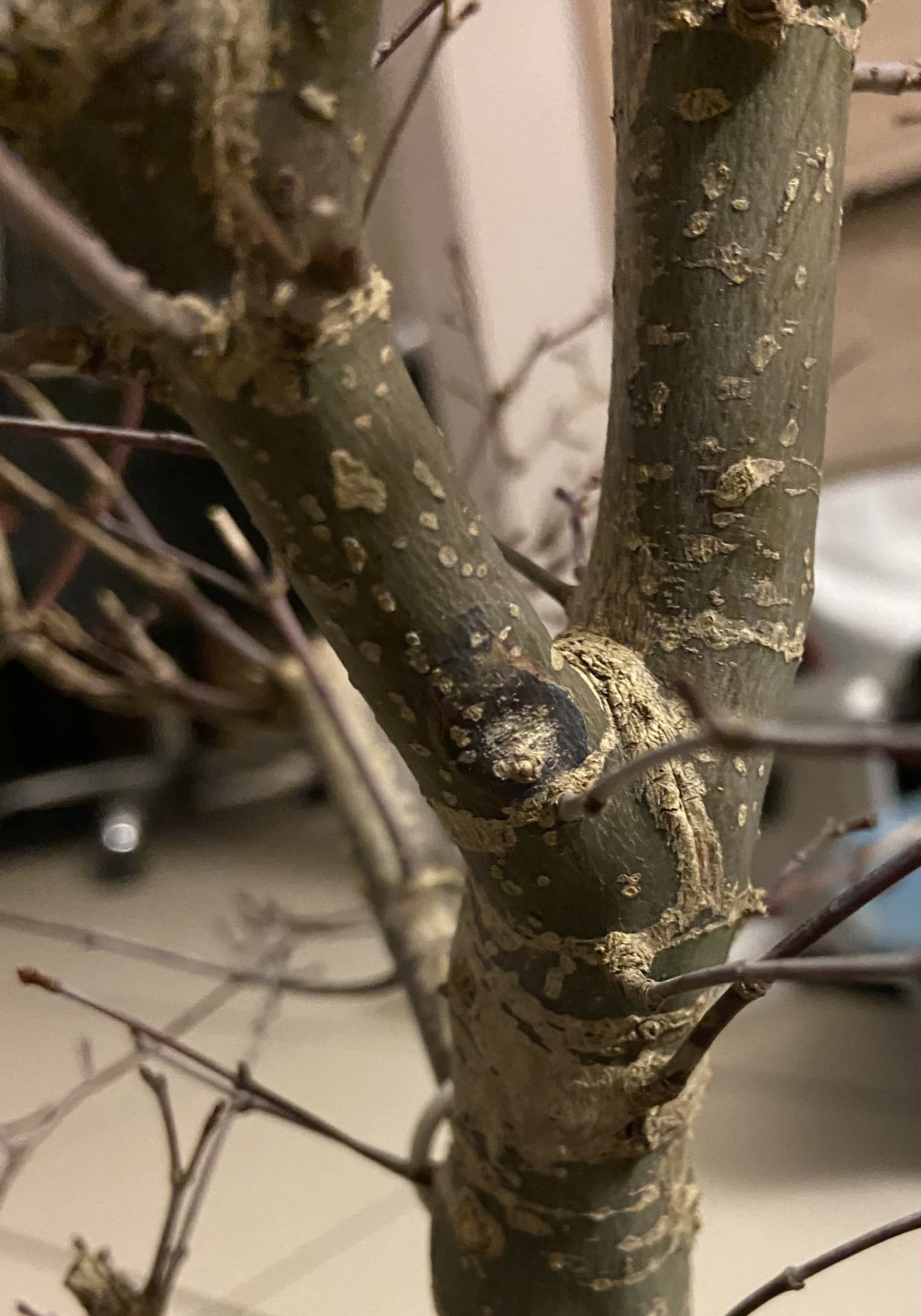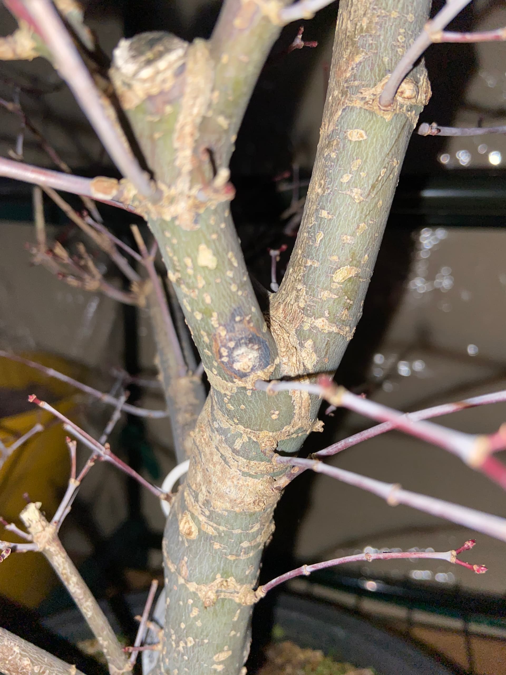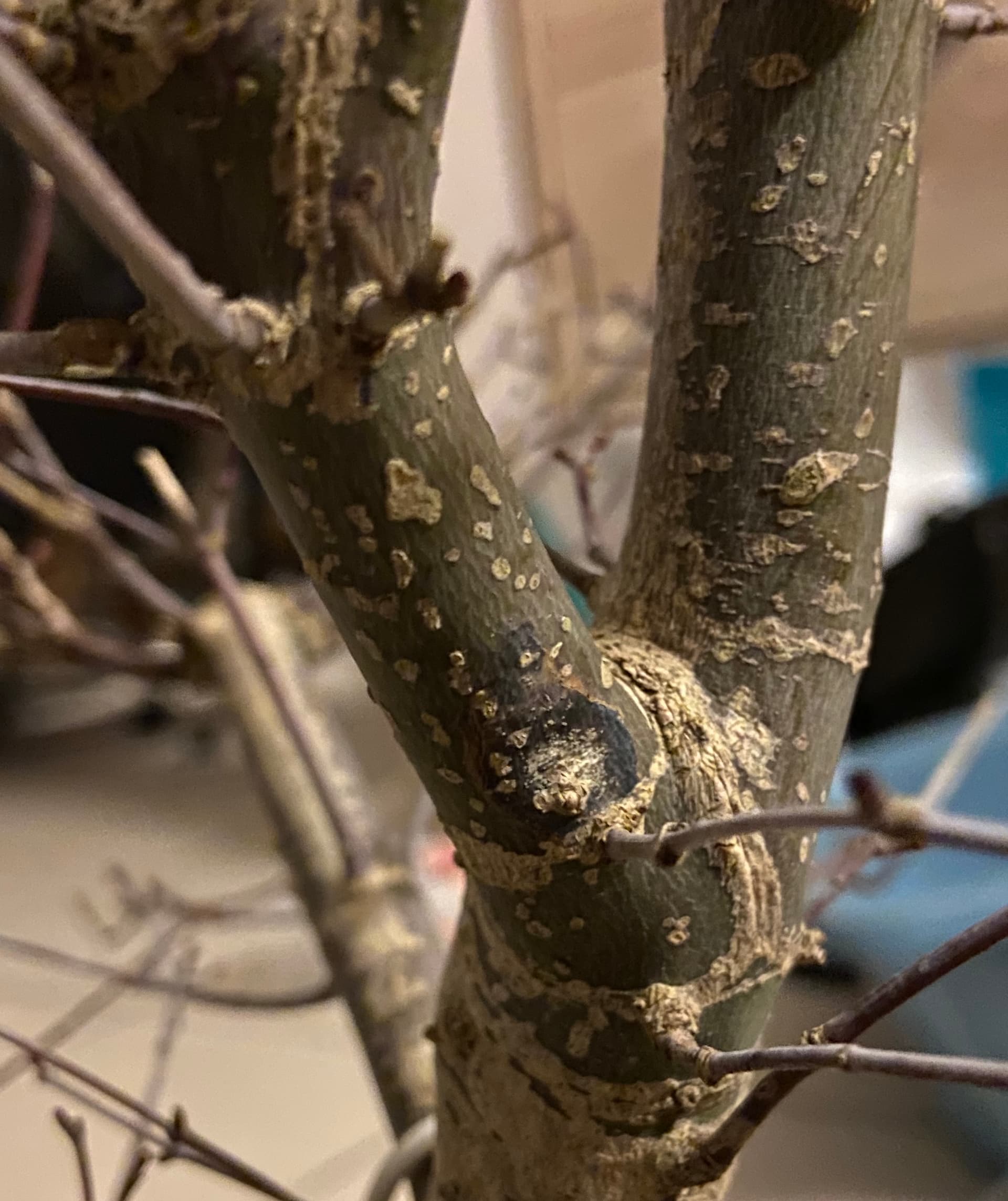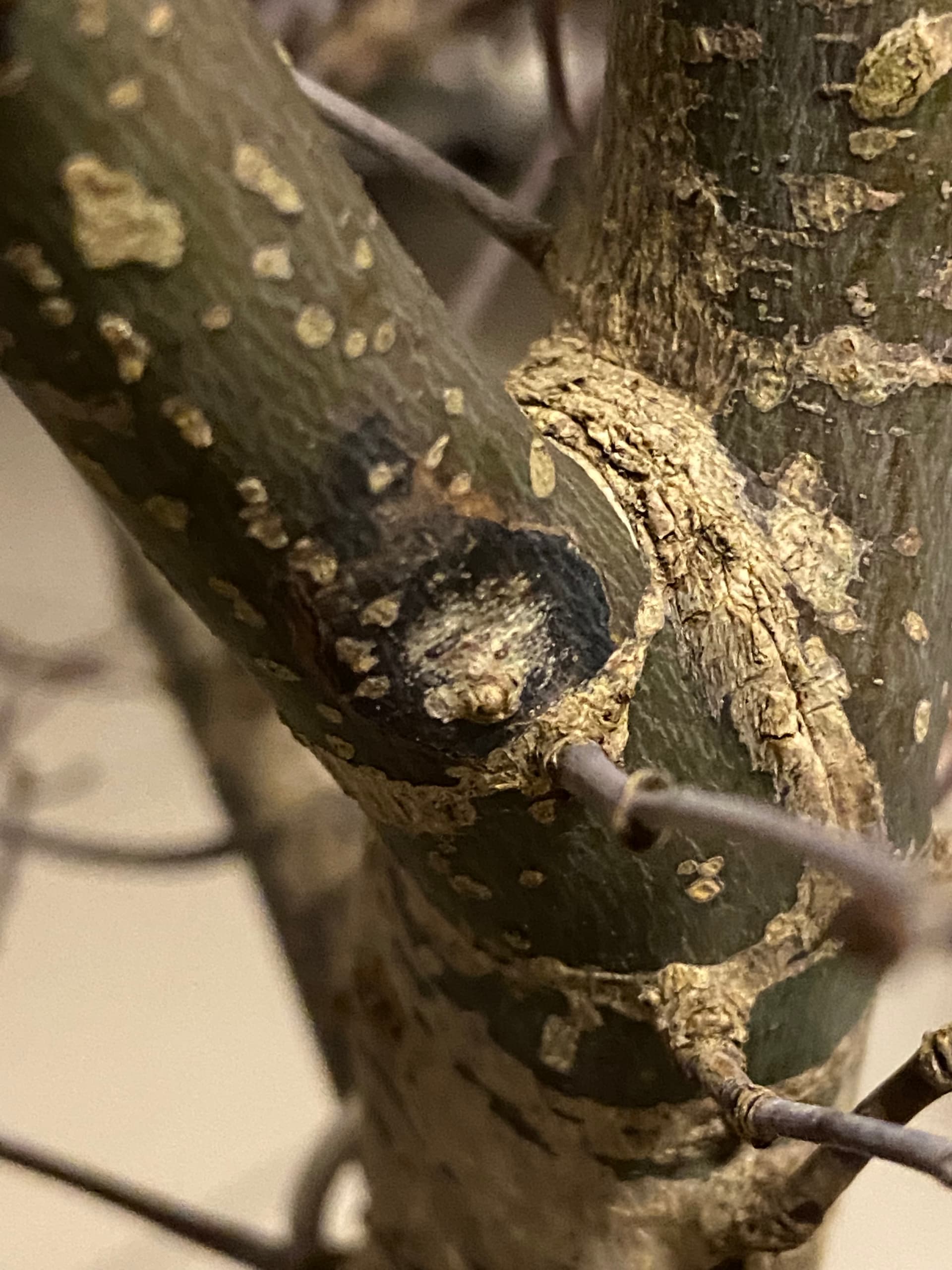 Merci pour vos réponses, j’ai rentré l’erable le temps de prendre une photo, voici plus de détail en espérant que ca vous aide mieux. J’avoue qu’une verticilliose me fait flipper, vous pouvez voir que la branche au dessus n’a pas l’air touchée, mais au dessus il y a eu une ancienne coupe mastiqué par le vendeur.