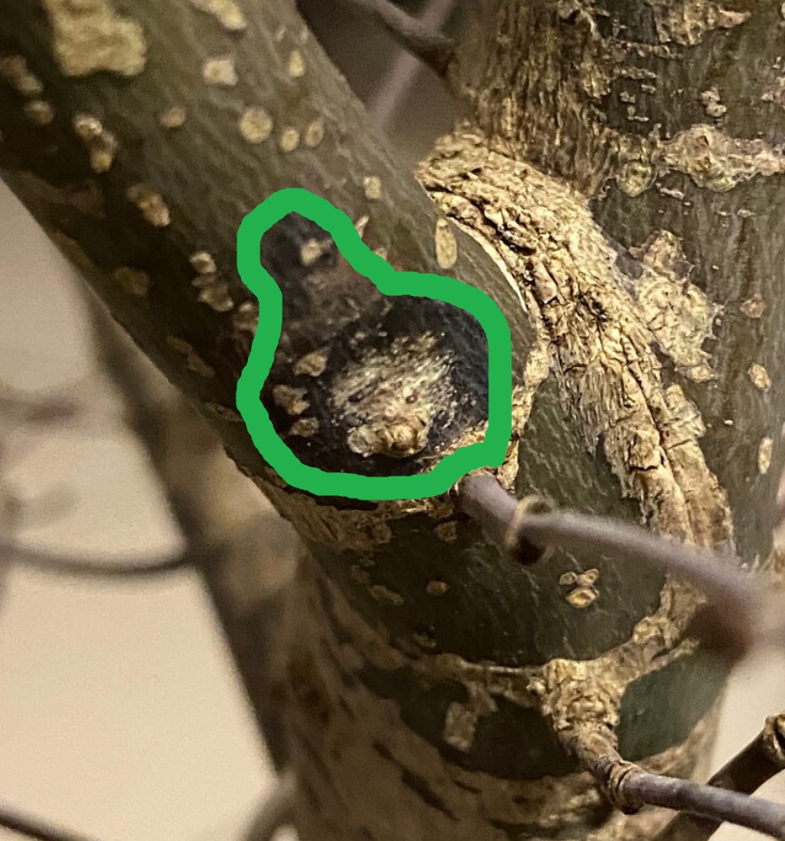 je ne sais pas si c’est un choc car la branchette en dessous n’est pas cassée, mais pour moi, toute la zone à l’interieur de cette ligne verte est morte, et la ligne verte représente le cal cicatriciel que tu devrais voir se developper pendant la saison de pousse… si c’est juste un problème localisé (traumatisme etc) … je n’ai pas de boule de cristal ^^