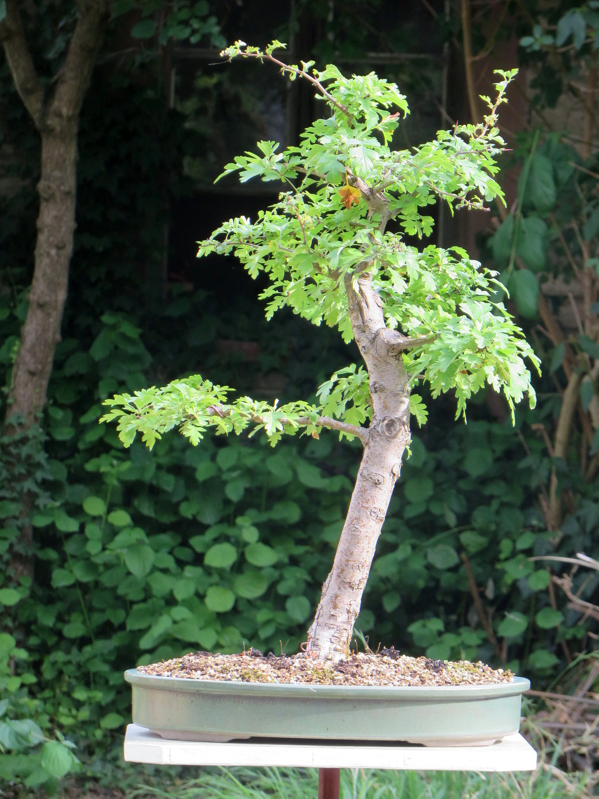 De plus dans le cas de cette aubépine, cette première charpentière viendrait comme une recherche par l'arbre d'un équilibre momentanément perdu avec ce tronc incliné.