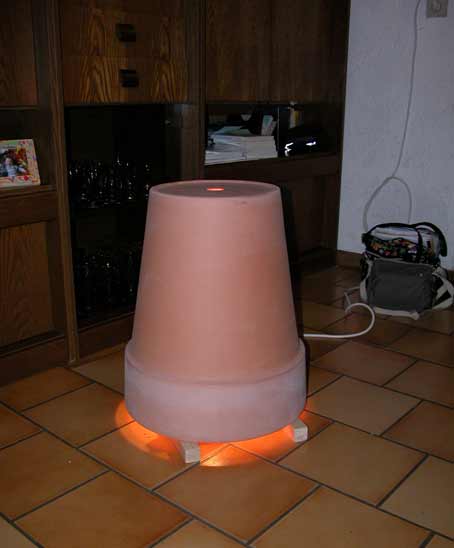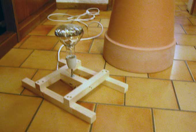 J’y mets un spot infrarouge de 250 watts, un spot comme ceux que l’on utilise pour les animaux, les poussins en couveuse par exemple.