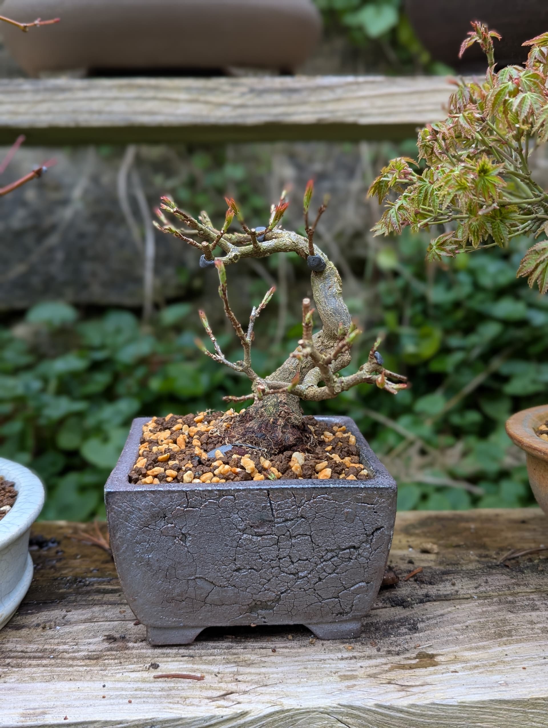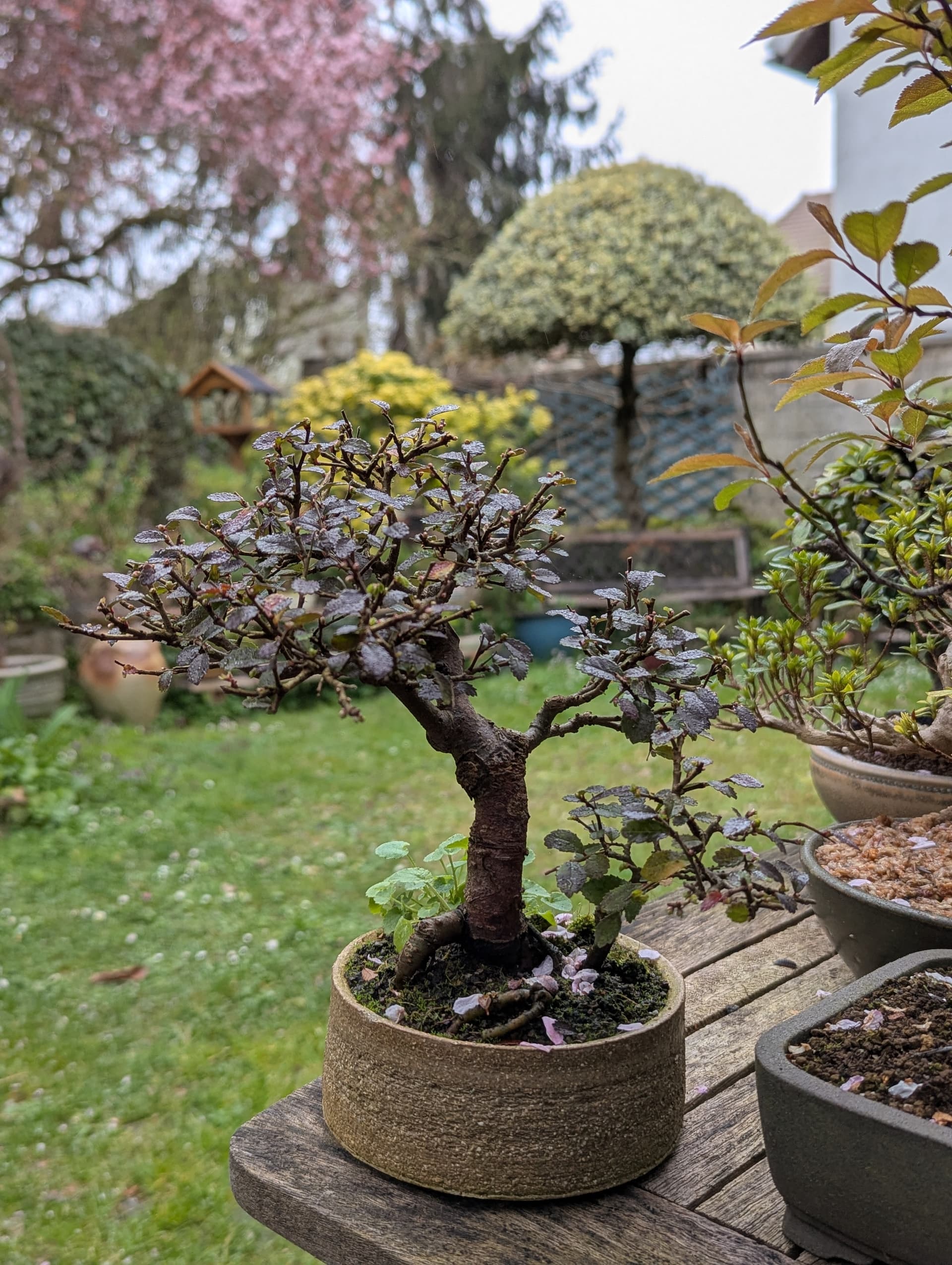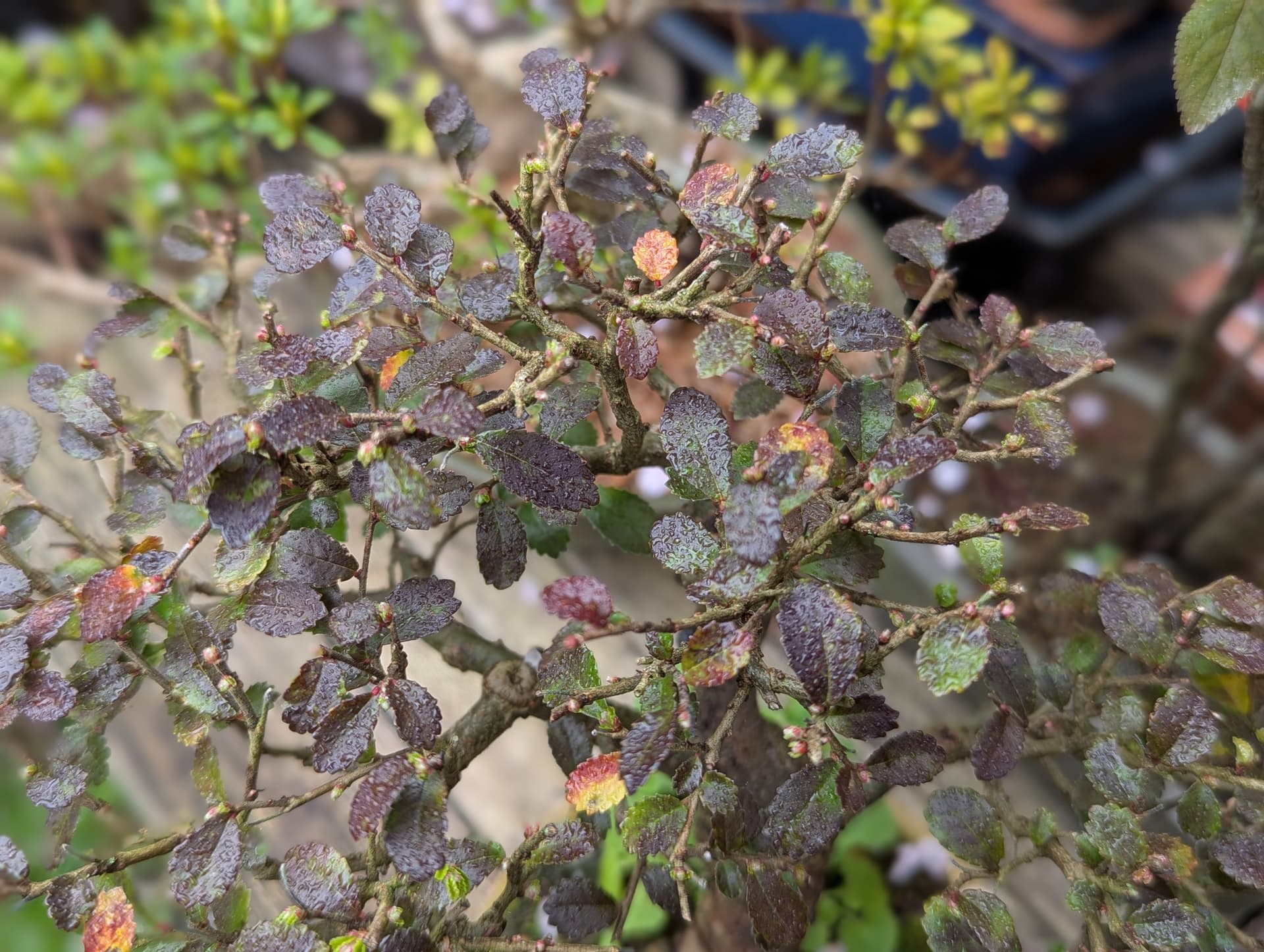 Le petit prebonsai présenté au dessus commence a avoir les feuilles qui se teinte mais je ne suis pas sûr qu’il ait hérité de la couleur de feuille de celui ci…