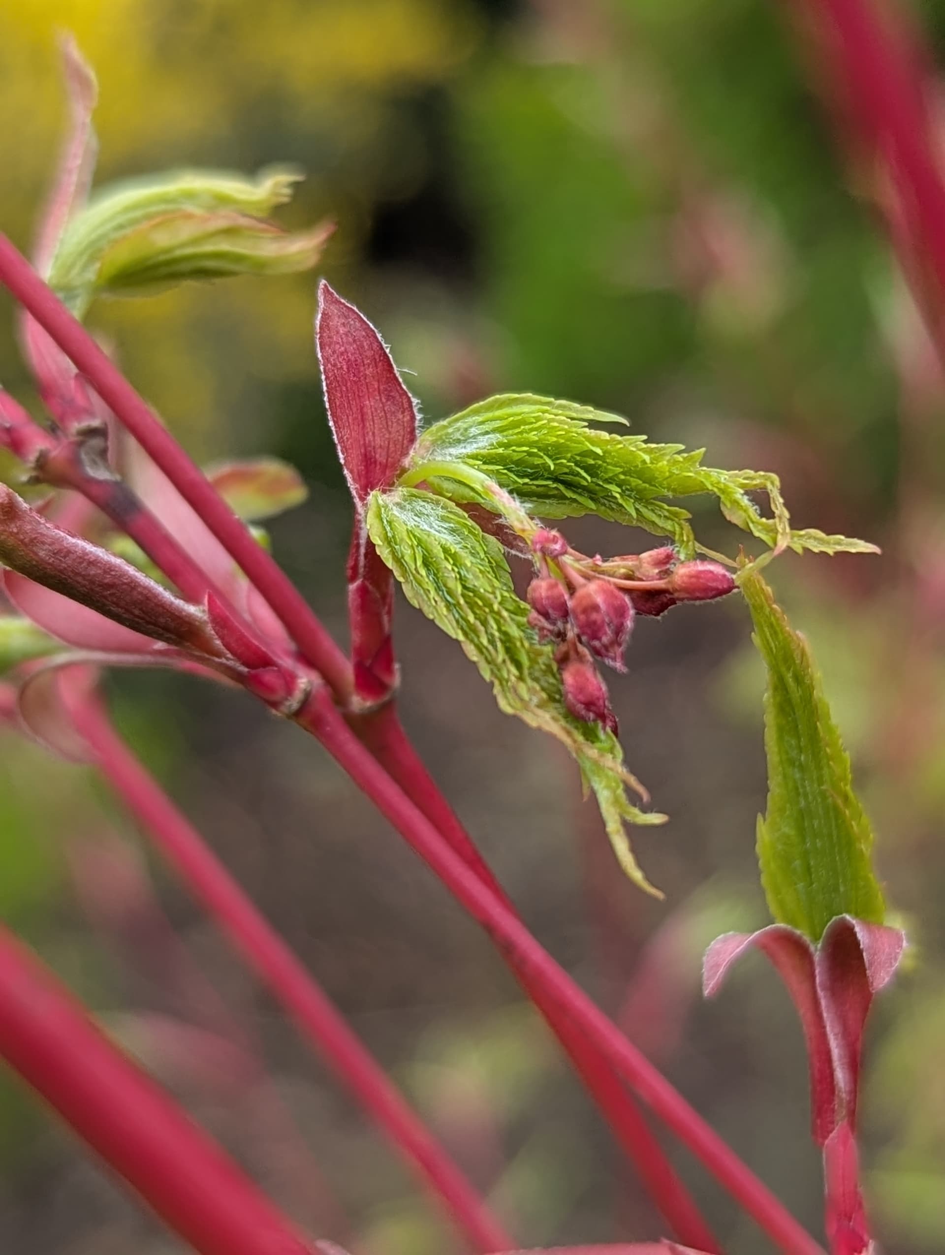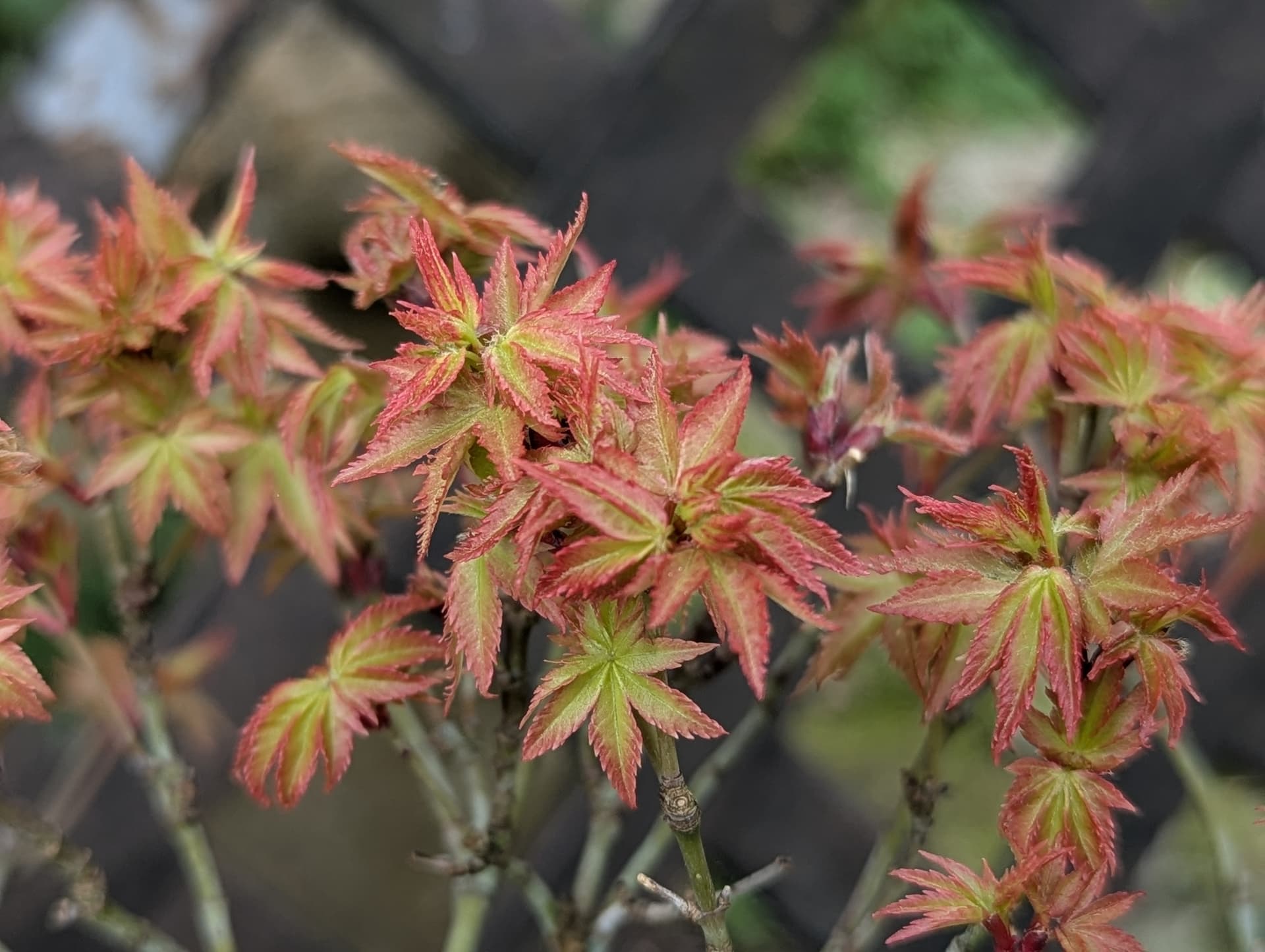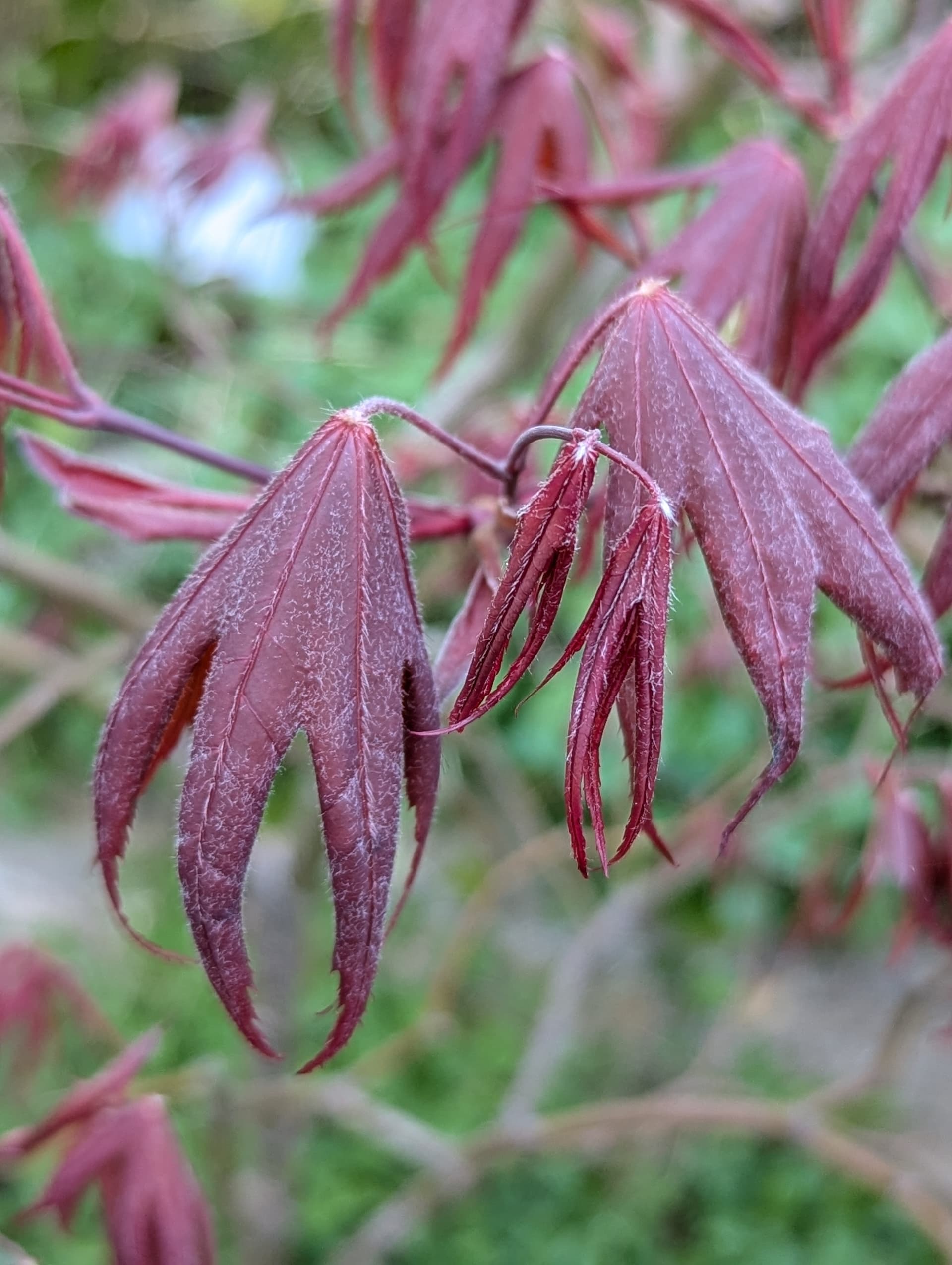 Un de mes ormes de chine qui a revêtu une très belle couleur pourpre avec le gel de cet hiver (l’autre est resté parfaitement vert…) On aperçoit tous les petits bourgeons qui débourrent ![]()