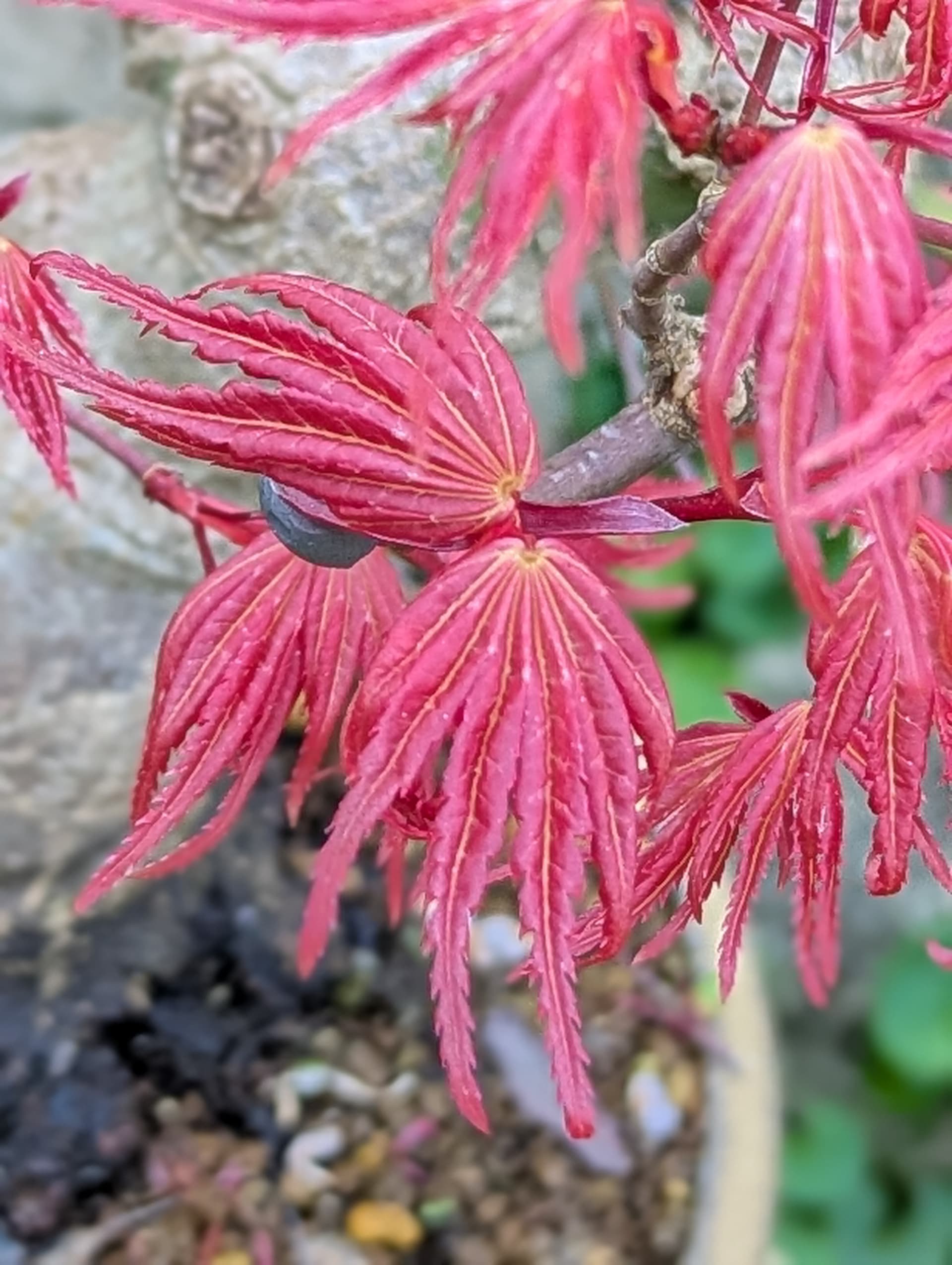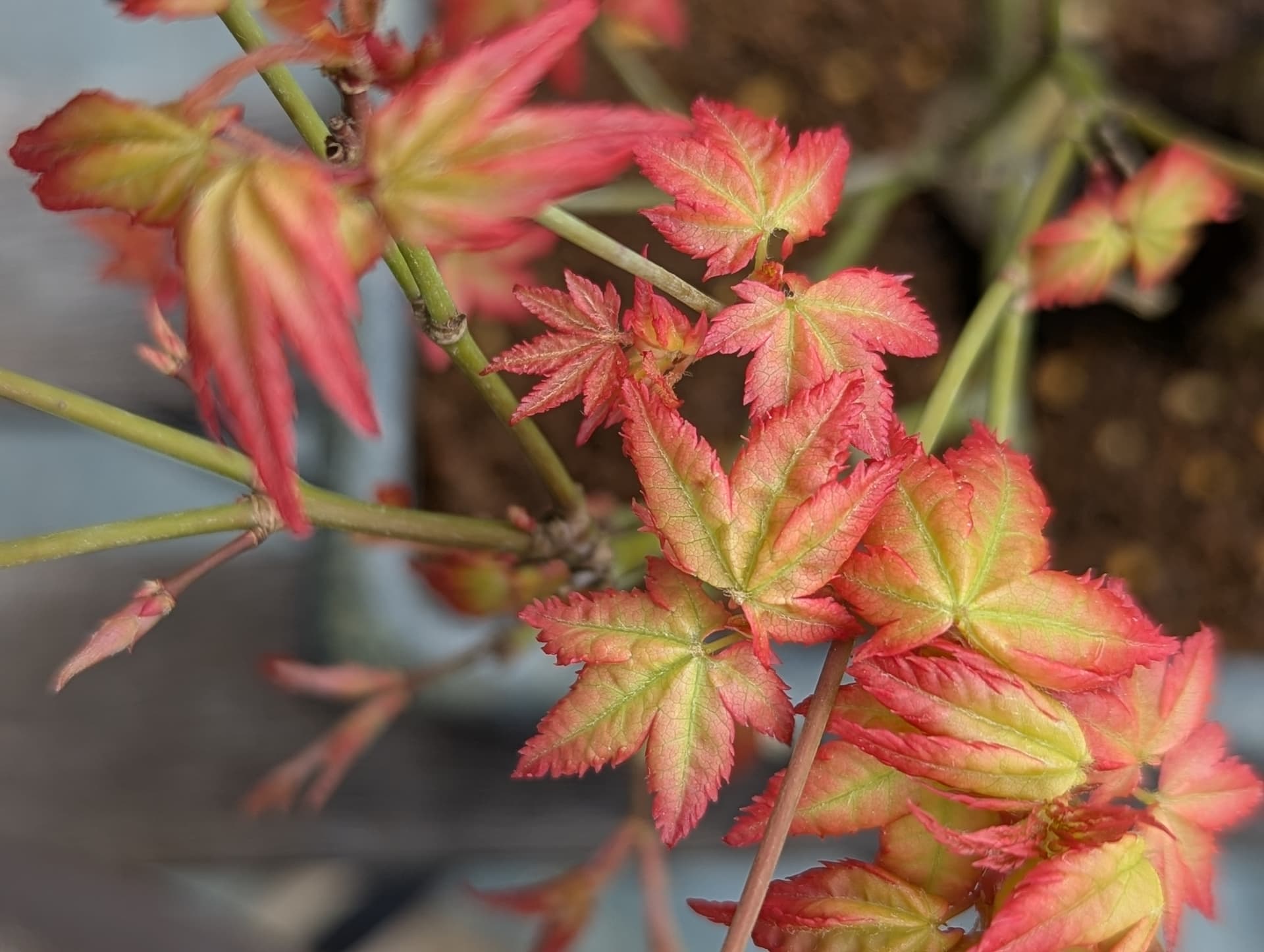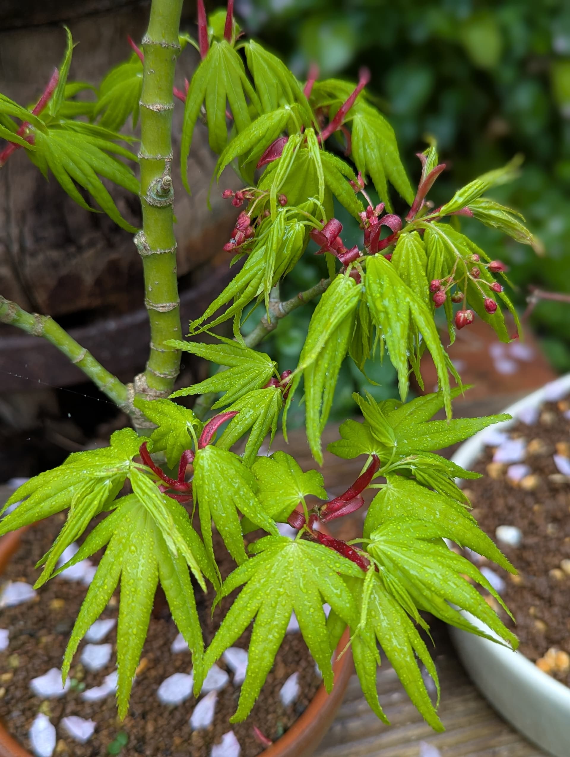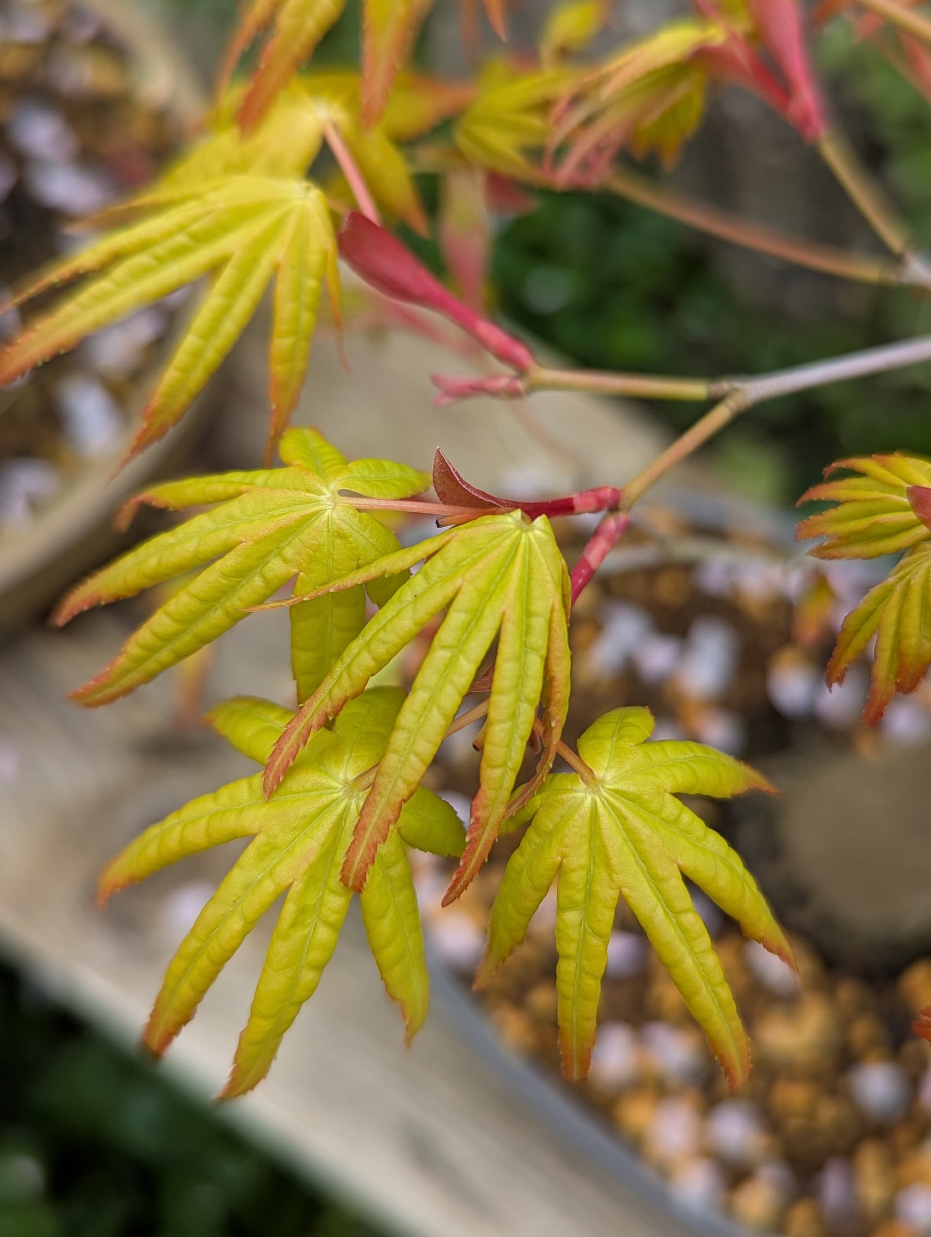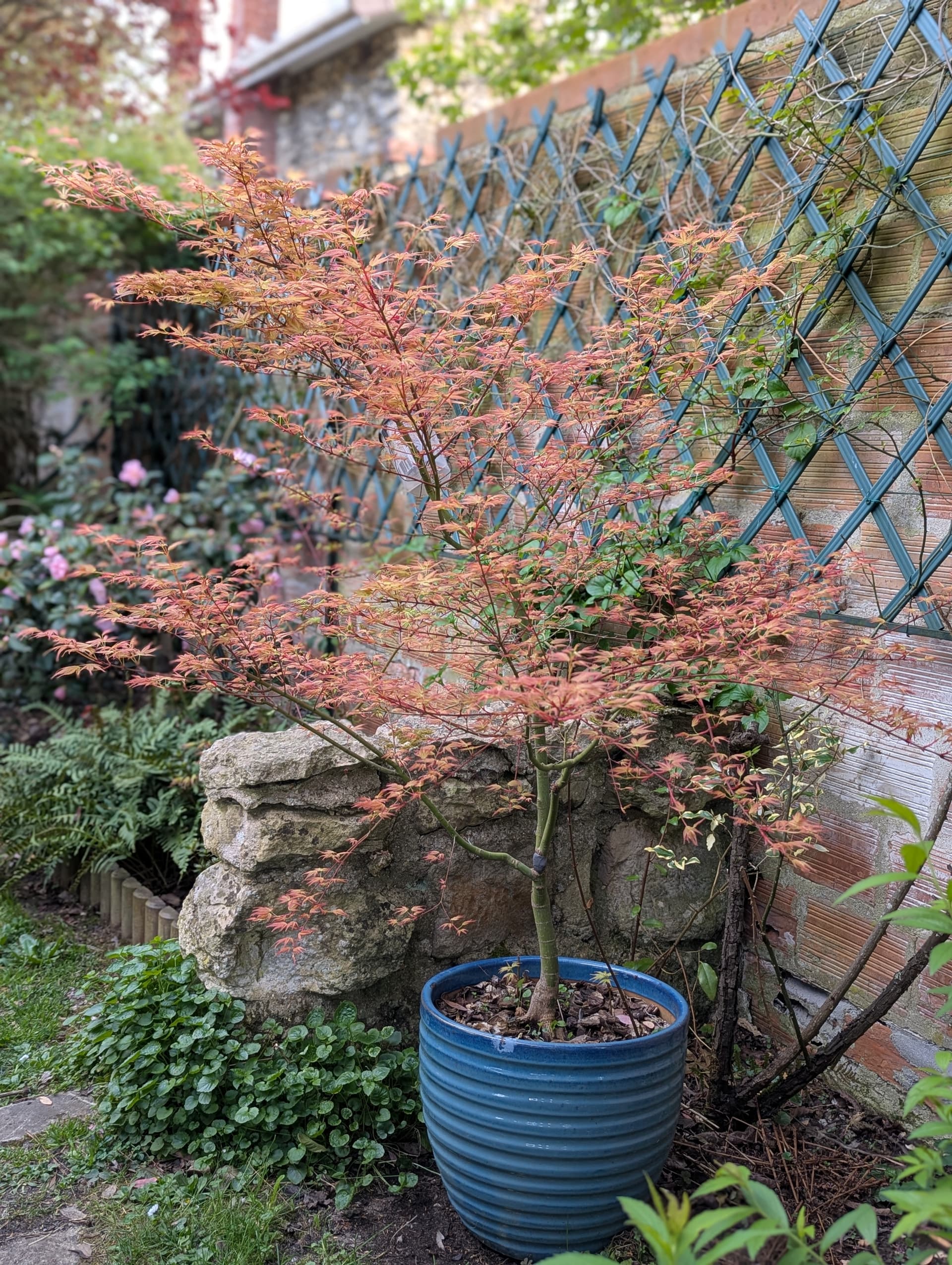 , tout comme le Sango Kaku , un des mikawa et le Koto no ito. Le bloodgood ,Le beni chidori et le shigarami (tjr pas débourré celui la!) sont en gros pots. Des boutures de beni chidori sont en cours , et je penses faire une marcotte du Sango Kaku prochainement ![]()