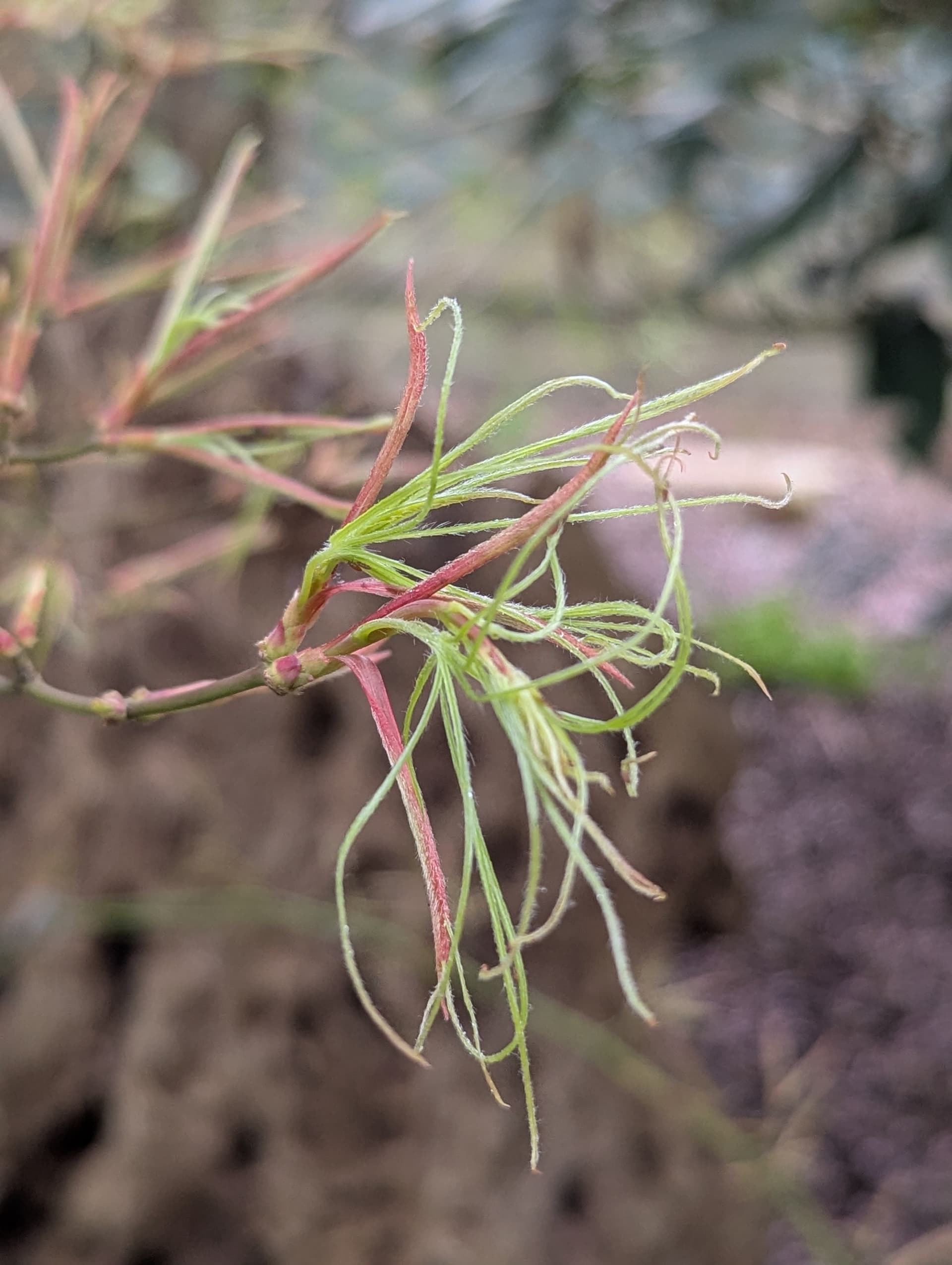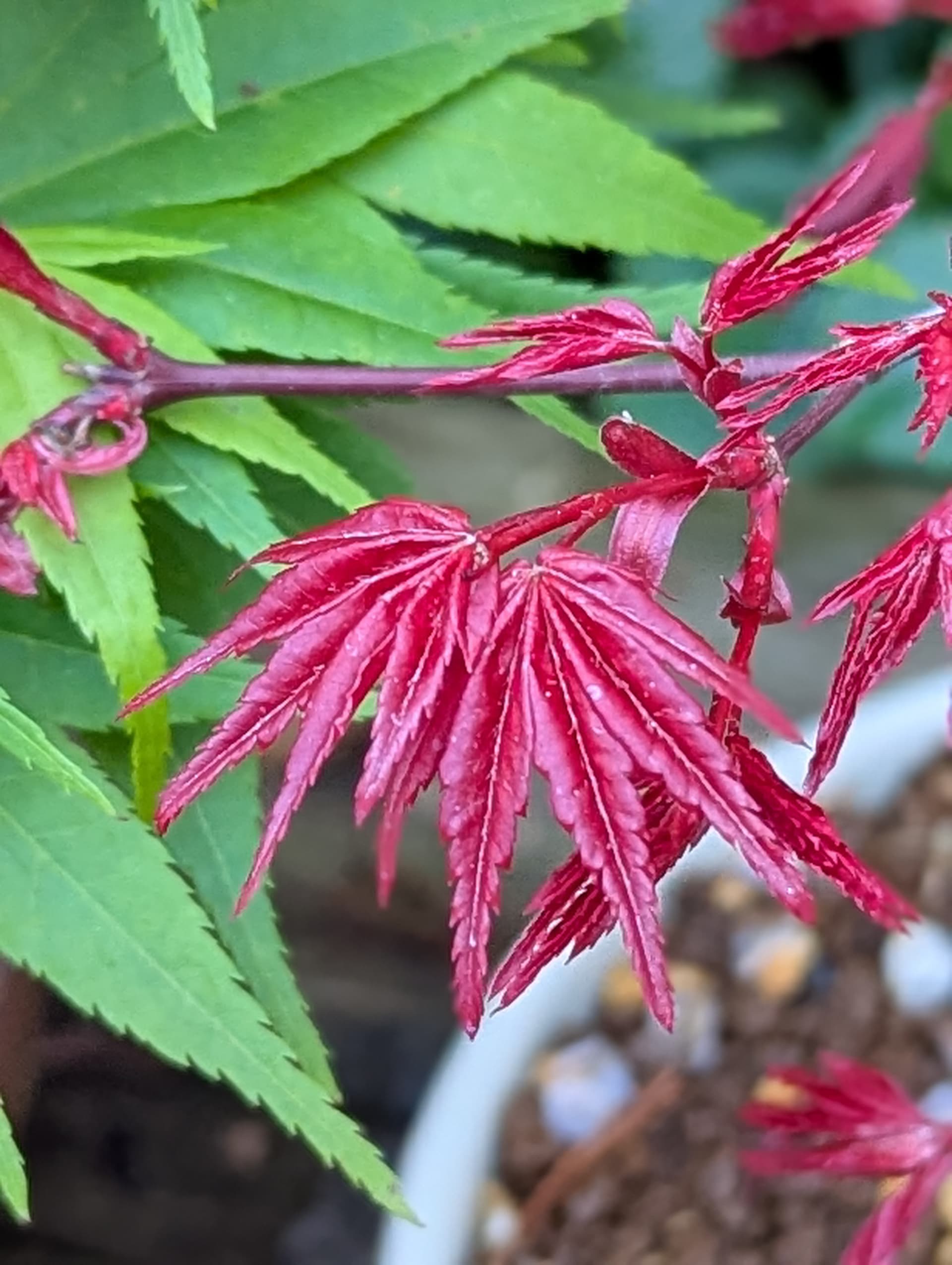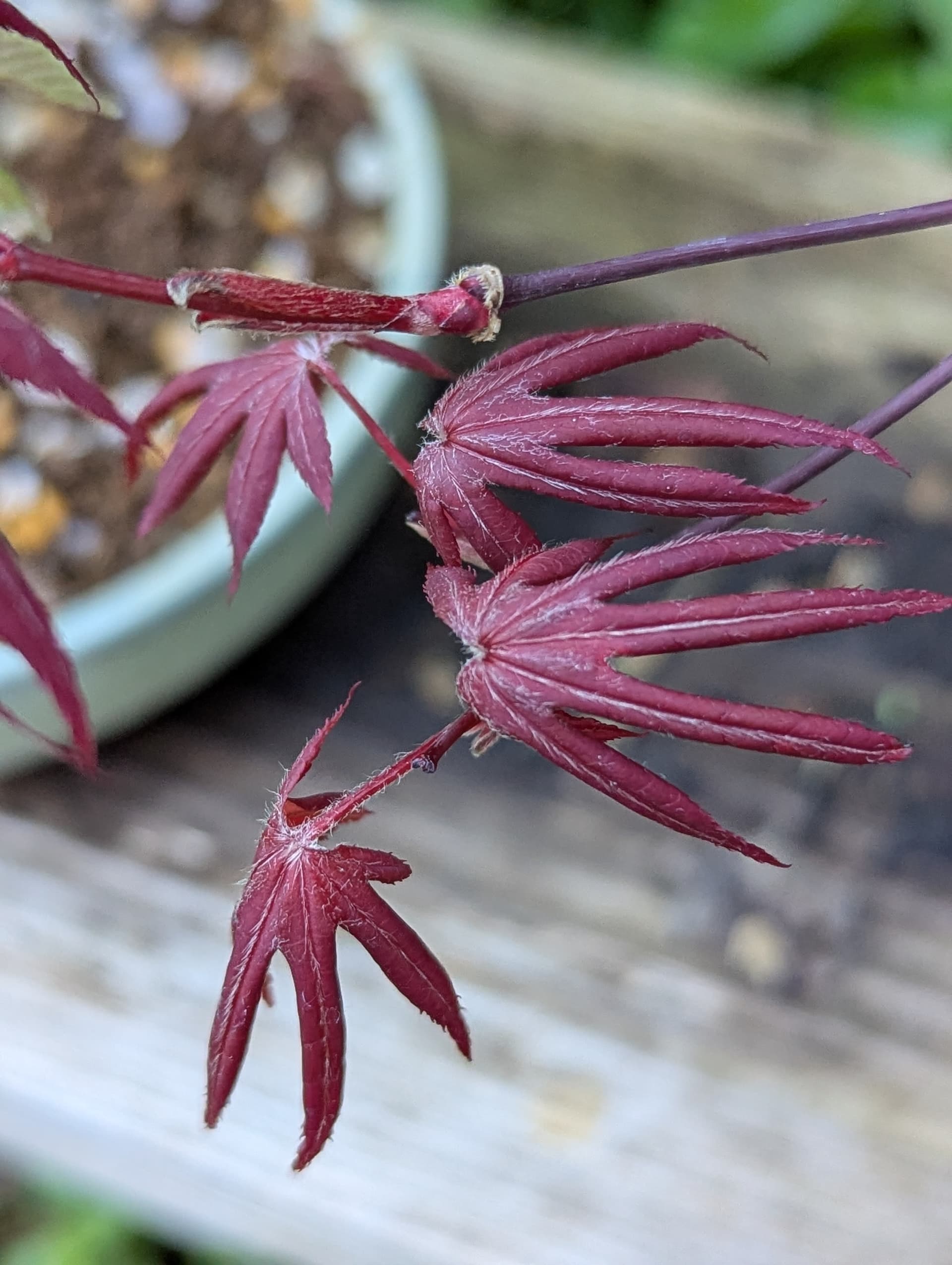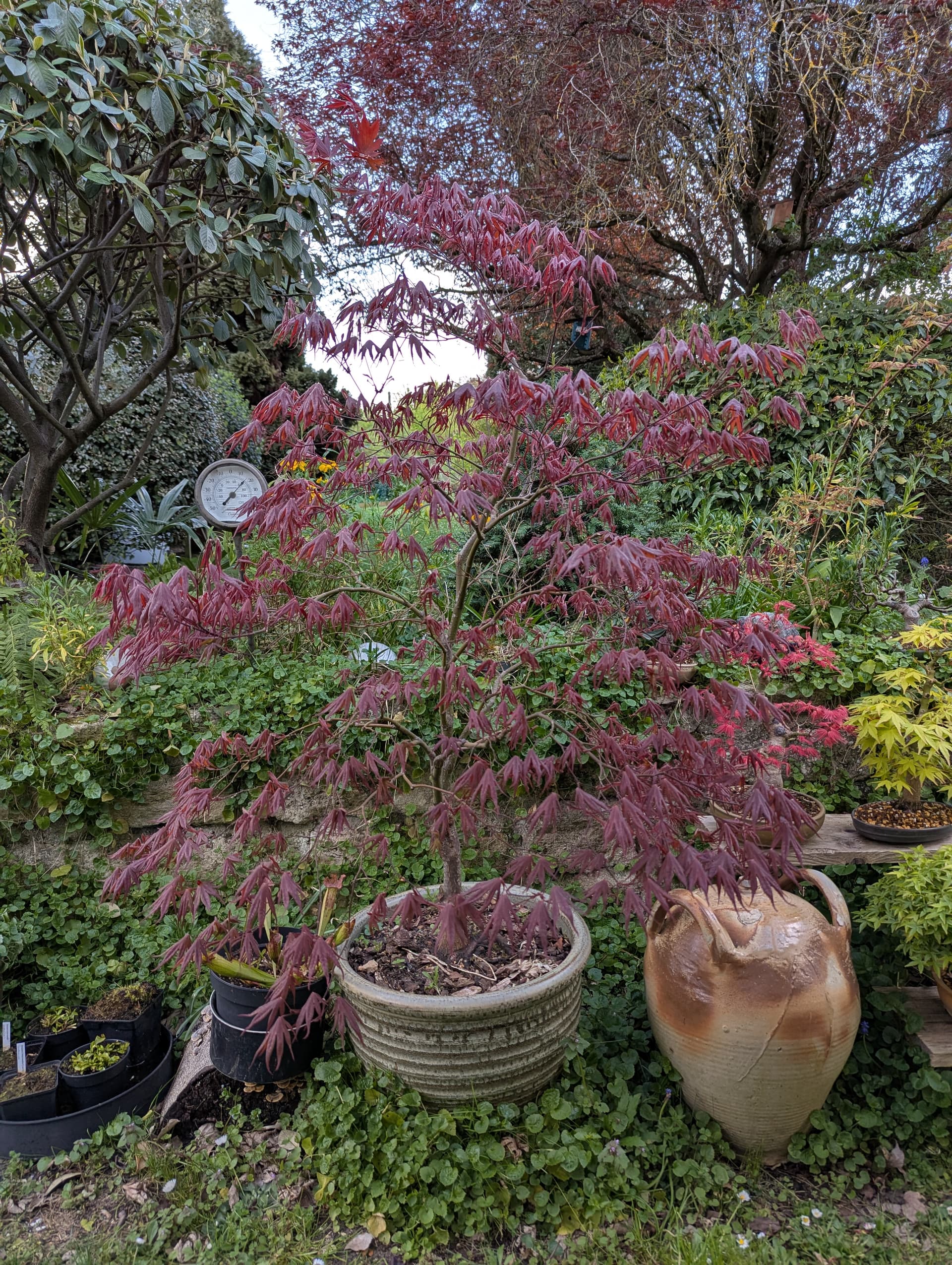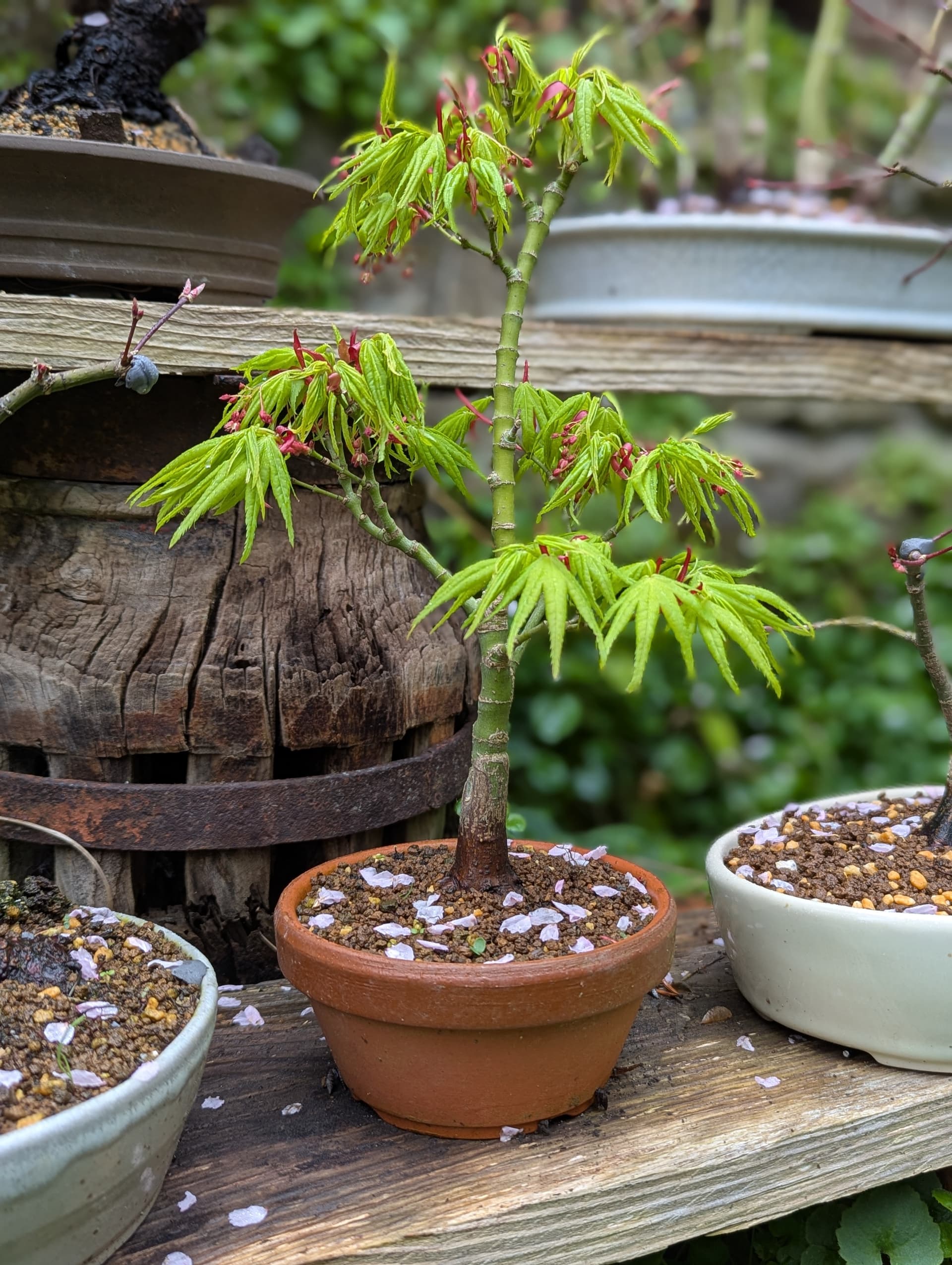 , tout comme le Sango Kaku , un des mikawa et le Koto no ito. Le bloodgood ,Le beni chidori et le shigarami (tjr pas débourré celui la!) sont en gros pots. Des boutures de beni chidori sont en cours , et je penses faire une marcotte du Sango Kaku prochainement ![]()