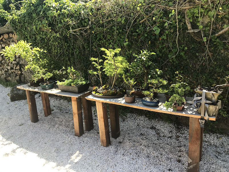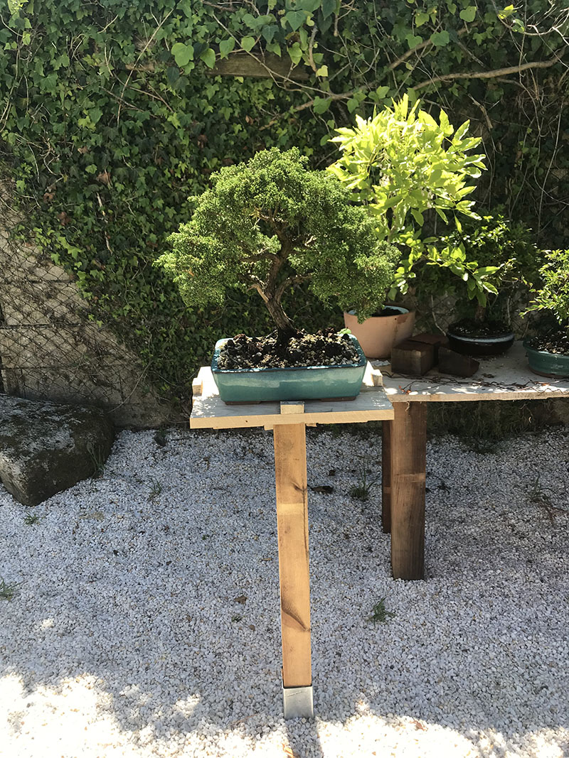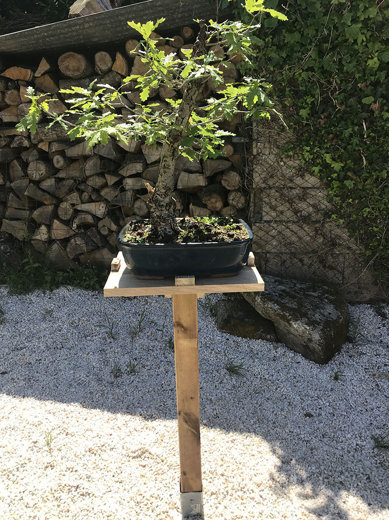 J'ai profiter du long week end pour nettoyer mes arbres et continuer mon petit coin bonsai. Avant cela, mes arbres étaient posés sur une étagère construite en suivant un modèle trouvé ici.