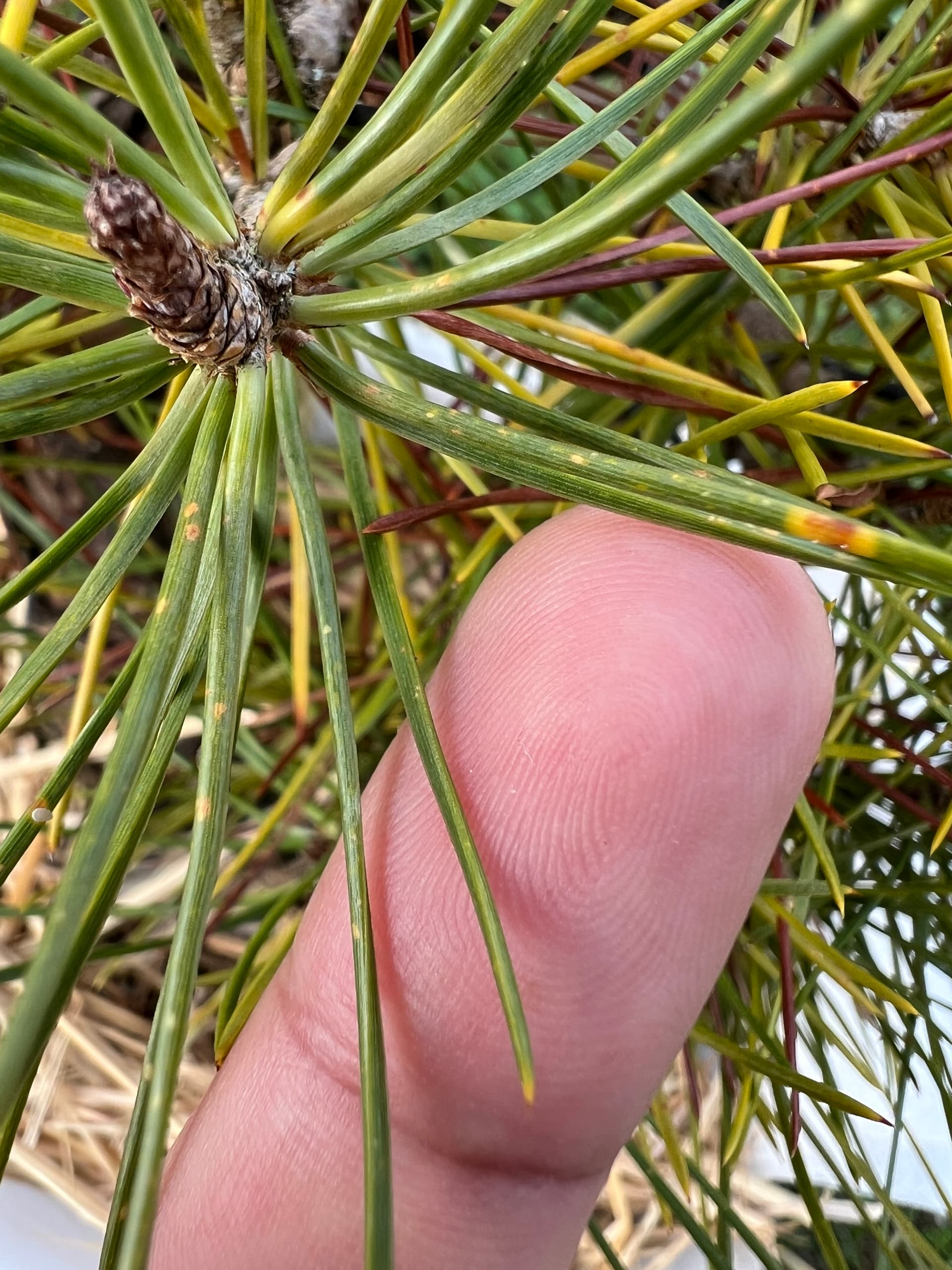 Seul problème se sont les sortes d’araignées rouges dont il était complètement envahi cachées derrière des petits cocons blancs, il me semble qu’elles piquaient les aiguilles et se nourrissaient de la sève j’ai passé des heures à les tuer à la main. Je n’en vois plus on verra au printemps 2025