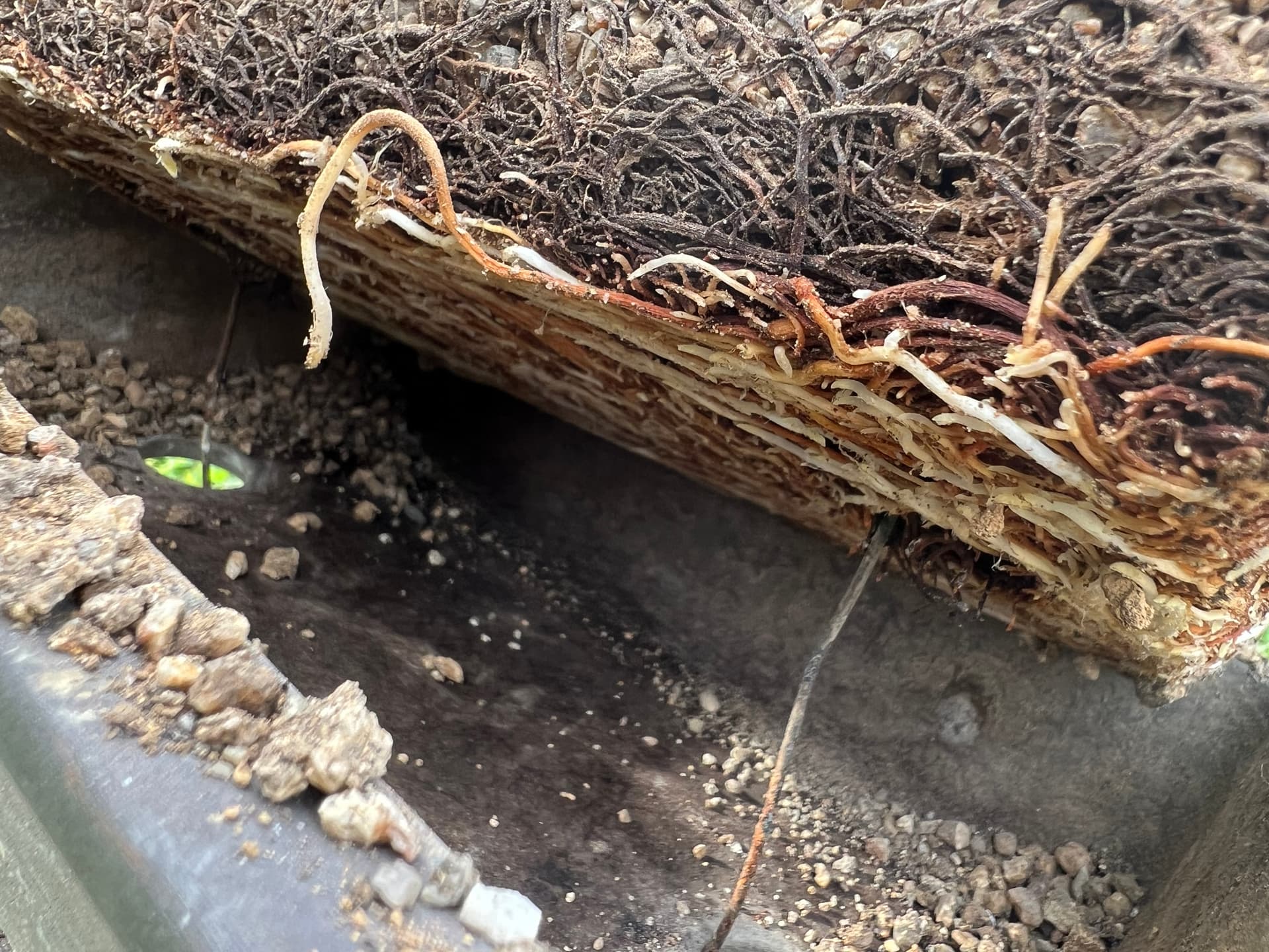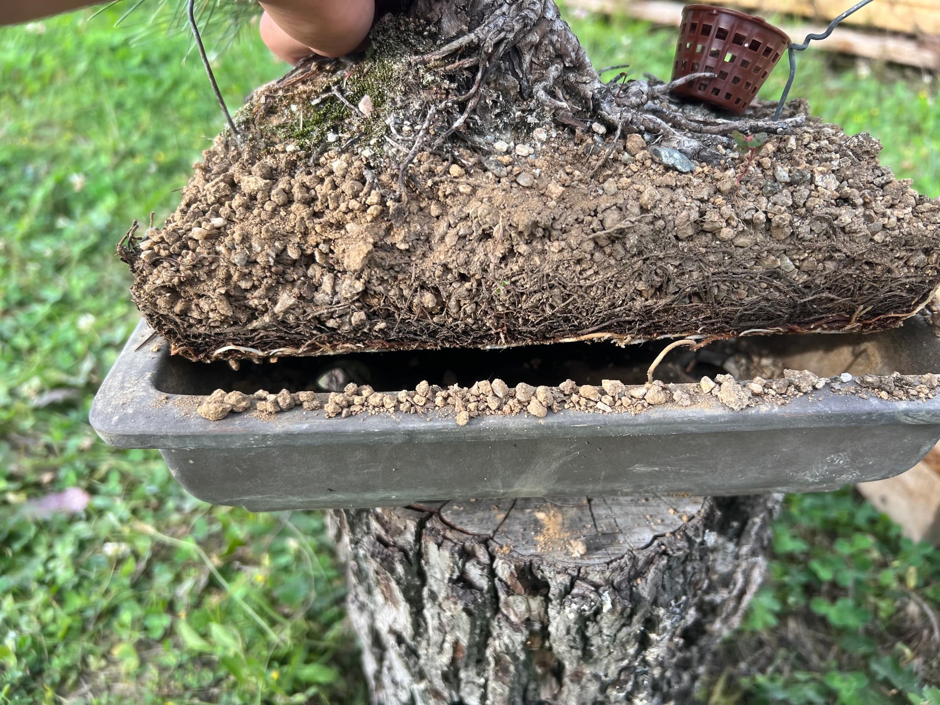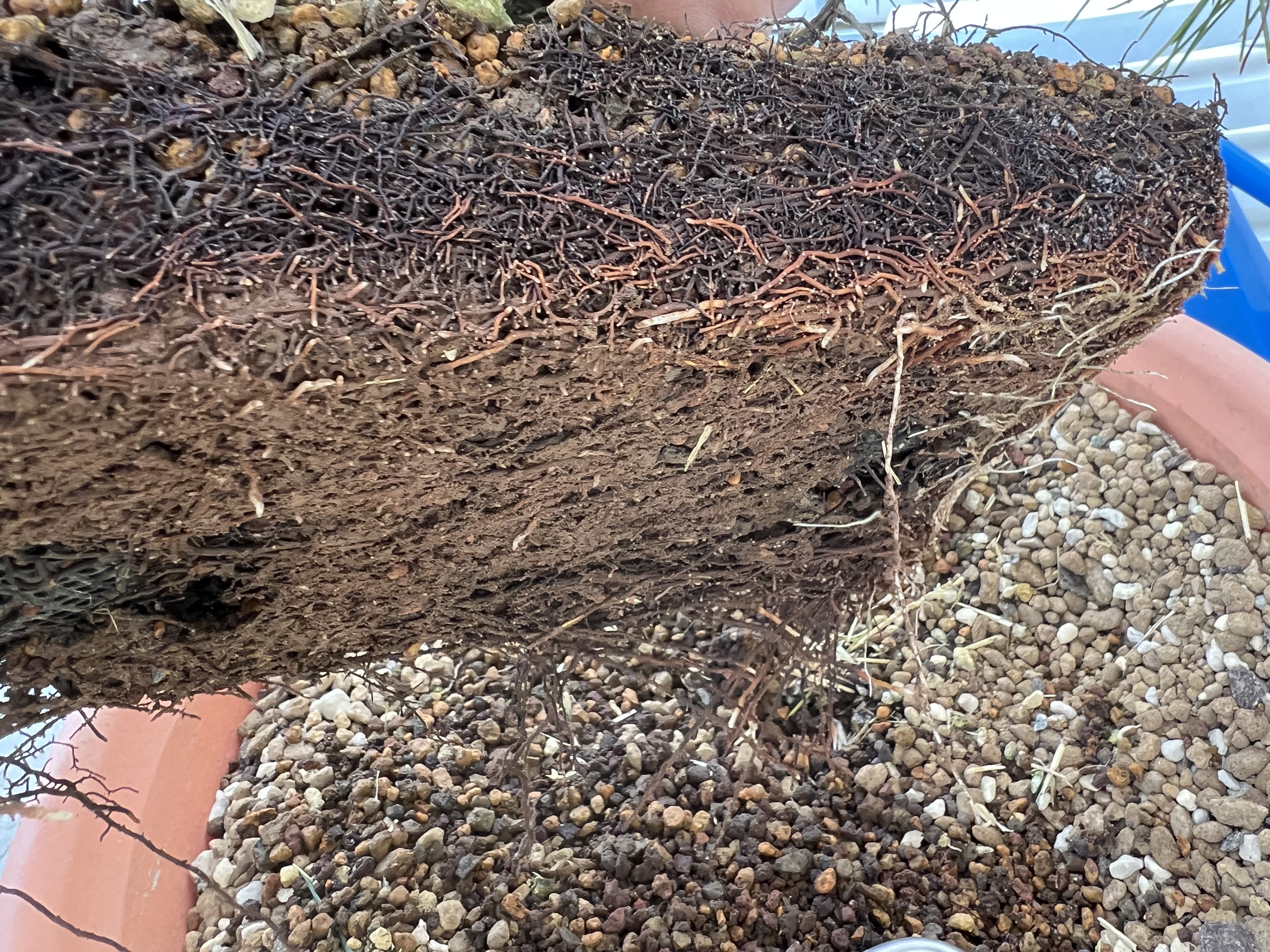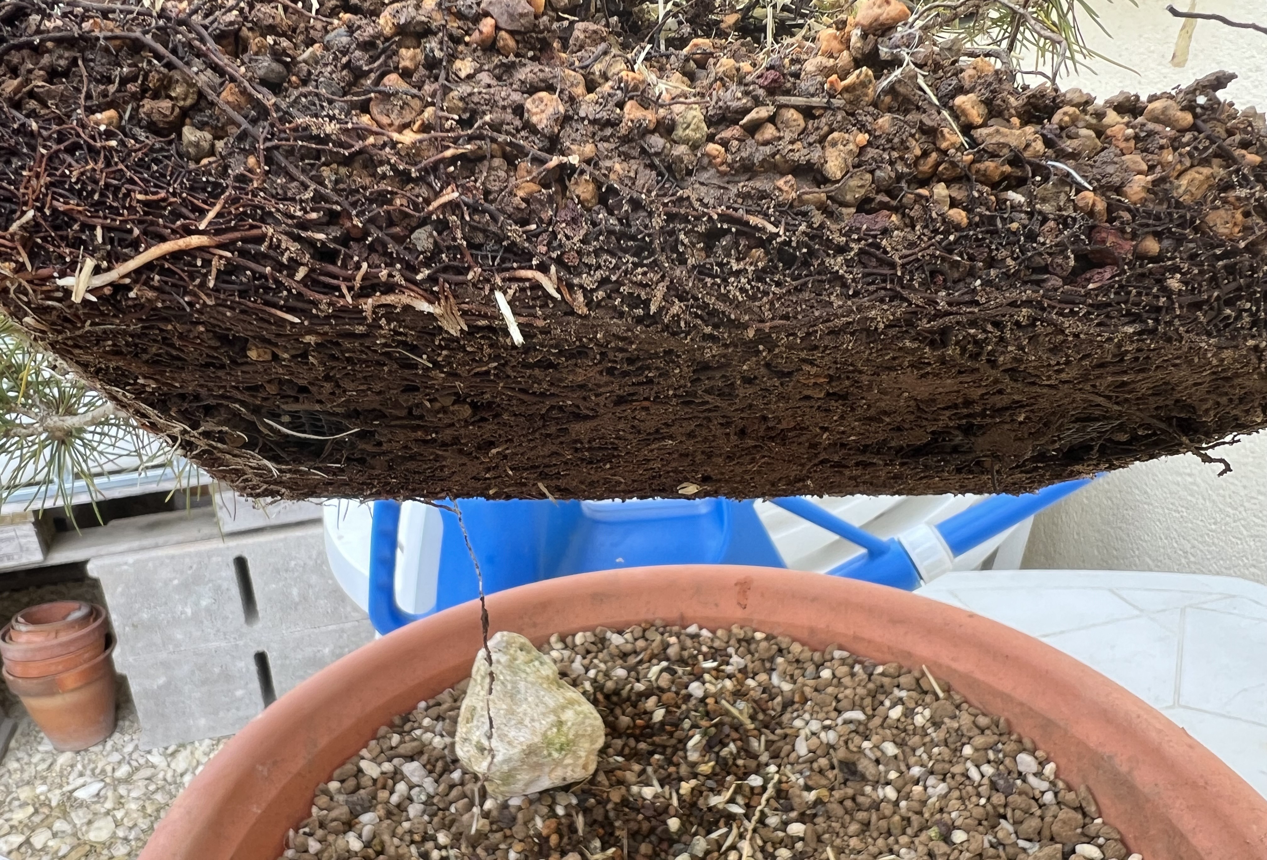 J’attends donc que les bourgeons gonflent et me lance dans son premier rempotage. Je passe beaucoup de temps à démêler les racines je ne me voyais pas les couper tant qu’elles n’étaient pas compléments démêlées (je pense j’aurai dû couper l’épaisseur de racine pour atteindre directement le substrat), ça m’a pris du temps et c’est la que j’ai compris qu’il y avait une grosse couche de racine avant d’atteindre le substrat et les grilles. Je fini le rempotage stressé d’avoir coupé énormément de racine et de m’y être repris plusieurs fois pour le placer correctement. J’en profite pour retirer la mousse et observer son nebari que je trouve moyen.