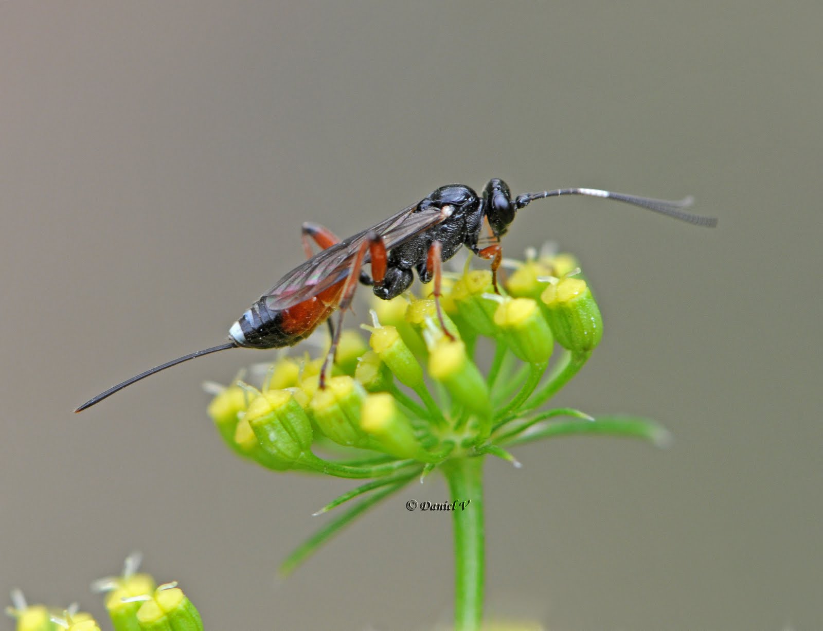 Donc, petite mouche, je dirais 15mm, mais sans l’afirmer,(diptère, ou hyménoptère)noir, très fine, j’ai pas eu le temps de voir si c’était sur le dos du thorax ou de l’abdomen, mais il à du rouge, et donc une longue tarière.