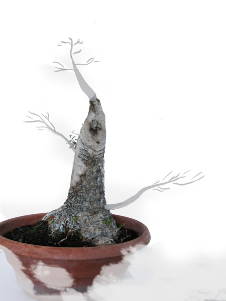 Je reste dans l'idée de laisser tirer la branche qui part vers le haut pour en faire un ten jin. Ya beaucoup de travail de bois mort à faire, mais vu son manque de pêche, j'y touche pas pour le moment.
